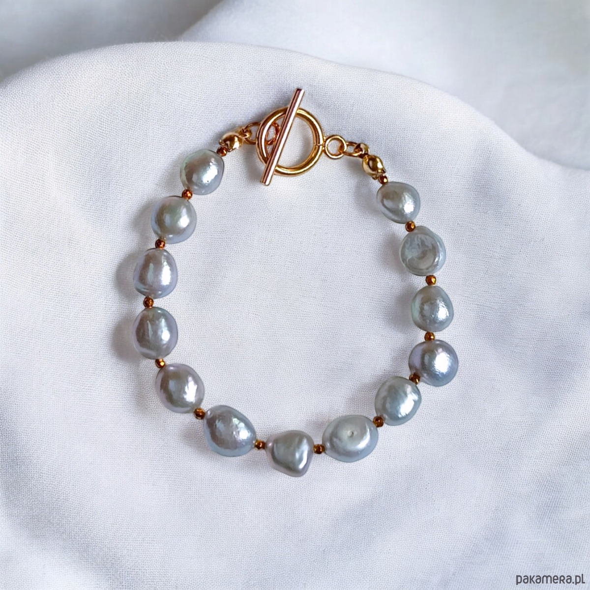 Zjawiskowa bransoletka wykonana z pięknych, mocno nieregularnych pereł naturalnych, słodkowodnych w kolorze SREBRNYM oraz drobniutkich, fasetowanych kuleczek złotego hematytu 1,8mm.