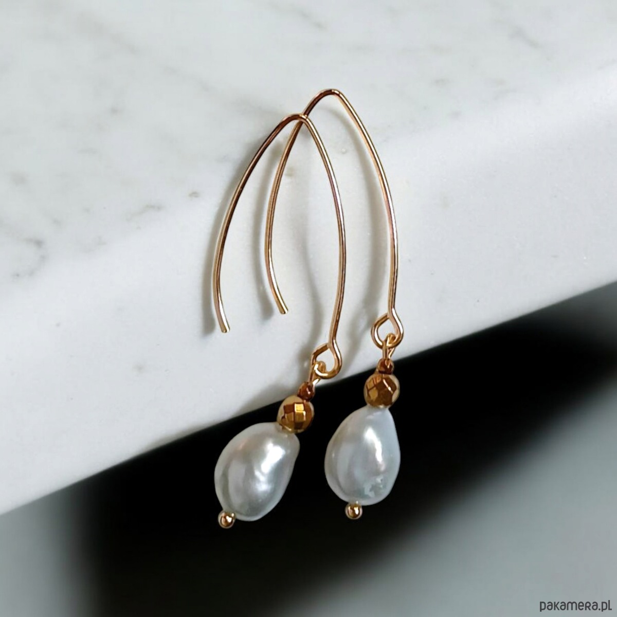 wykonane z pięknych, mocno nieregularnych pereł naturalnych, słodkowodnych w kolorze SREBRNYM oraz fasetowanych kuleczek złotego hematytu 4 i 1,8mm.