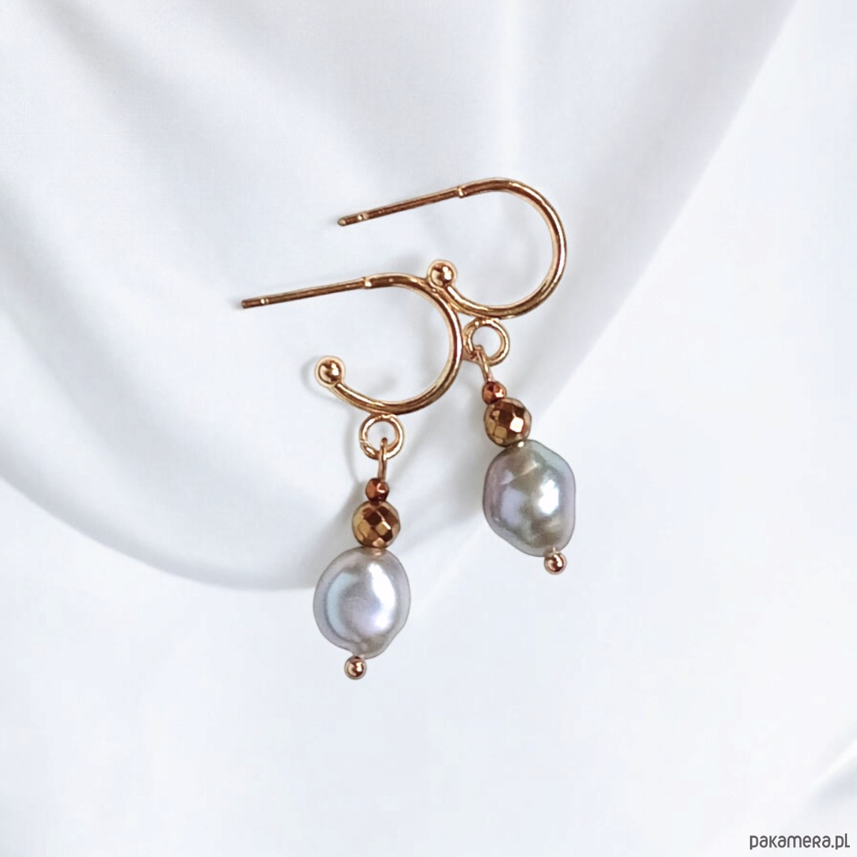 wykonane z pięknych, mocno nieregularnych pereł naturalnych, słodkowodnych w kolorze SREBRNYM oraz fasetowanych kuleczek złotego hematytu 4 i 1,8mm.