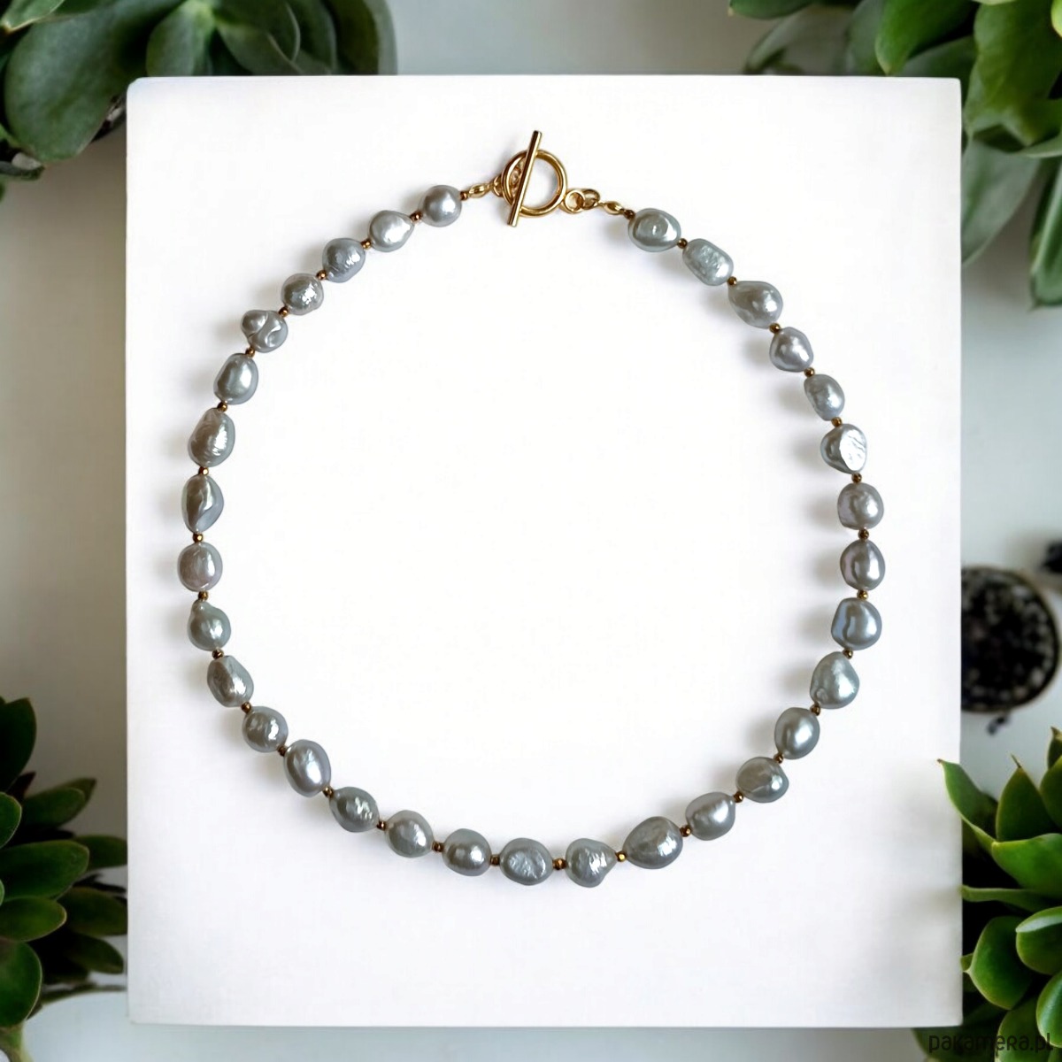 Zjawiskowy naszyjnik - kolia wykonana z pięknych, mocno nieregularnych pereł naturalnych, słodkowodnych w kolorze SREBRNYM oraz drobniutkich, fasetowanych kuleczek złotego hematytu 1,8mm.