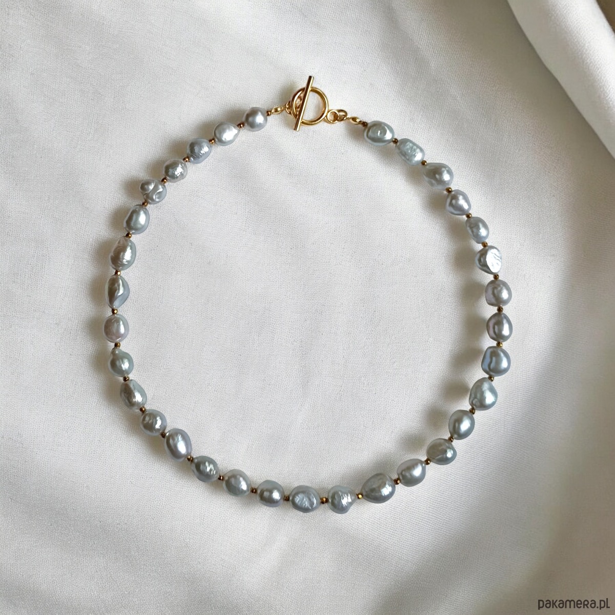 Zjawiskowy naszyjnik - kolia wykonana z pięknych, mocno nieregularnych pereł naturalnych, słodkowodnych w kolorze SREBRNYM oraz drobniutkich, fasetowanych kuleczek złotego hematytu 1,8mm.