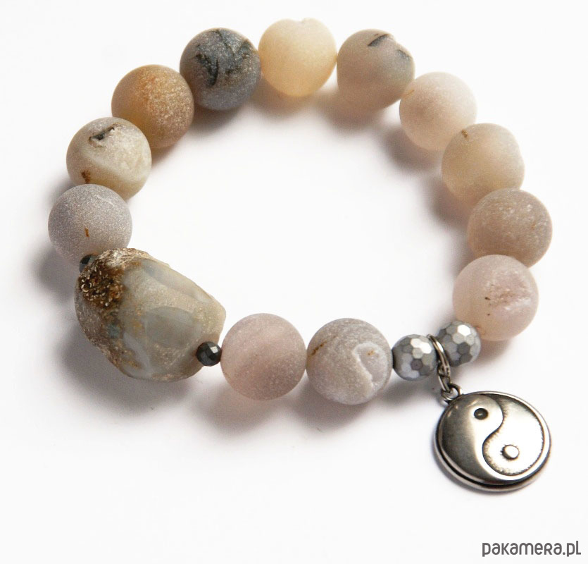piękna, zjawiskowa, BARDZO MASYWNA bransoletka na solidnej, podwójnej lince elastycznej, wykonana z MATOWEGO, lekko chropowatego agatu druzy (DUŻE kule 14mm); masywnej zawieszki ze stali szlachetnej(nie uczula, kolor nie ściera się) oraz nieregularnej, miejscami matowej bryły agatu (ok.25x20mm), umieszczonej pomiędzy dwoma kuleczkami matowego hematytu;
