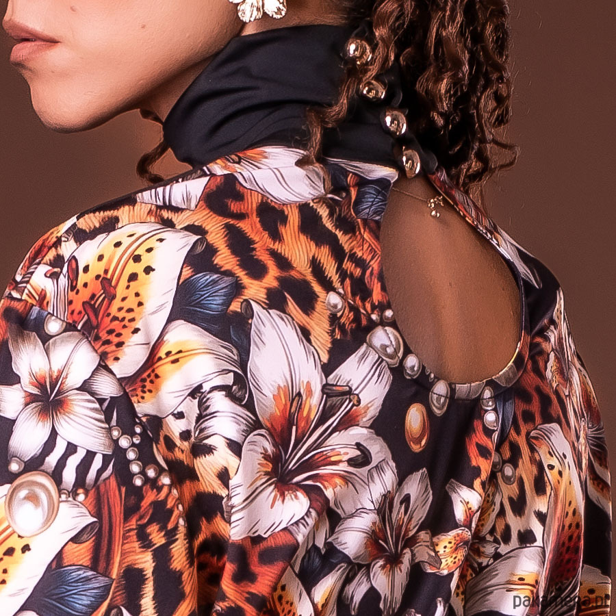 Stylowa bluzka o luźniejszym fasonie, który subtelnie otula sylwetkę, zapewniając komfort noszenia bez efektu opinania ciała. Charakterystycznym elementem jest golf zapinany z tyłu na złote, ręcznie naszywane guziki, dodający nuty szyku i oryginalności. Rękawy zakończone mankietami, również zapinanymi na guziki, nadają całości eleganckiego i dopracowanego wyglądu.