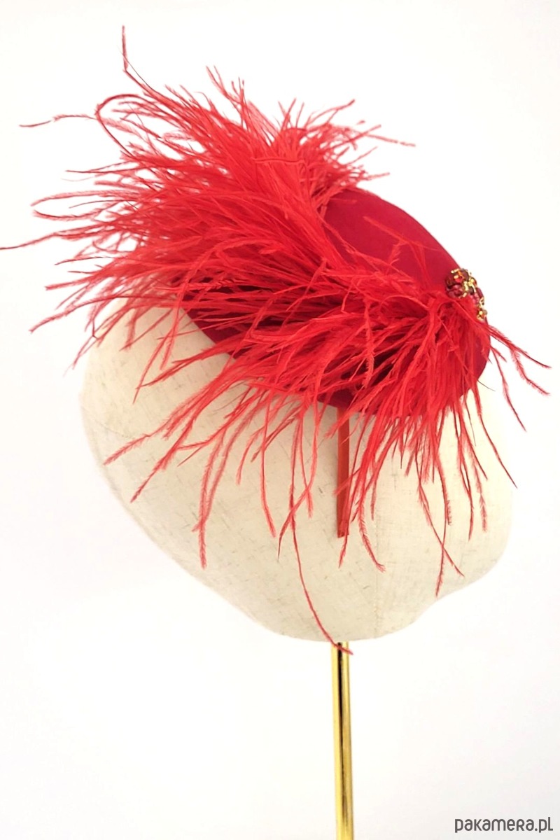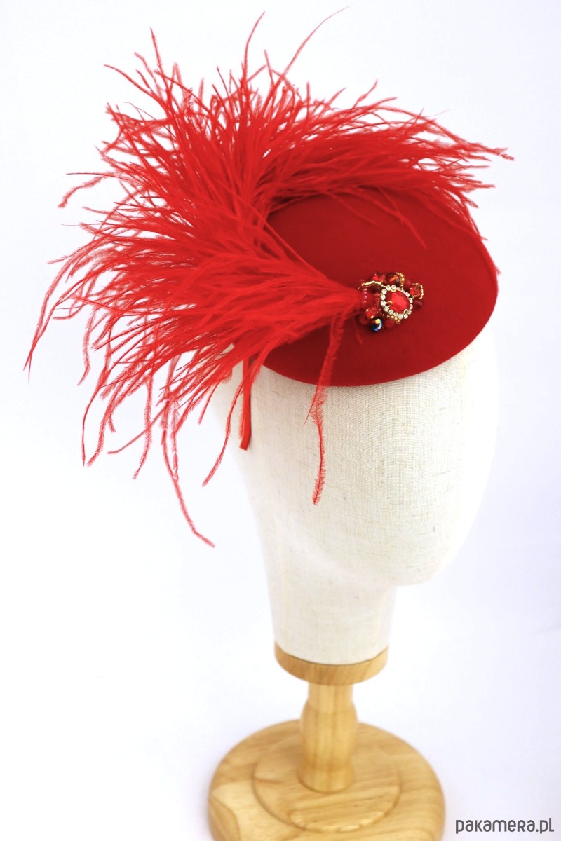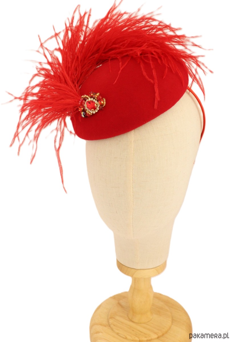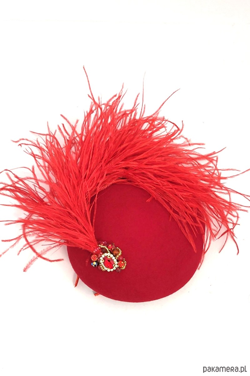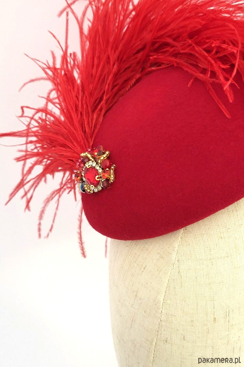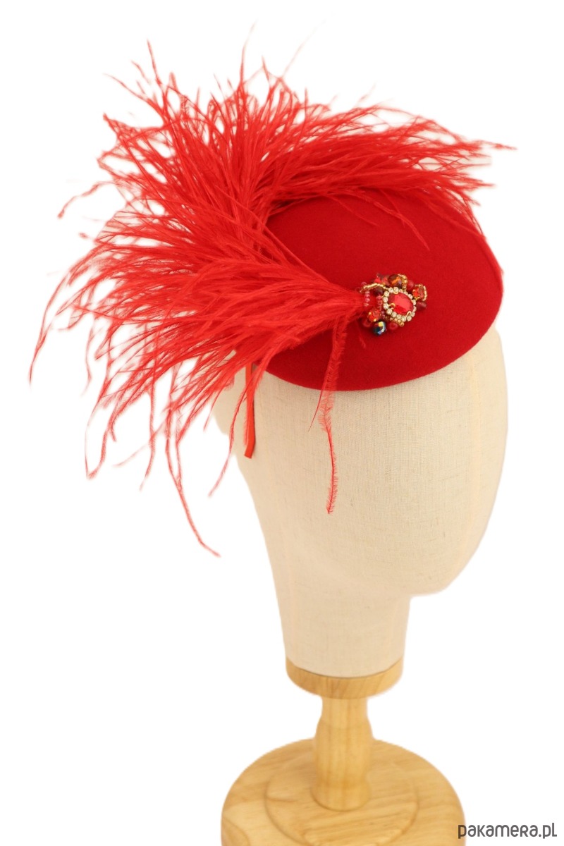 Materiały: Podstawa toczka wykonana z miękkiego, wysokiej jakości filcu, zapewniającego komfort noszenia. Ozdobiony jest bujnym pióropuszem z naturalnych piór w kolorze żywej czerwieni oraz misternie naszywanymi koralikami i kryształkami, które pięknie odbijają światło.