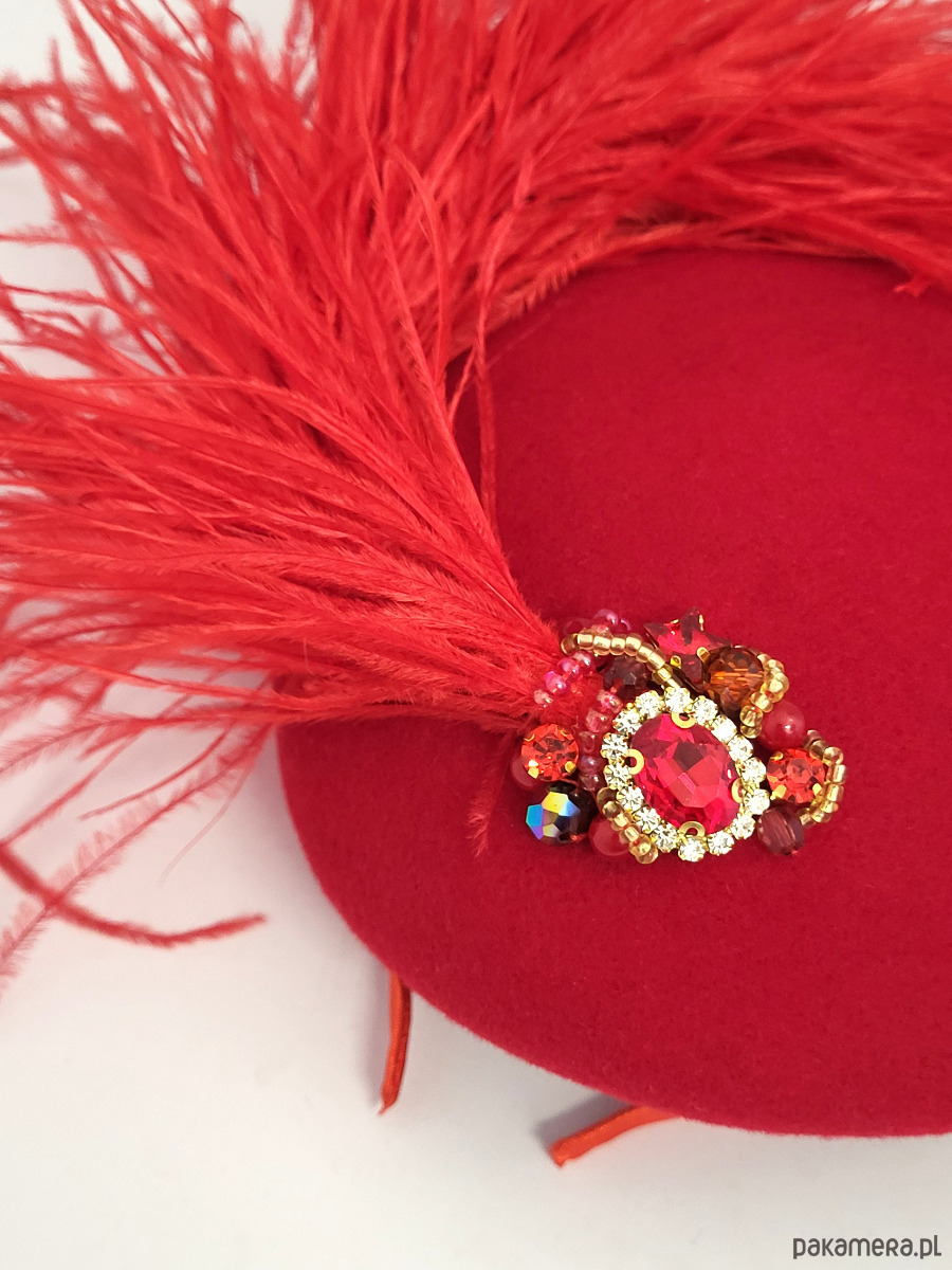Kolorystyka: Głęboki odcień czerwieni toczka i piór, uzupełniony o wielobarwne koraliki, tworzy spójną i luksusową kompozycję.