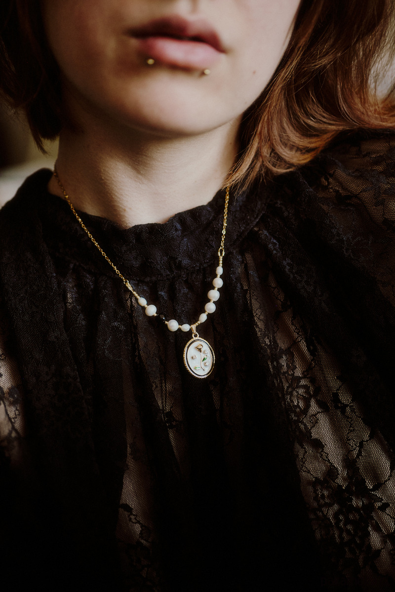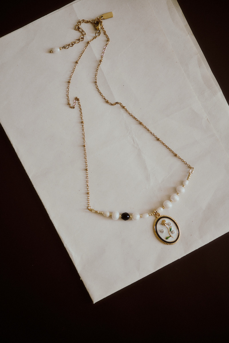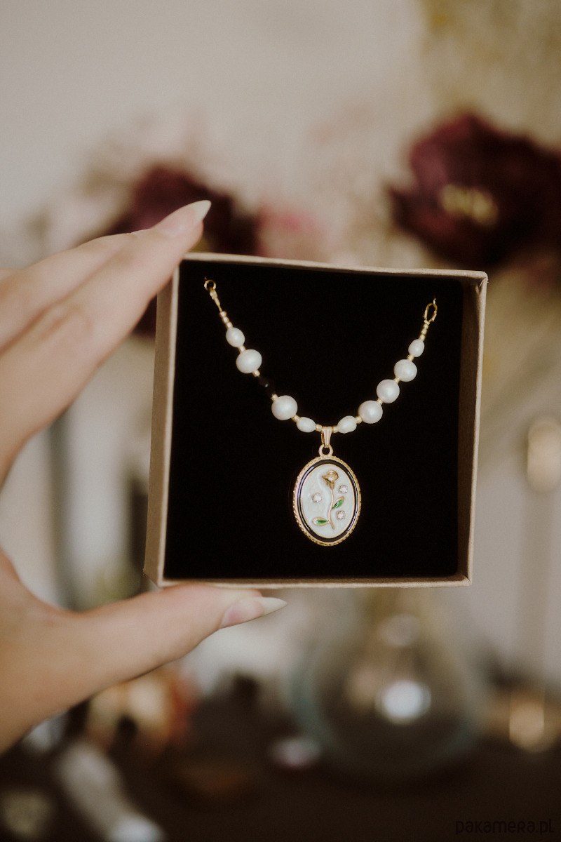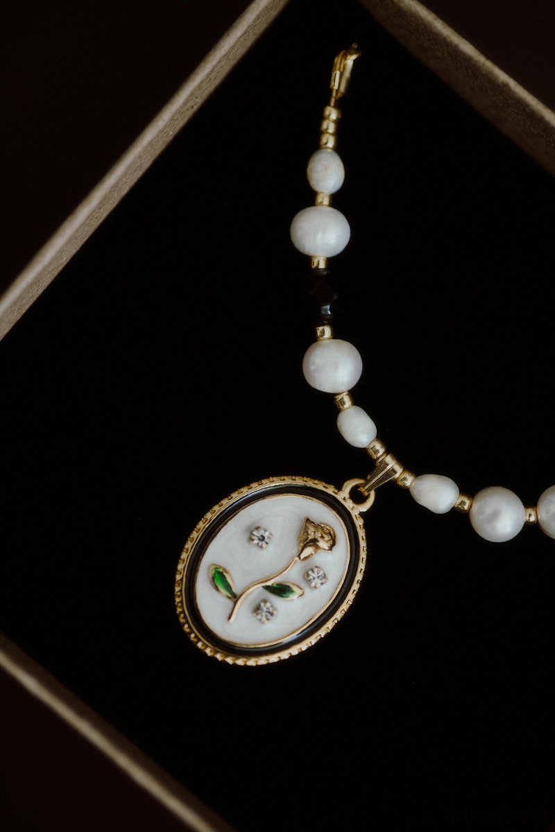 Naszyjnik składa się z naturalnych pereł, czarnego szklanego koralika i medalionu z różą. Ponadczasowa klasyka ale przełamana nowoczesną asymetrią. Dawniej uważano, że perły zapewniają ochronę noszącemu, a także przyciągają szczęście i bogactwo. Przez wieki perły były zarezerwowane tylko dla monarchów i arystokracji. Dziś dostępne są dla każdego i to niezależnie od stylu ubioru, co udowadnia nasza perłowa kolekcja.