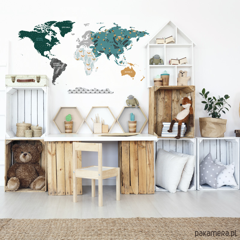 W pierwszym pokoju naszego dziecka nie może zabraknąć kolorowych naklejek, a najlepiej jeśli te naklejki pełnią dodatkowo funkcję poznawczą. My bardzo polecamy mapę świata od marki YOKO DESIGN. Wszystkie produkty marki są autorskimi pomysłami, które wprowadzą nasze pociechy w magiczny i kolorowy świat. Każdy kontynent to ferria barw i wzorów, co dodatkowo zaciekawi nasze dziecko. Mapa doskonale sprawdzi się jako element dekoracyjny, a w późniejszym etapie jako element edukacyjny. Nam dorosłym nauka kontynentów kojarzy się jedynie z książkowym atlasem świata lub globusem. Dziś możemy to narzędzie zastąpić pięknymi naklejkami na ścianę i łączyć przyjemne z pożytecznym.