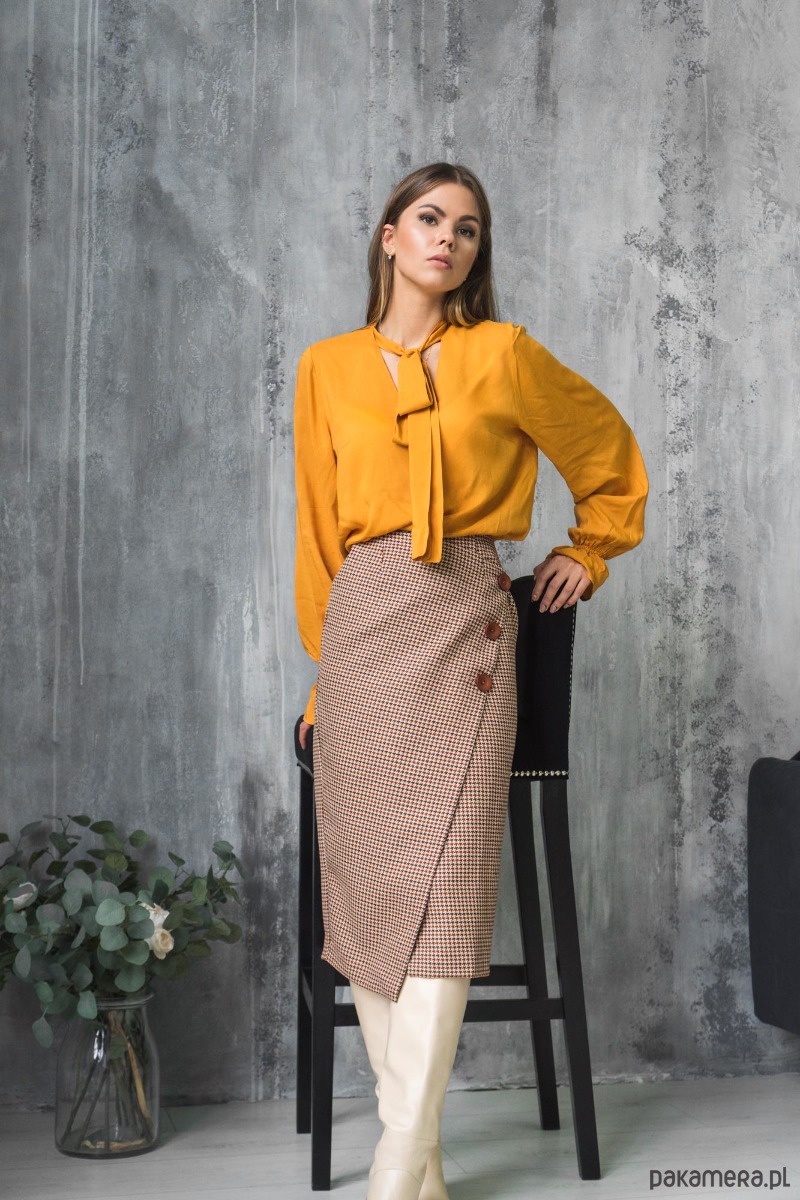 Kolejna propozycja to spódnica ołówkowa długości midi w beżową pepitkę od marki Mirons Wear zrzesza nowoczesne kobiety, które dążą do pięknego wyglądu, stawiając na komfort i jakość wybranej odzieży. Spódnice o długości midi są bardzo uniwersalne, już dawno przestały się kojarzyć z grzecznymi lookami. Prosty krój spódnicy świetnie się odnajdzie w jesiennym looku. Spódnica Adele o asymetrycznym fasonie posiada po lewej stronie trzy duże guziki, a także jeden mały kryty po prawej stronie. Model ma wysoki stan. Pięknie wydłuży nogi, dzięki użyciu zabiegu z kozakami, ale również można ją wystylizować z trampkami, dzięki czemu nabierze dziewczęcego charakteru. W połączeniu z koszulą tworzy zestaw idealny, ale pamiętajmy, że moda to zabawa, dlatego można ją również dobrać do oversizowej kurtki bomberki:)