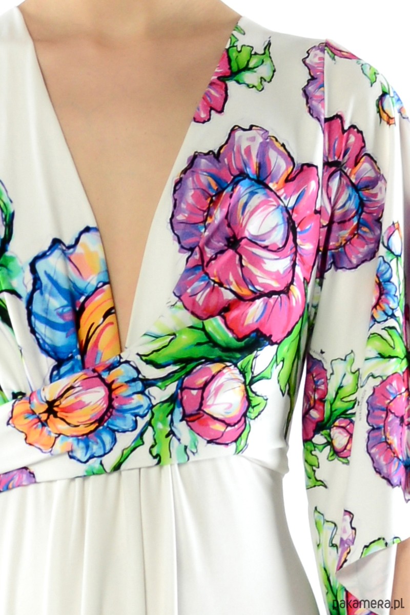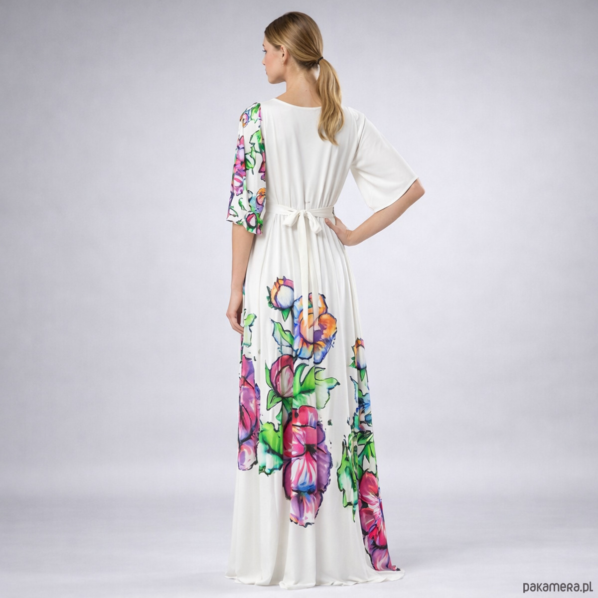 Suknia maxi o wysmuklającym fasonie. Głęboki dekolt, subtelne marszczenia zebrane w talii delikatną draperią, maskują niedoskonałości jednocześnie podkreślając to, co najlepsze w kobiecej sylwetce. Miękka linia sukni, zwiewny dół z koła i szerokie rękawy nadają jej lekkości i elegancji. Fason nawiązuje do lat 70-tych. Autorski print inspirowany malarstwem zalipiańskim nadaje sukni niepowtarzalnego charakteru.