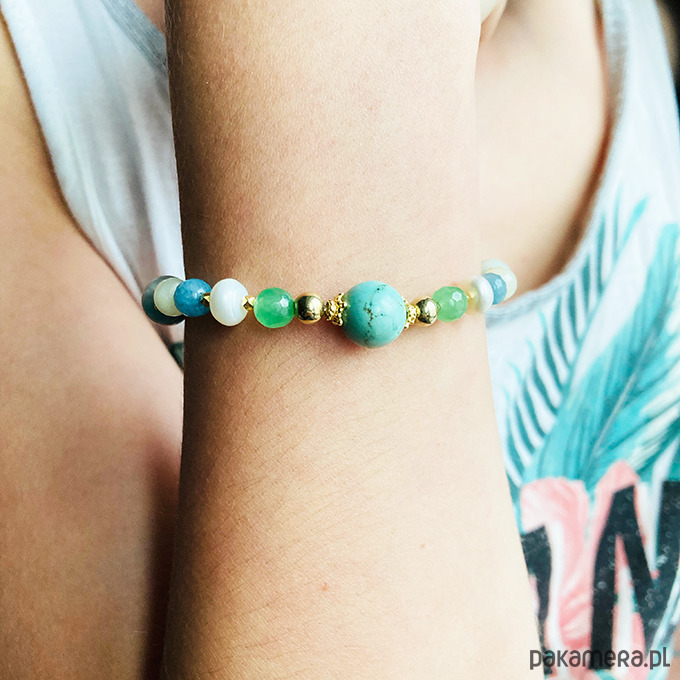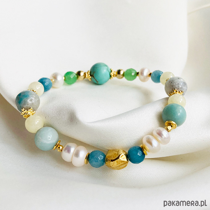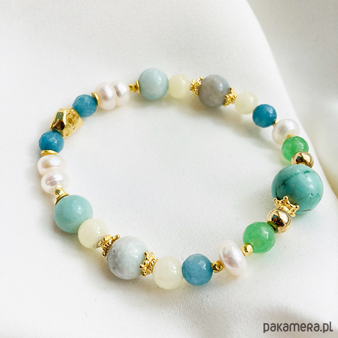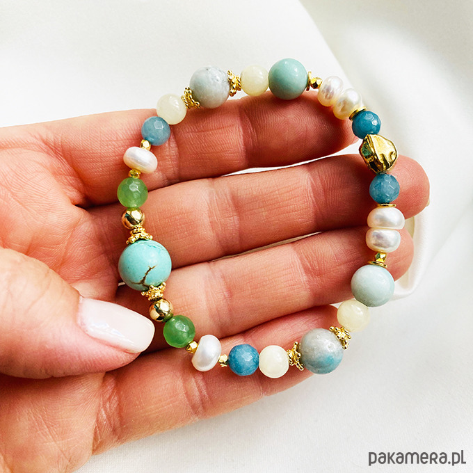 MAGIA Elegancka Bransoletka z kamieni , Amazonit, jadeit, perły złoto