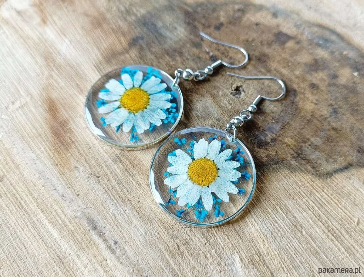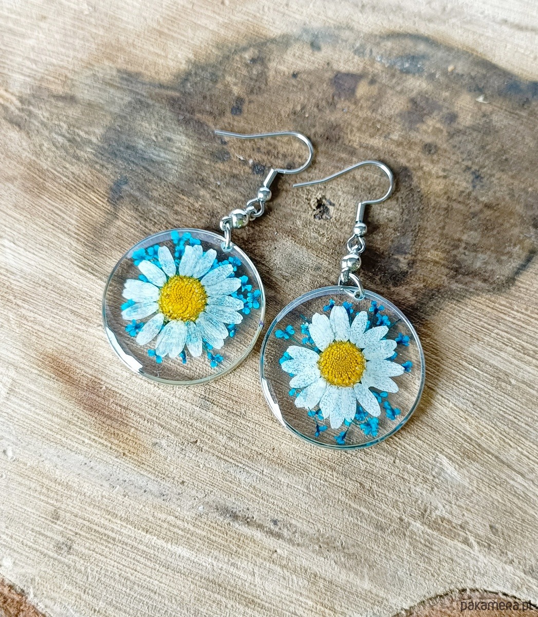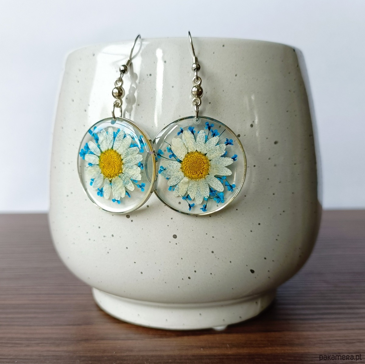 Unikatowe kolczyki, prezentujące piękne połączenie suszonych kwiatów oraz żywicy epoksydowej.