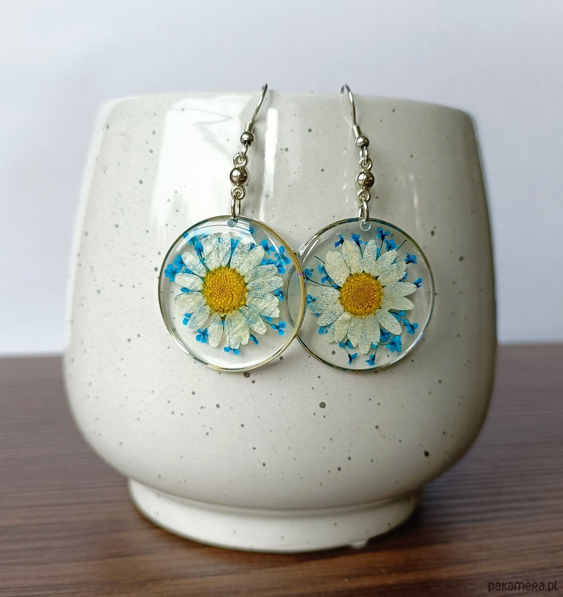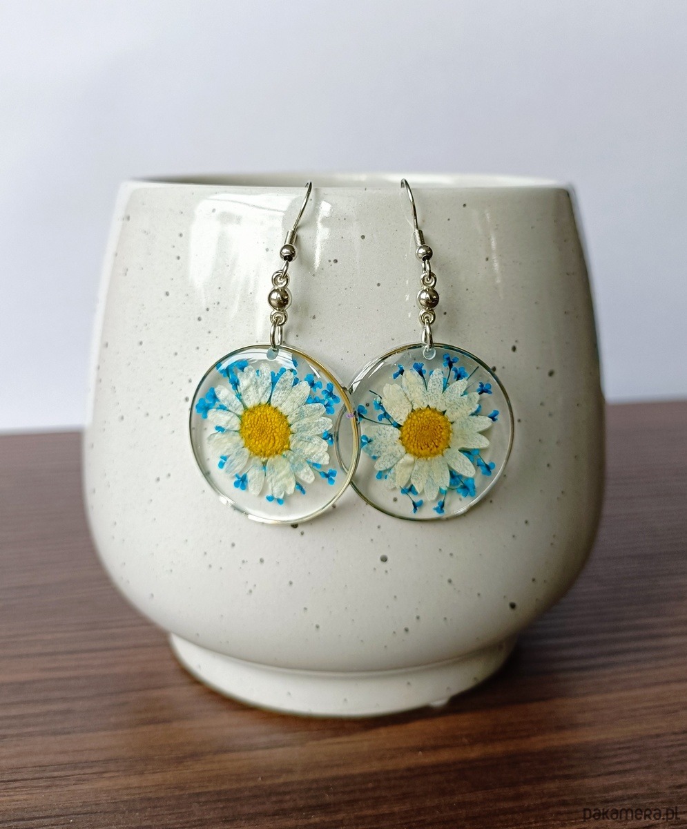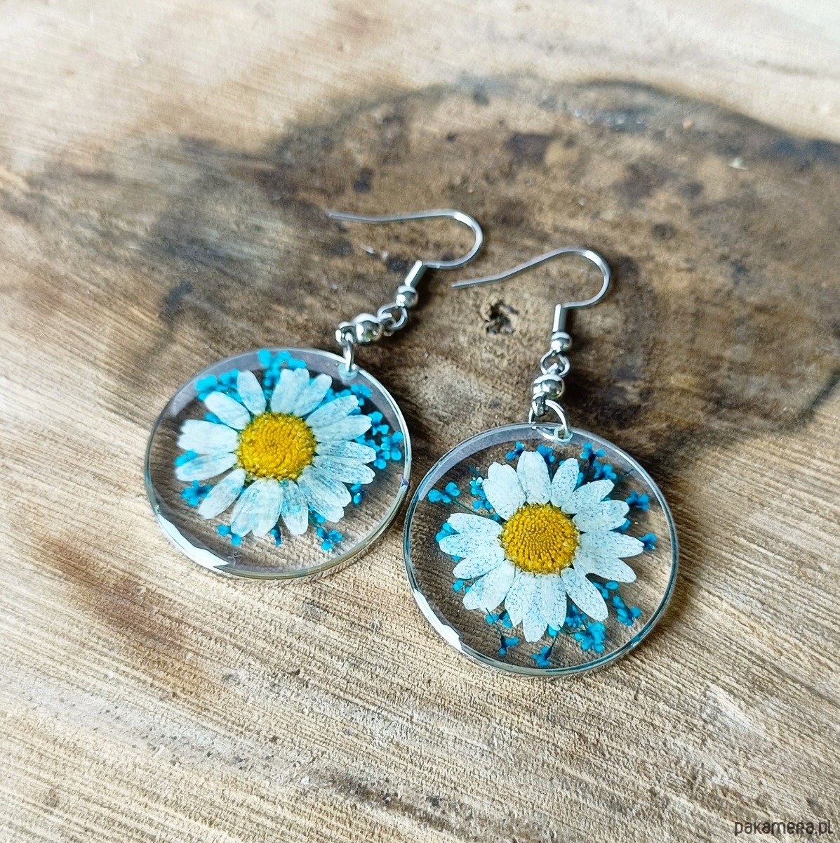 Unikatowe kolczyki, prezentujące piękne połączenie suszonych kwiatów oraz żywicy epoksydowej.