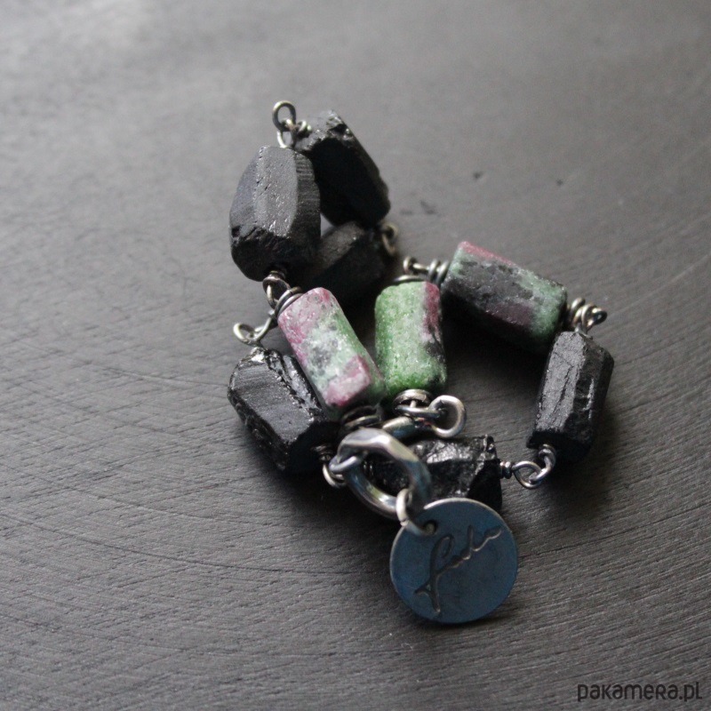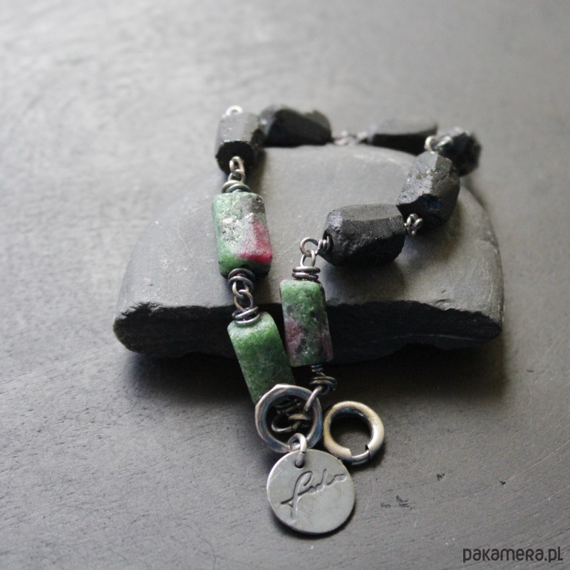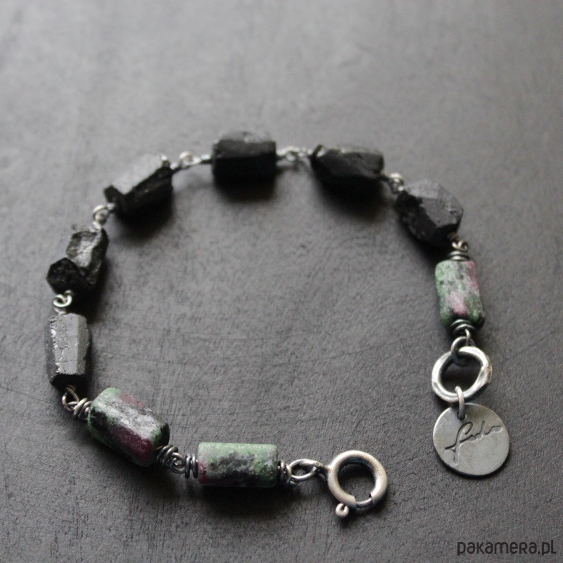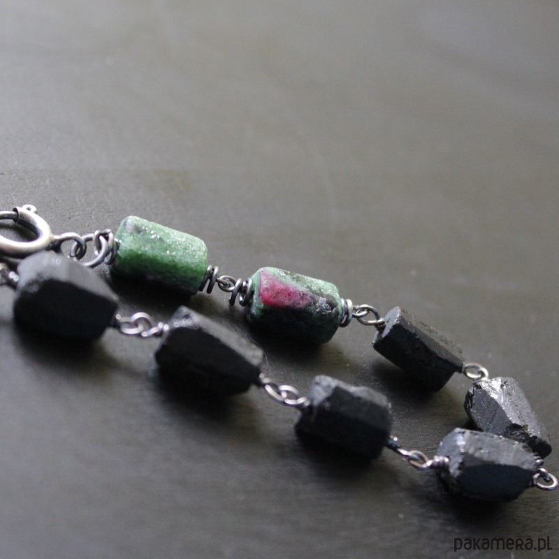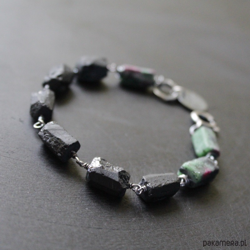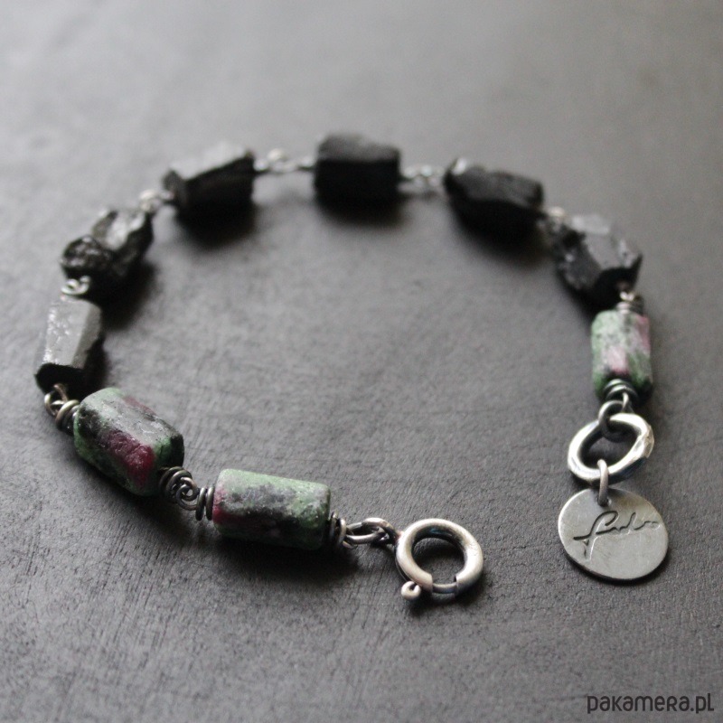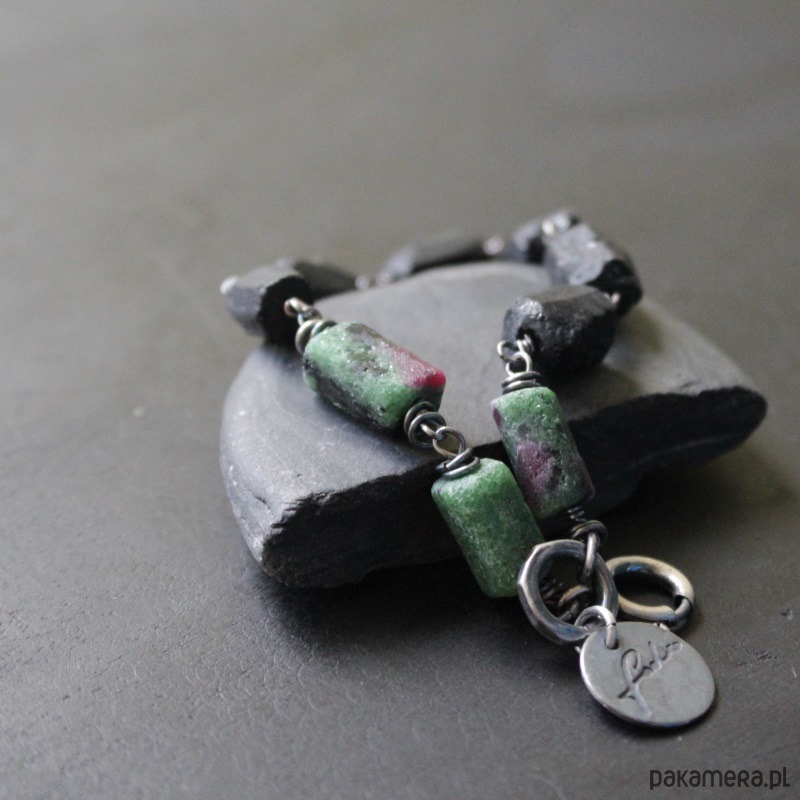 Bransoletka wykonana została z oksydowanego srebra próby 925, pięknych bryłek zoisydu z rubinem oraz czarnego turmalinu wielkości 0,9-1 cm.