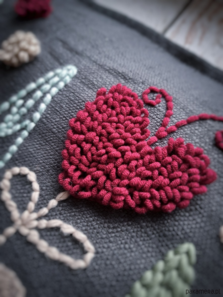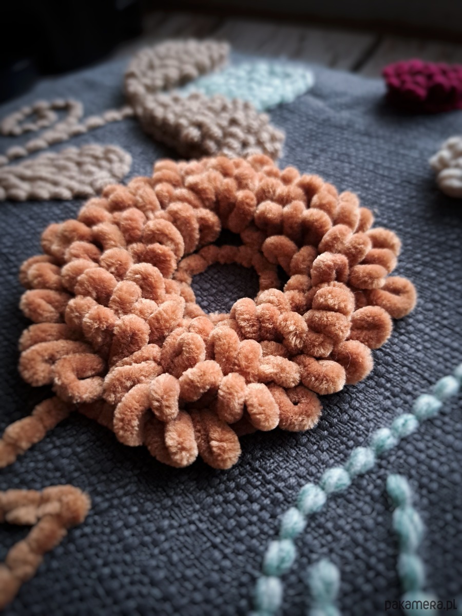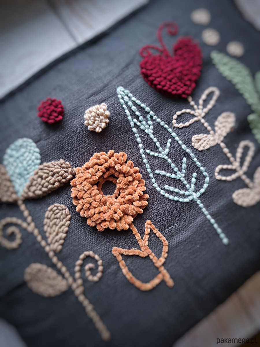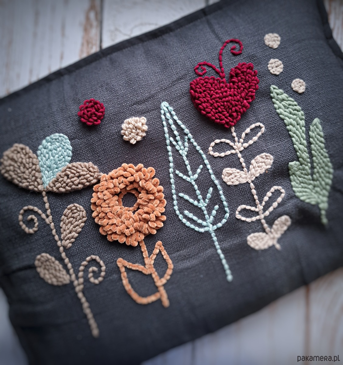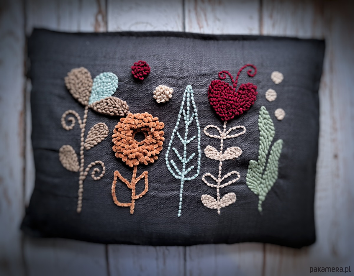 Ręcznie wykonana poduszka w technice punch needle, w ciepłych kolorach.