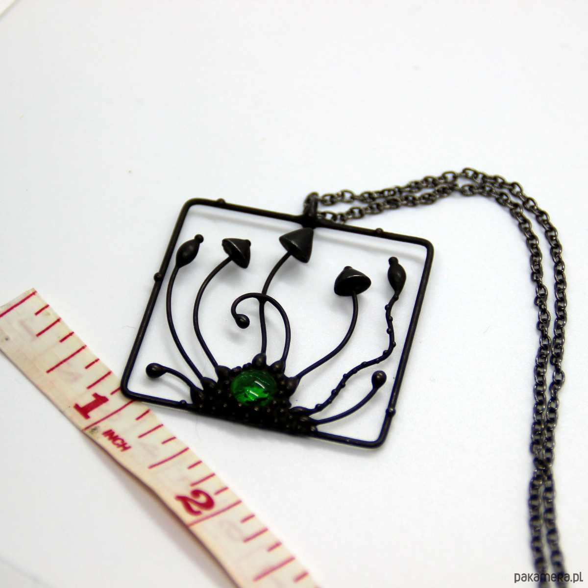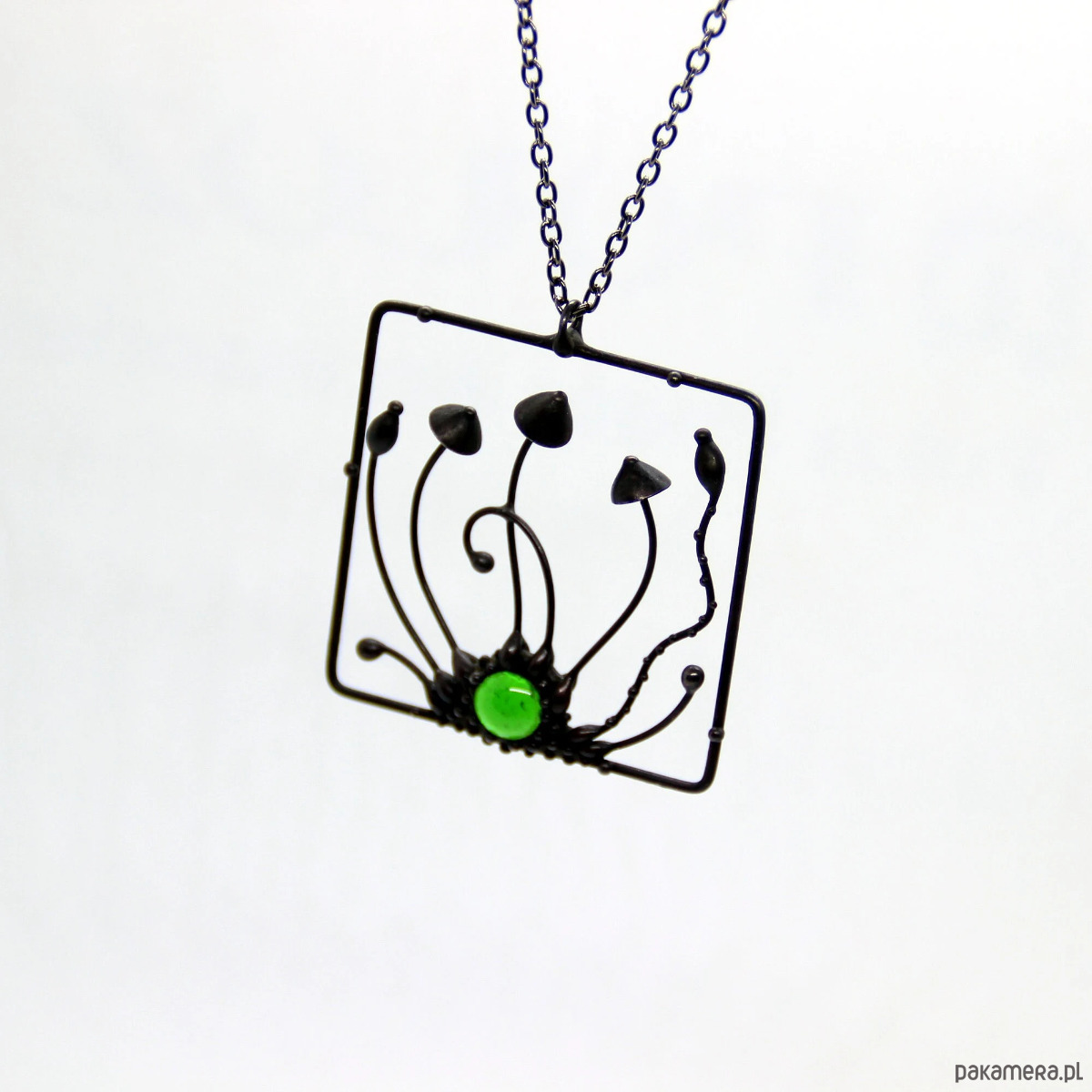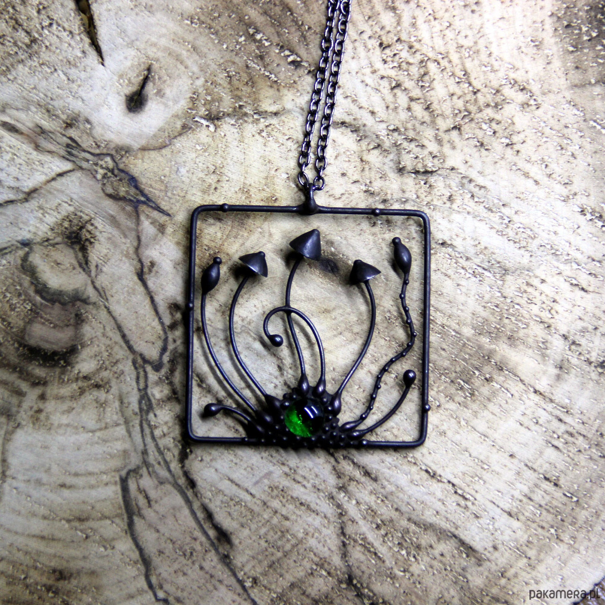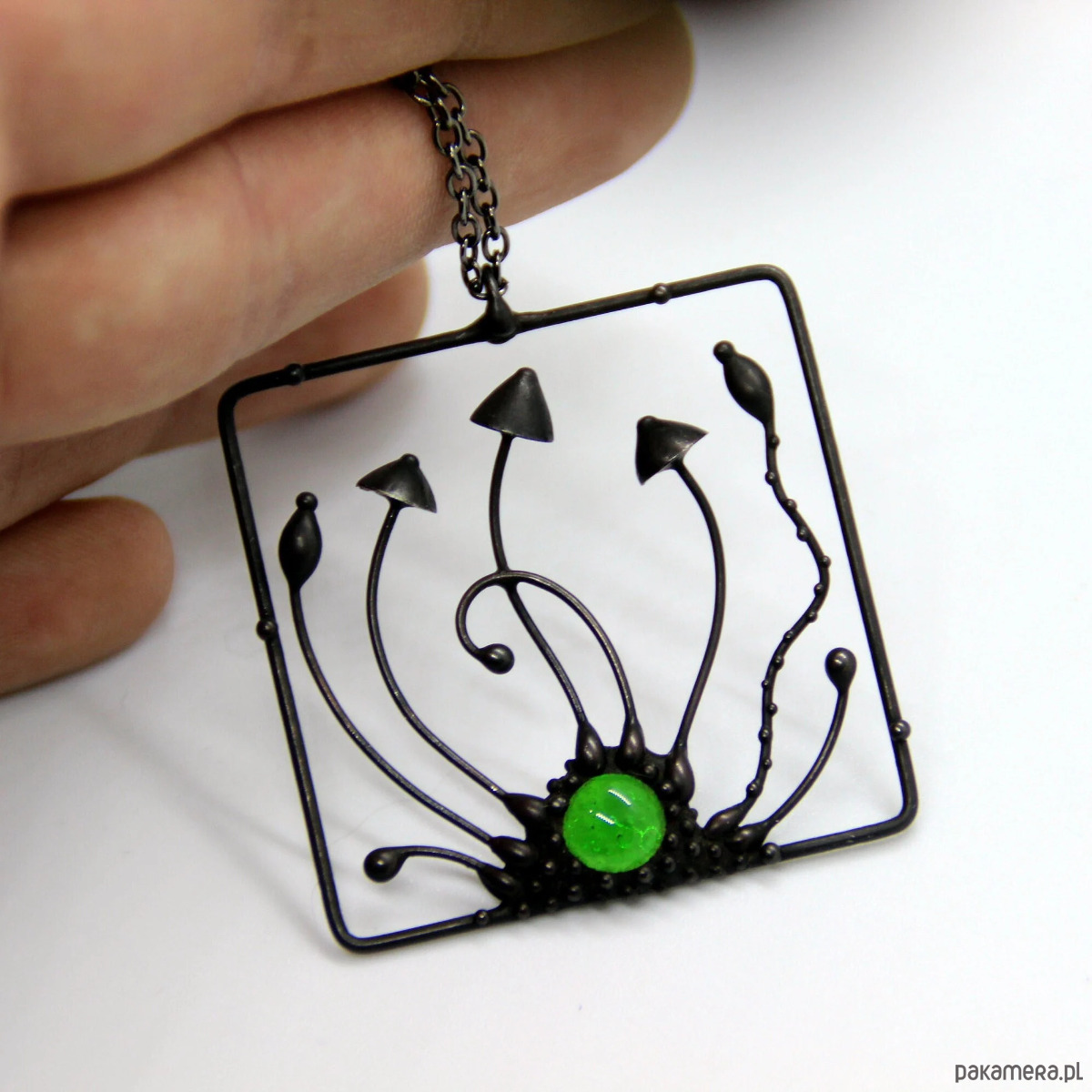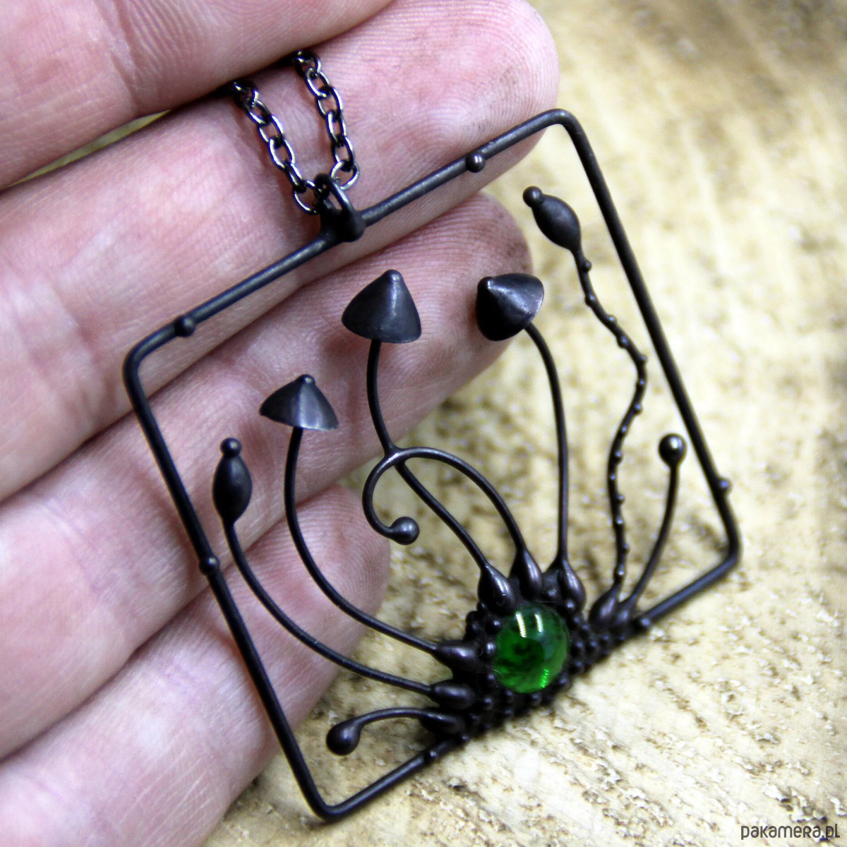 Botaniczna magia Grzyby Hippie wisiorek wykonany ręcznie z miedzi, cyny, stali i zielonego szkła. Pokryty czarną patyną i zabezpieczony środkiem przeciwutleniającym. Naszyjnik jest lekki i wytrzymały. Wszystkie elementy są wykonane ręcznie przez Yadovito, co gwarantuje indywidualność każdego produktu, ponieważ kapelusze grzybów są wykonywane ręcznie, a nie odlewane lub tłoczone. Stop cyny i miedzi jest polerowany roztworem wykończeniowym, aby nadać biżuterii szlachetny wygląd, a jednocześnie zapobiec utlenianiu się metalu. W naszyjniku wykorzystano szkło topione w specjalnym piecu. Po stopieniu szkło nabiera niemal unikalnego kształtu i niesamowitych odcieni kolorów, które mienią się w świetle. Rozmiar około 4 cm. Kolor czarny/zielony.
