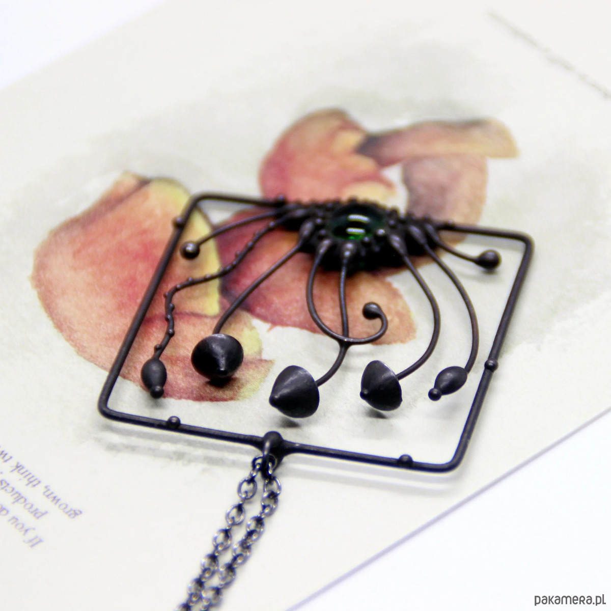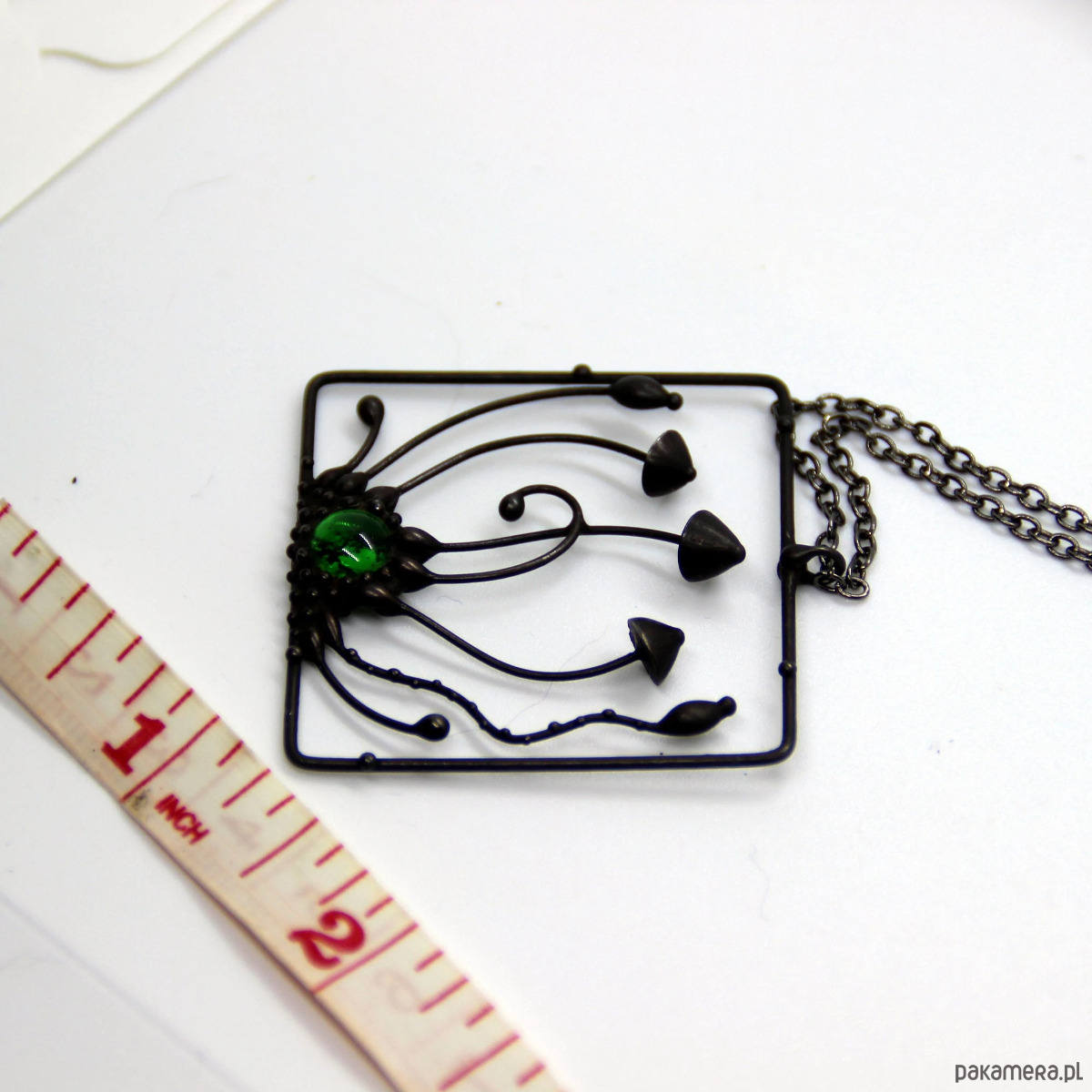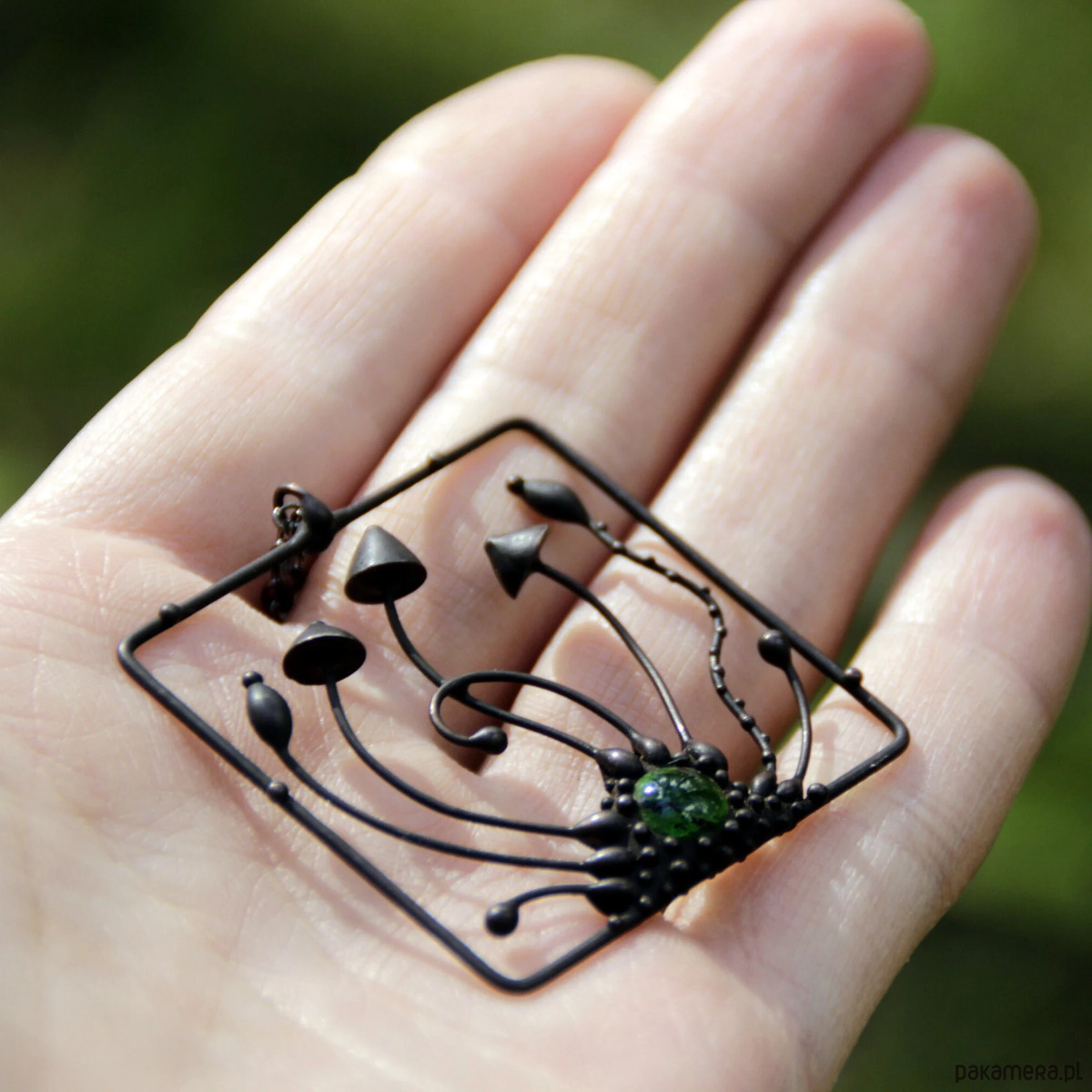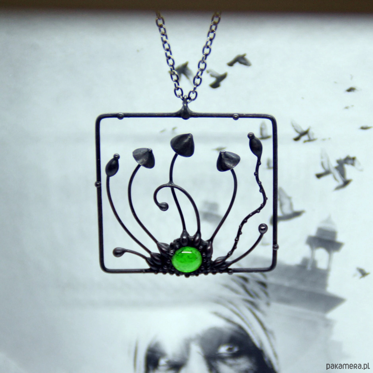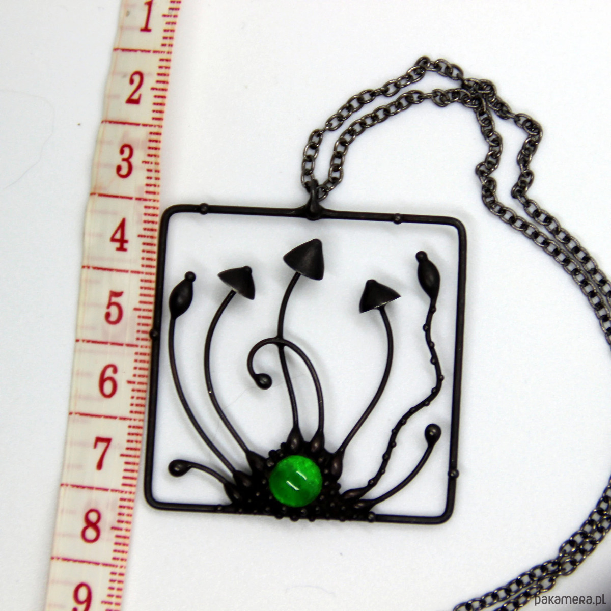 Botaniczna magia Grzyby Hippie wisiorek wykonany ręcznie z miedzi, cyny, stali i zielonego szkła. Pokryty czarną patyną i zabezpieczony środkiem przeciwutleniającym. Naszyjnik jest lekki i wytrzymały. Wszystkie elementy są wykonane ręcznie przez Yadovito, co gwarantuje indywidualność każdego produktu, ponieważ kapelusze grzybów są wykonywane ręcznie, a nie odlewane lub tłoczone. Stop cyny i miedzi jest polerowany roztworem wykończeniowym, aby nadać biżuterii szlachetny wygląd, a jednocześnie zapobiec utlenianiu się metalu. W naszyjniku wykorzystano szkło topione w specjalnym piecu. Po stopieniu szkło nabiera niemal unikalnego kształtu i niesamowitych odcieni kolorów, które mienią się w świetle. Rozmiar około 4 cm. Kolor czarny/zielony.