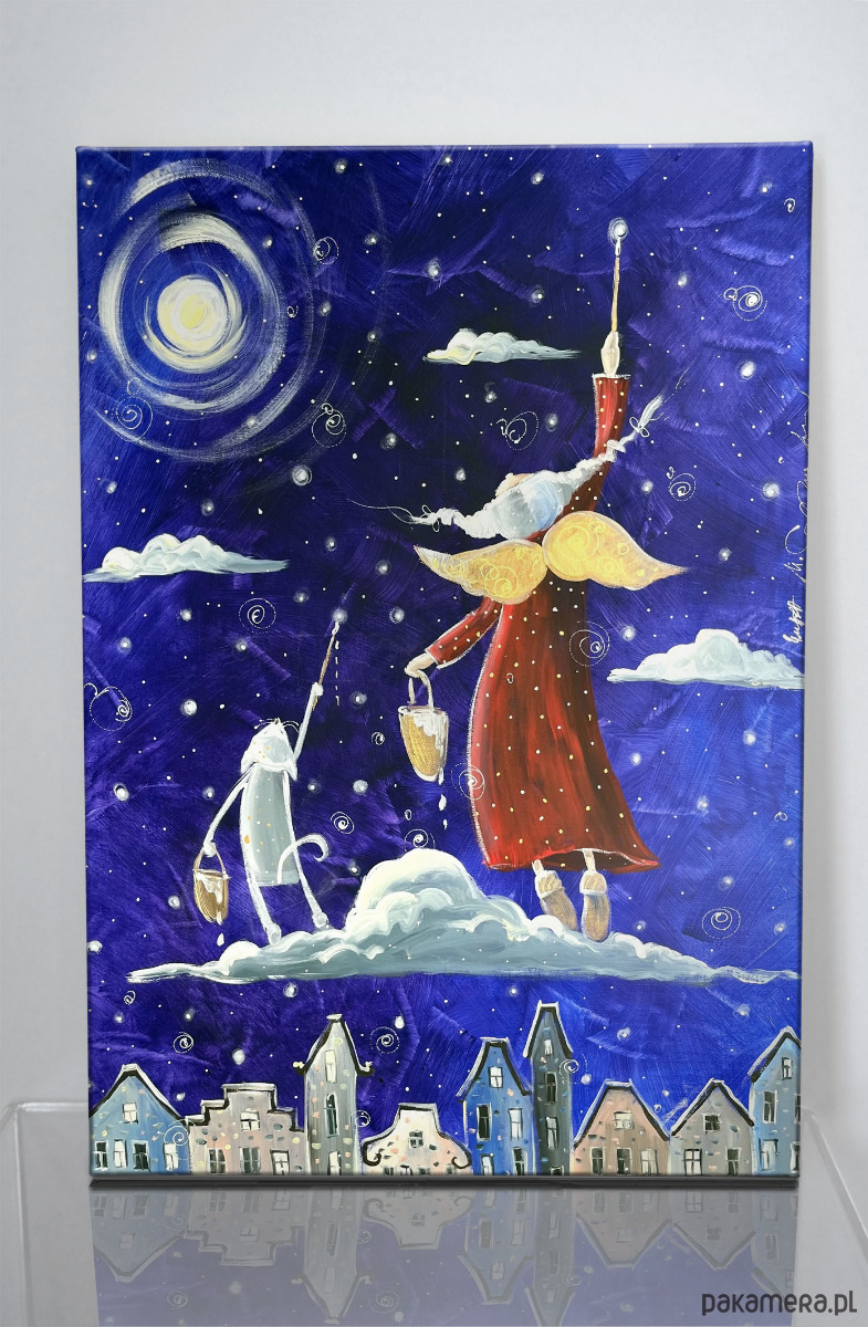 Autorski obraz malowany ręcznie farbami akrylowymi, a następnie wydrukowany na wysokiej jakości płótnie i naciągnięty na drewniane krosno. Obraz nosi tytuł "Magiczne gwiazdki marzeń".