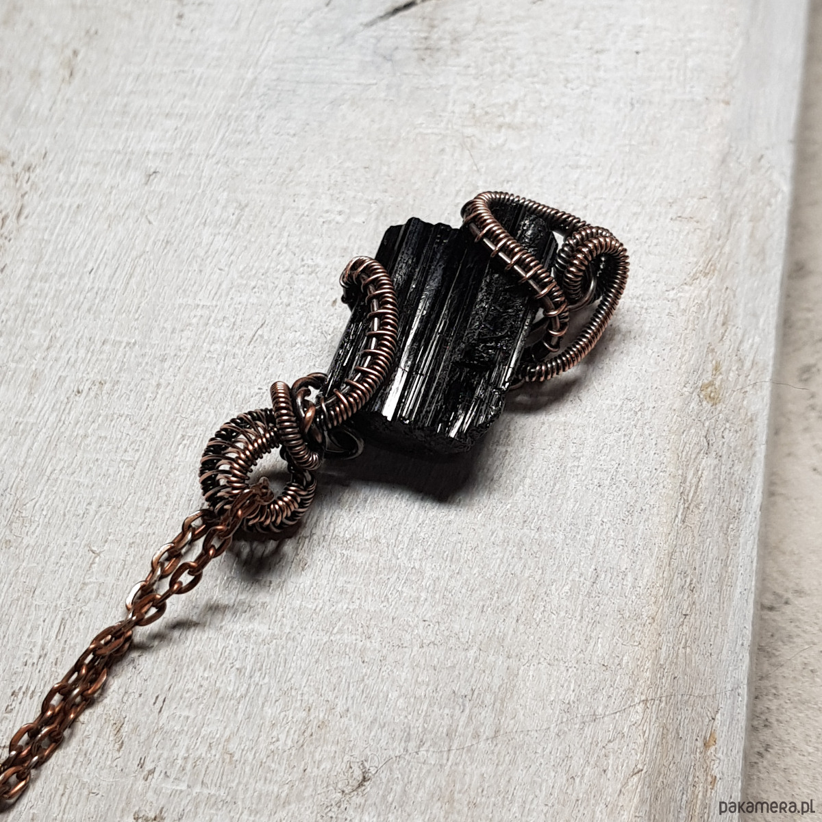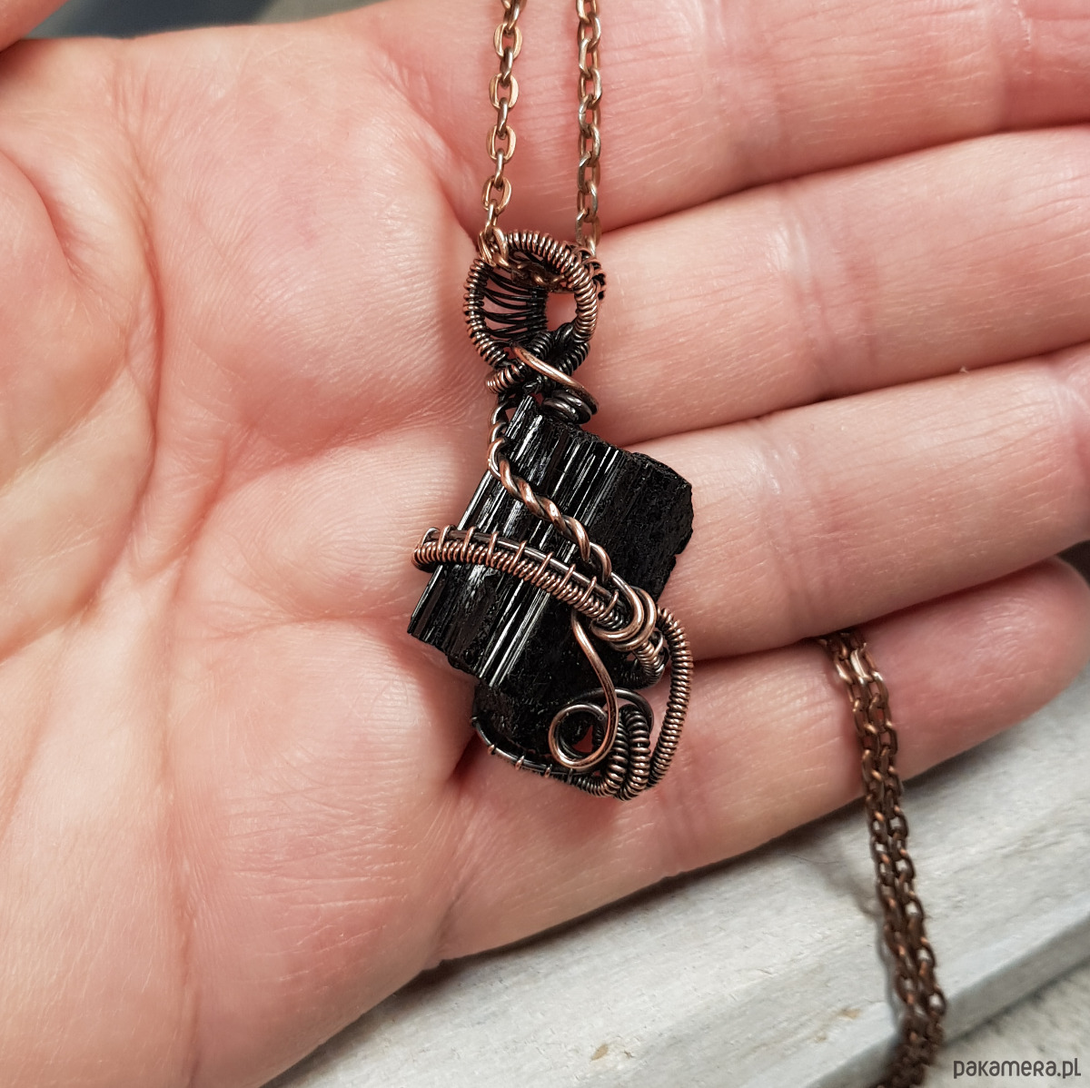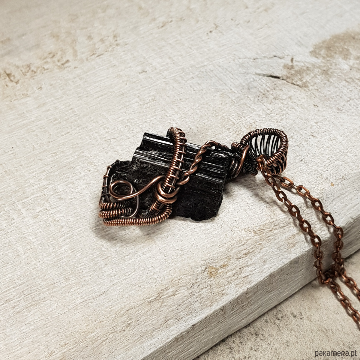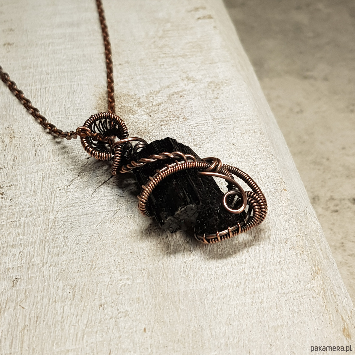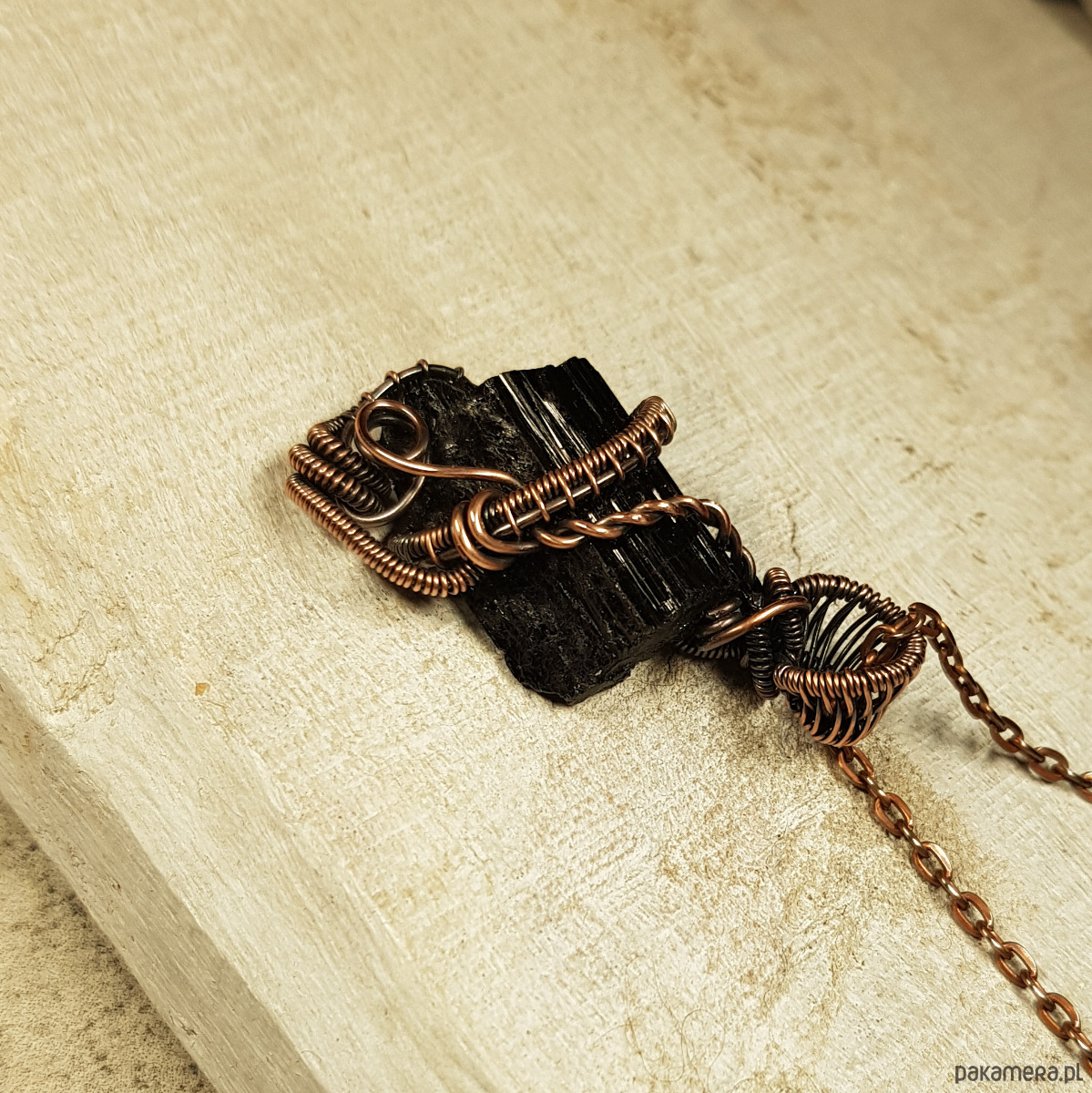 Wisiorek wykonany ręcznie w miedzi metodą wire-wrappingu z naturalnego surowego czarnego turmalinu, przyciemniony oksydą i wypolerowany w celu uzyskania szlachetnego efektu postarzenia. Wymiary wisiorka 42x20 mm, z łańcuszkiem o długości około 45 cm.