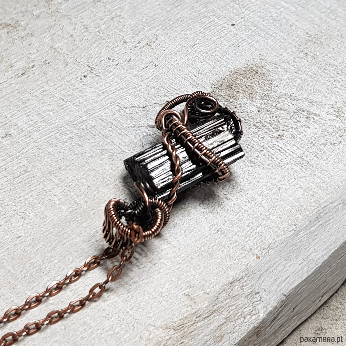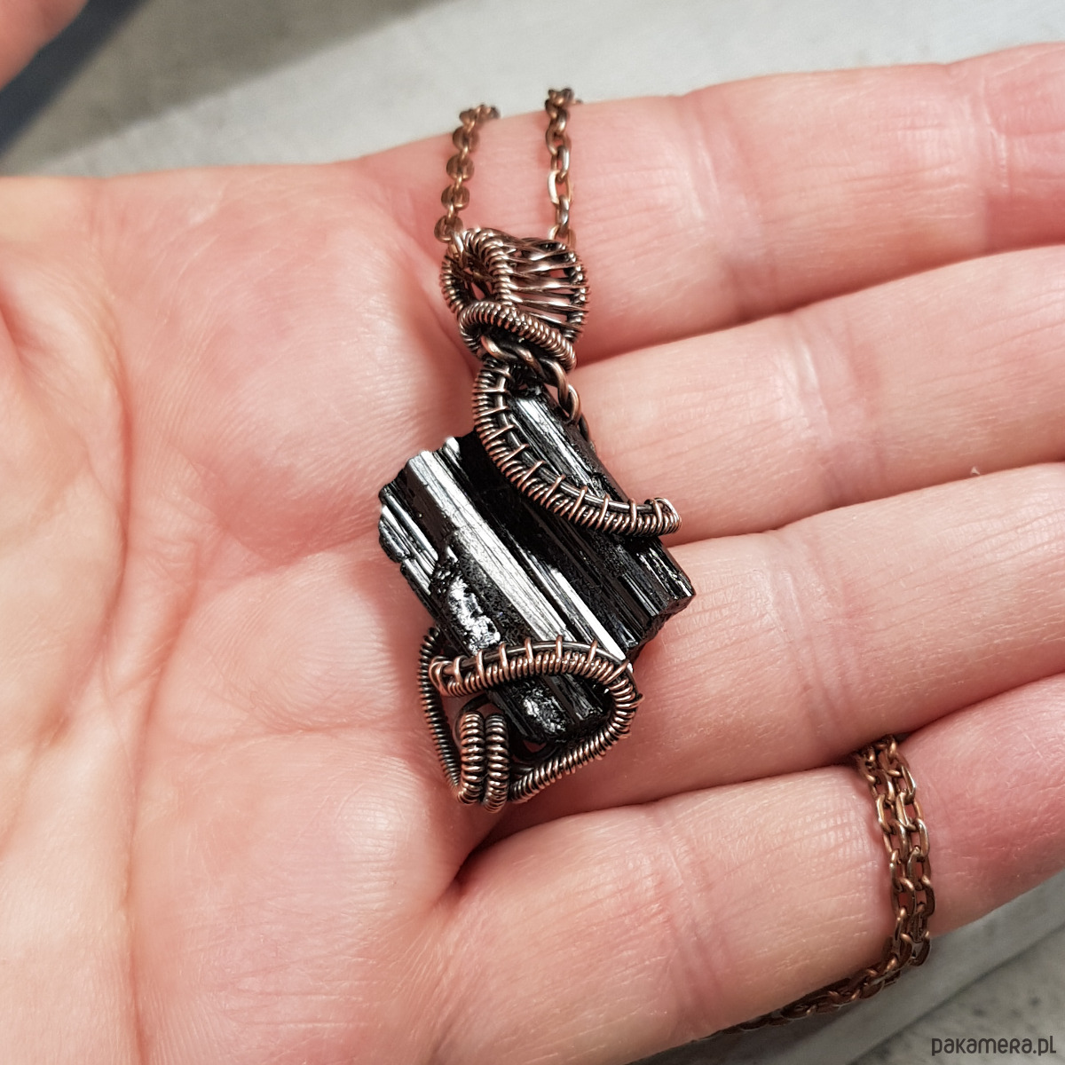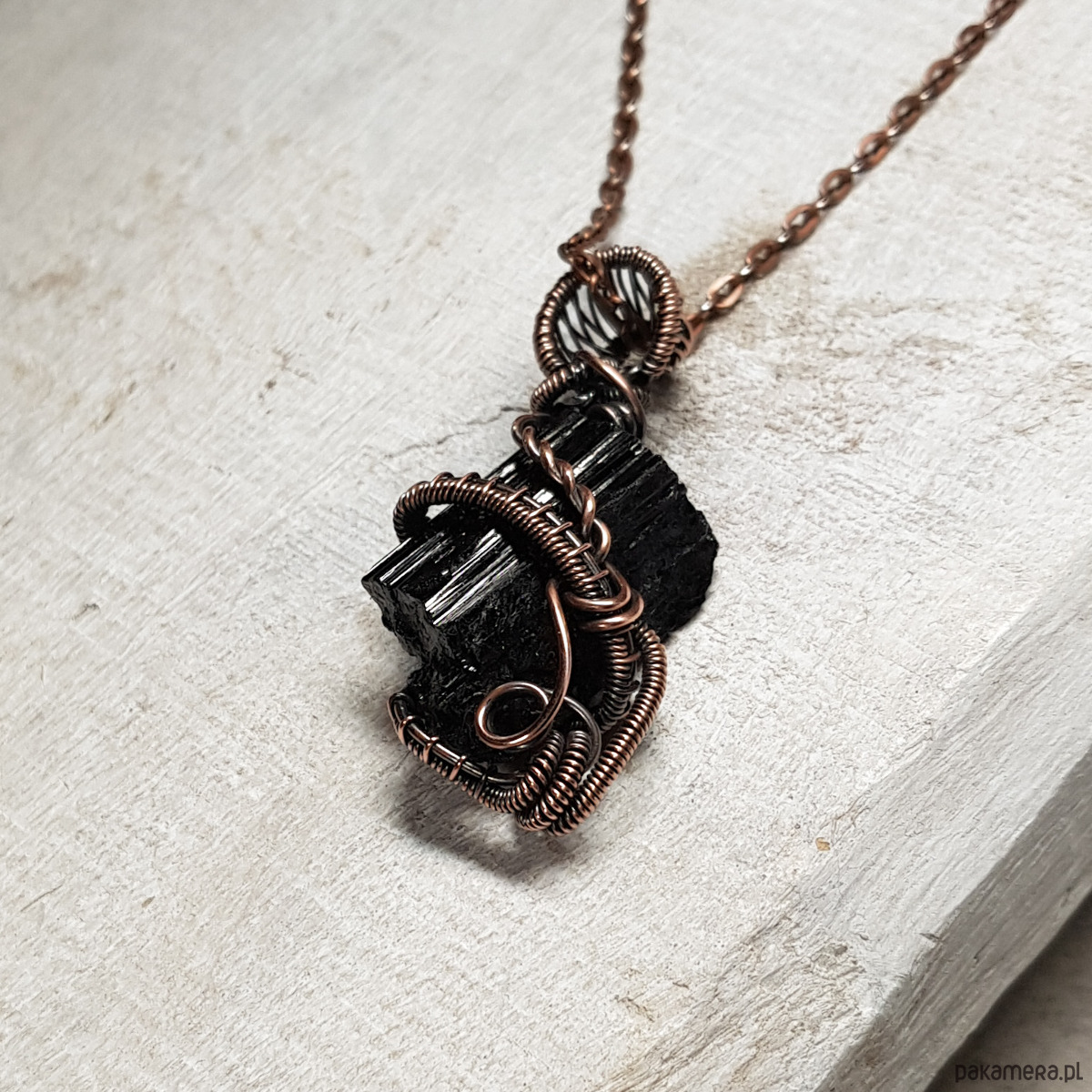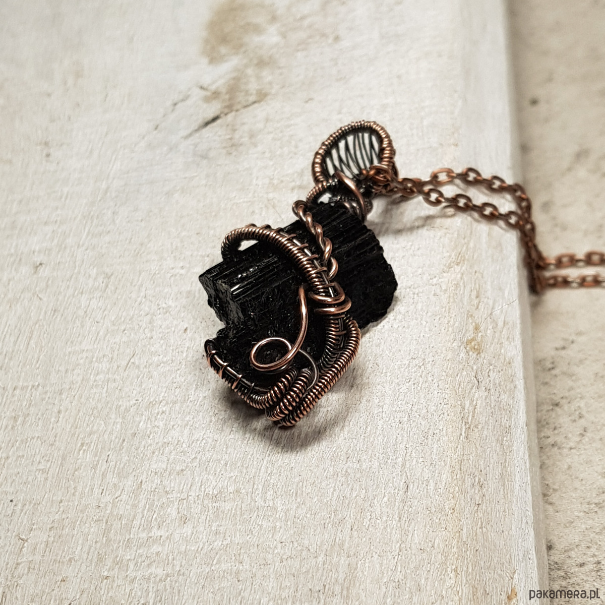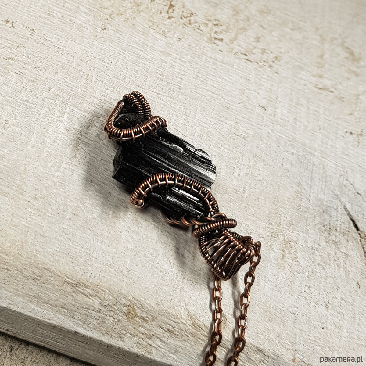 Wisiorek wykonany ręcznie w miedzi metodą wire-wrappingu z naturalnego surowego czarnego turmalinu, przyciemniony oksydą i wypolerowany w celu uzyskania szlachetnego efektu postarzenia. Wymiary wisiorka 42x20 mm, z łańcuszkiem o długości około 45 cm.