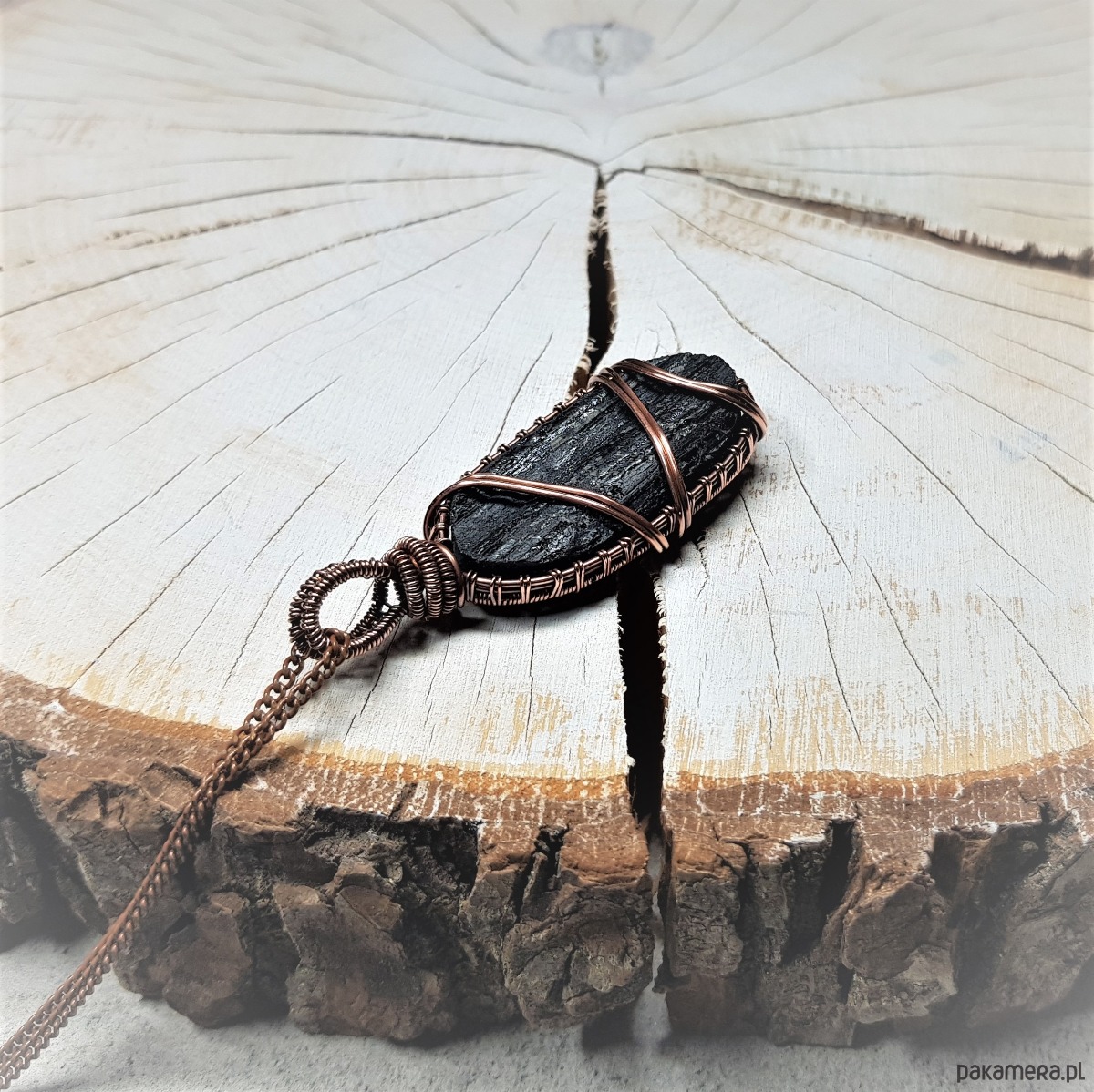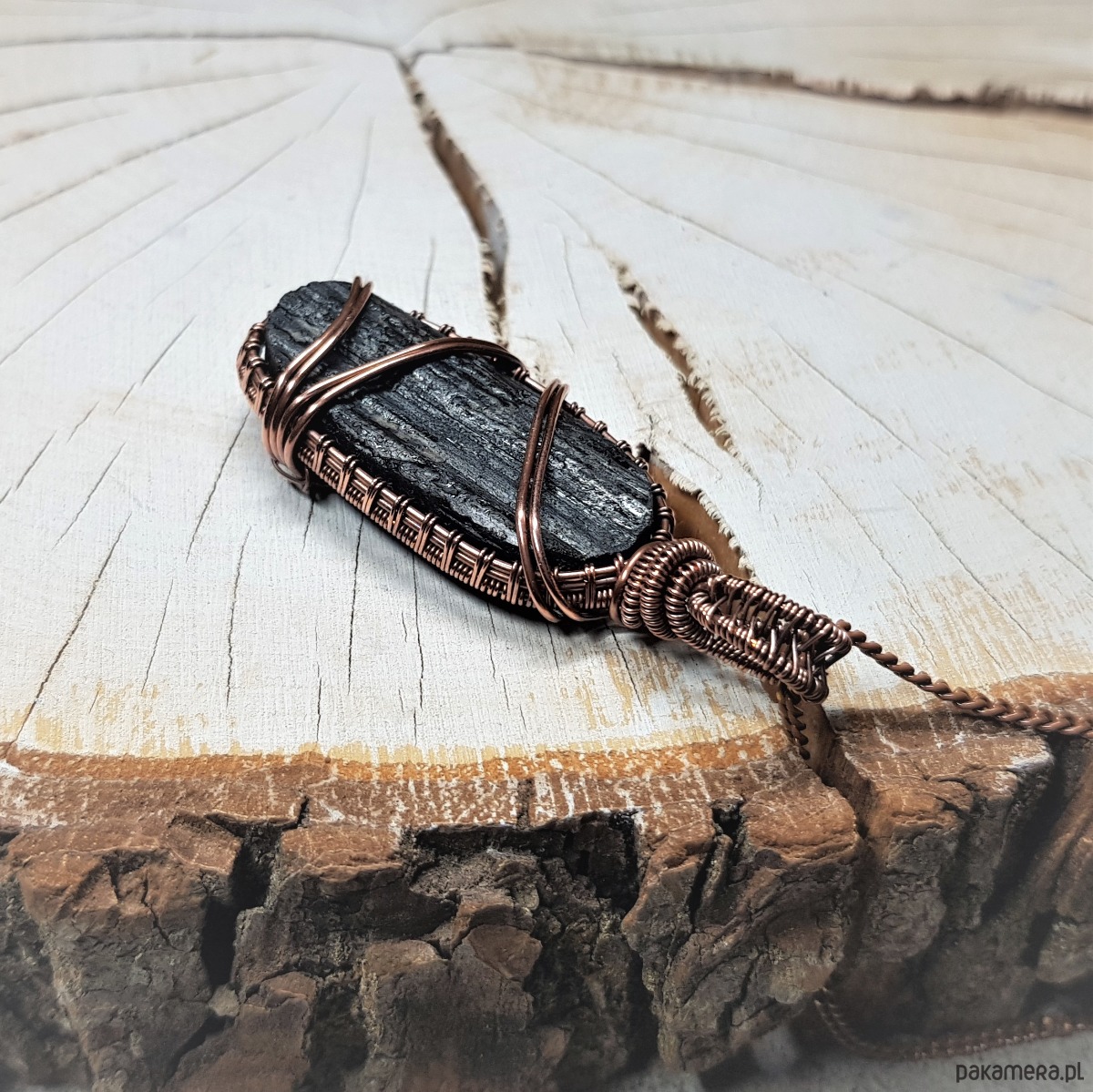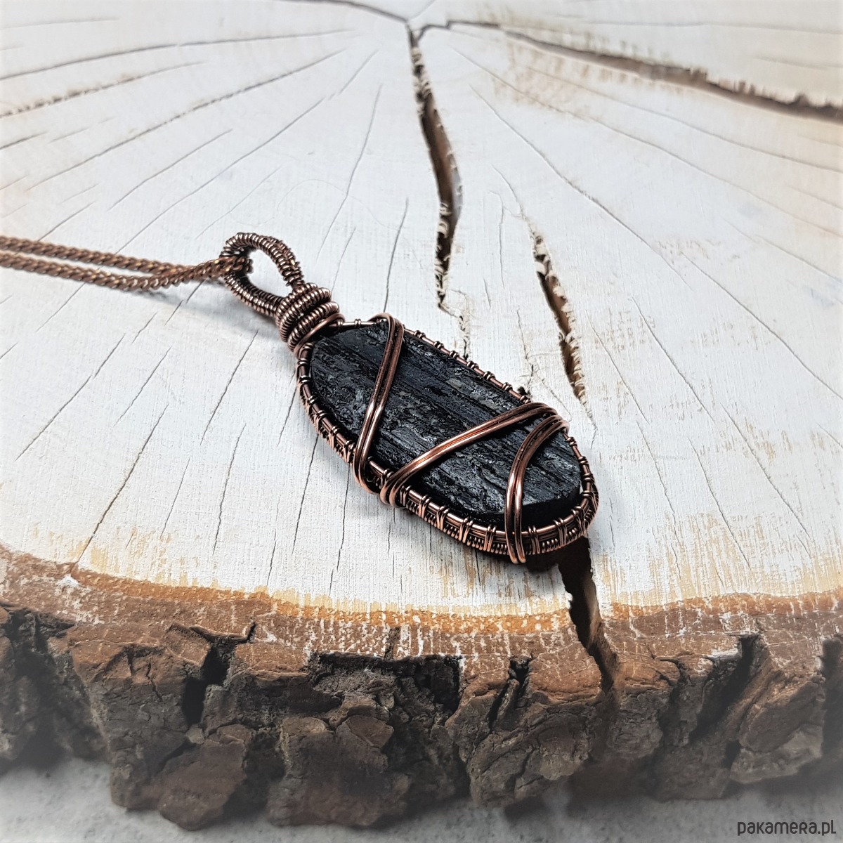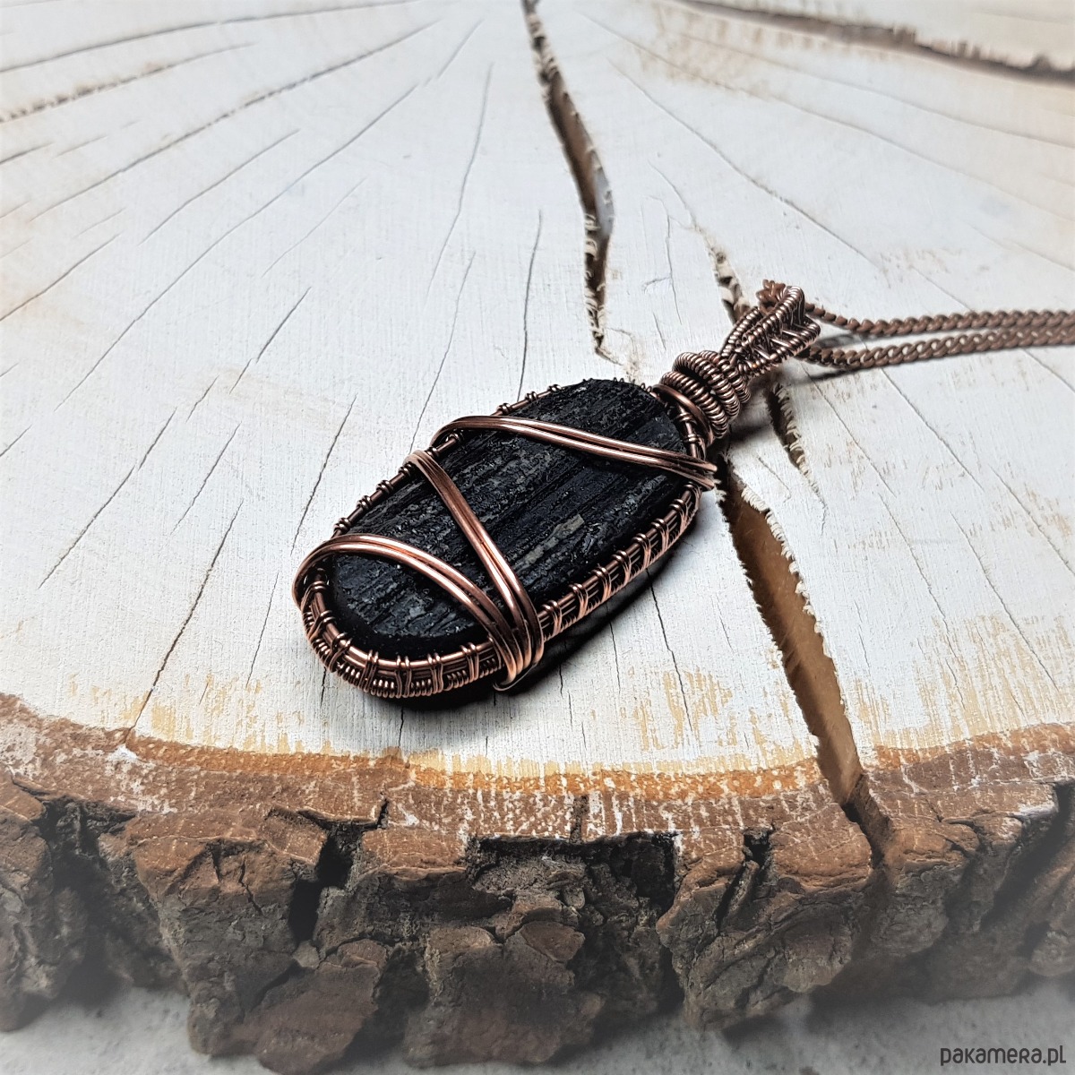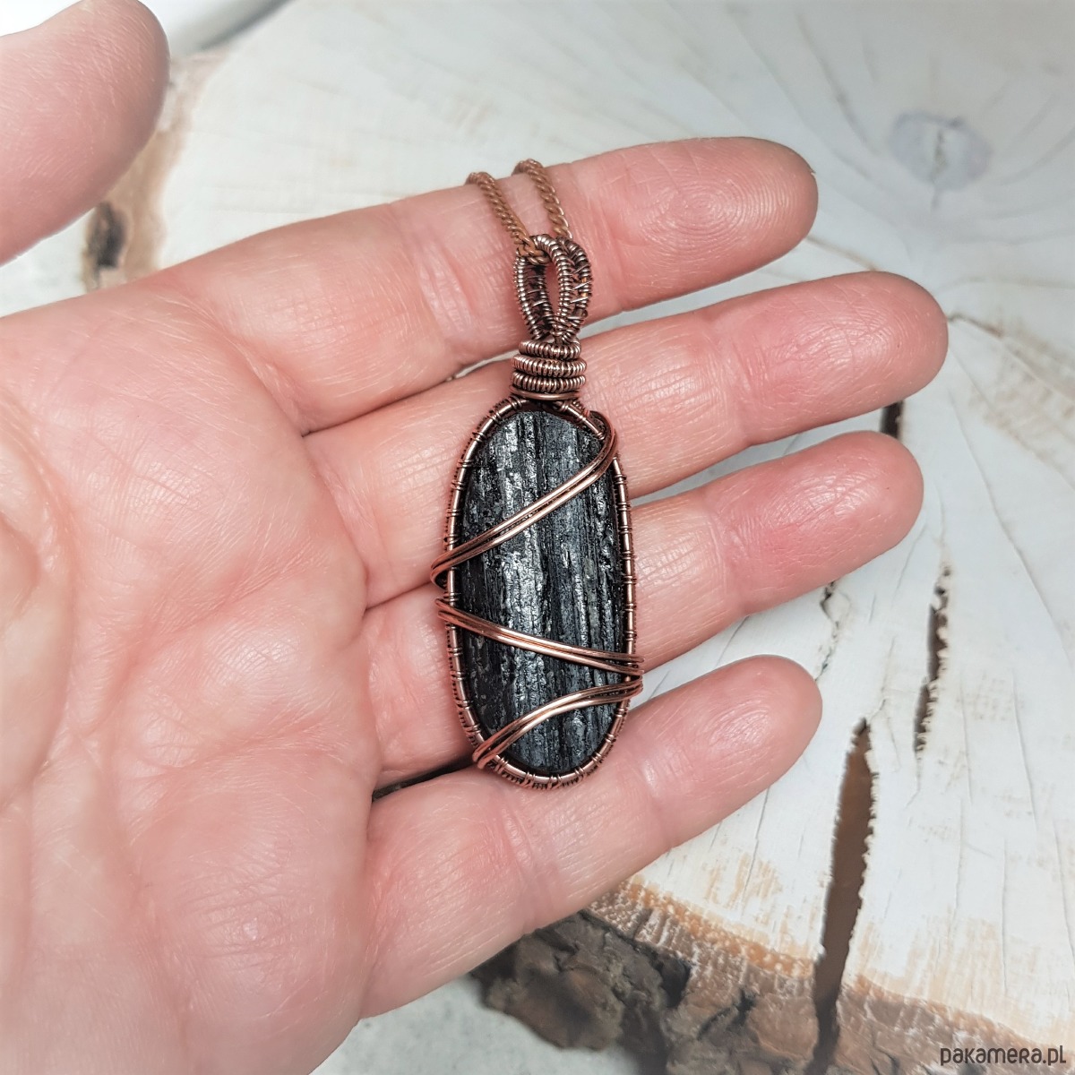 Wisiorek wykonany ręcznie w miedzi metodą wire-wrappingu z naturalnego czarnego turmalinu, przyciemniony oksydą i wypolerowany w celu uzyskania szlachetnego efektu postarzenia. Wymiary wisiorka 57x22mm, z łańcuszkiem o długości około 50 cm.
