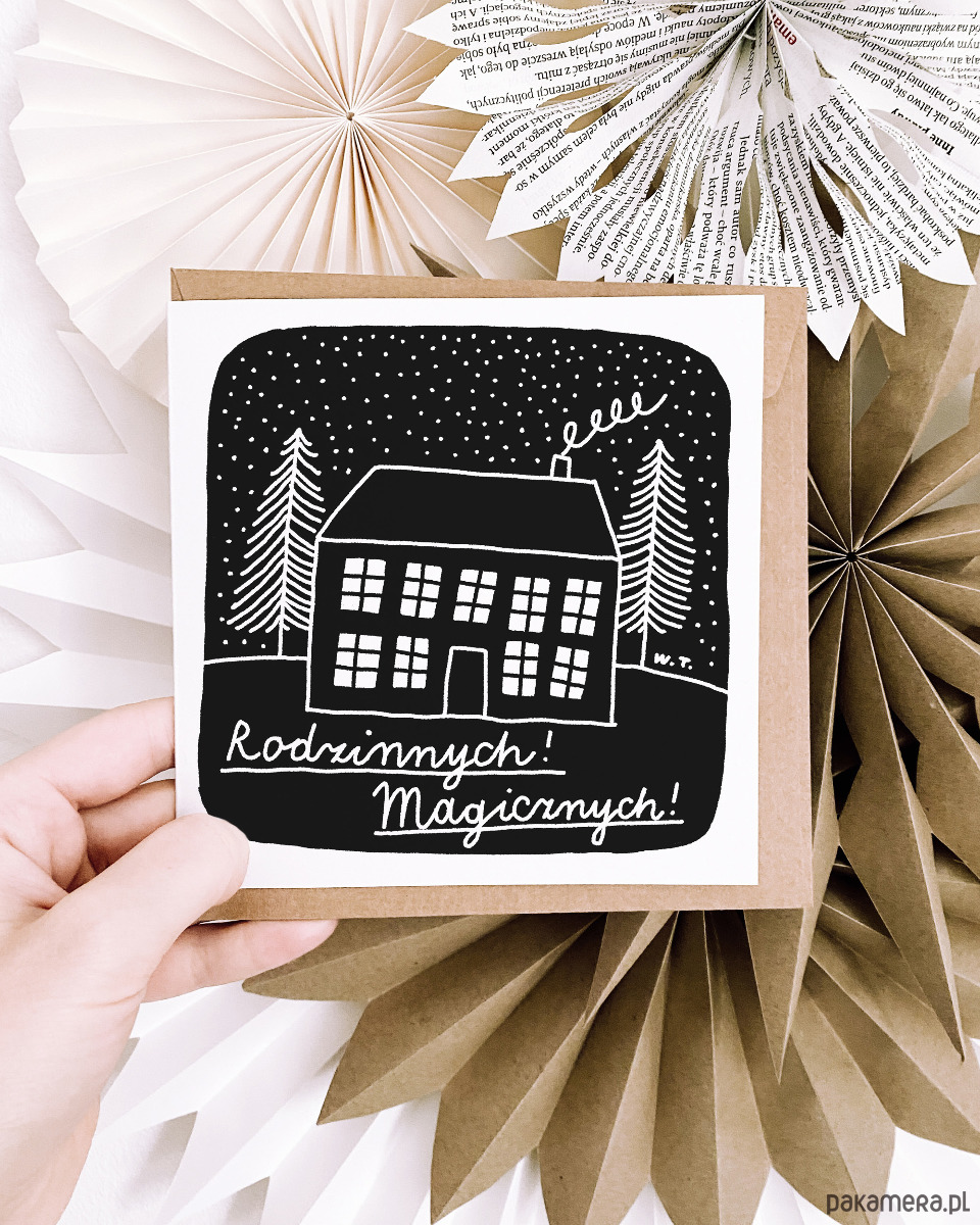Minimalistyczna, ekologiczna kartka świąteczna z domem.