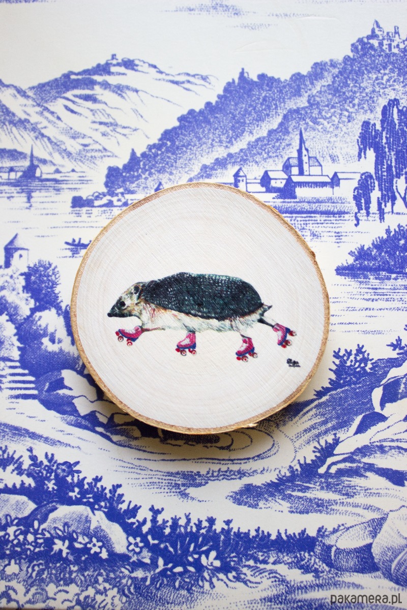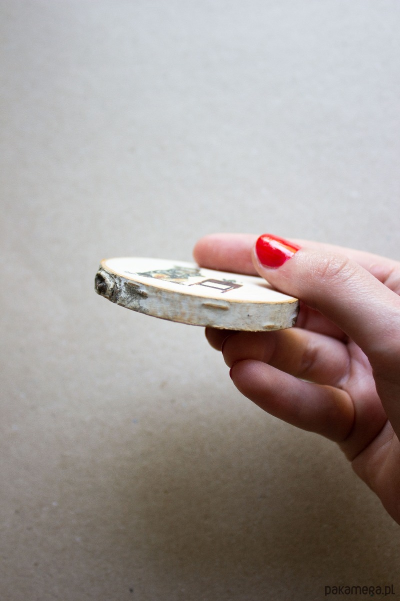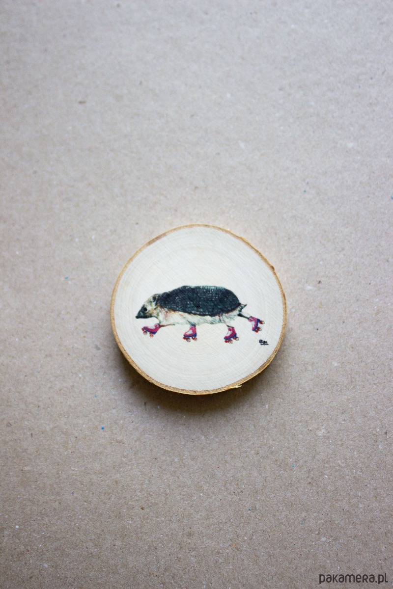 Magnes w kształcie plastra drewna zaprojektowany i wykonany w Polsce. Przedstawia ilustrację oryginalnie wykonaną przeze mnie akwarelami oraz gwaszem. Magnes wykonany w Polsce. Każdy magnes będzie inny pod względem kształtu (elipsa-koło), koloru (jasny) lub czasami wielkości – jest to naturalne drewno brzozowe.