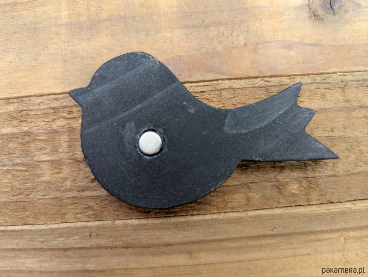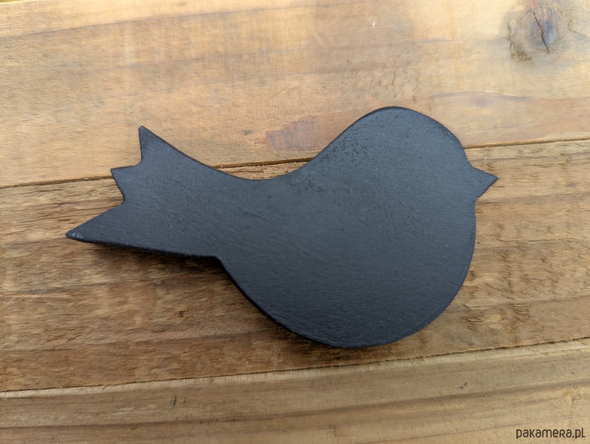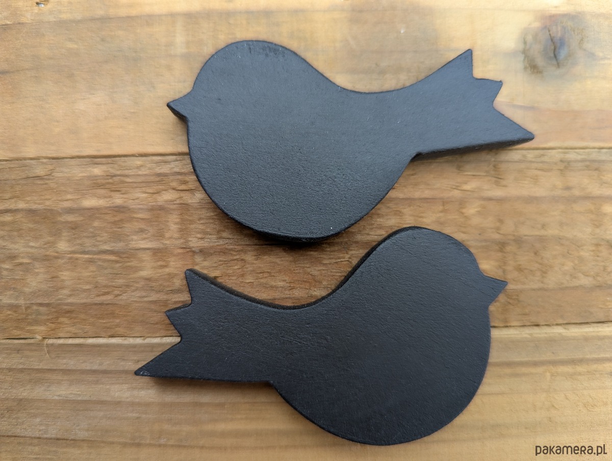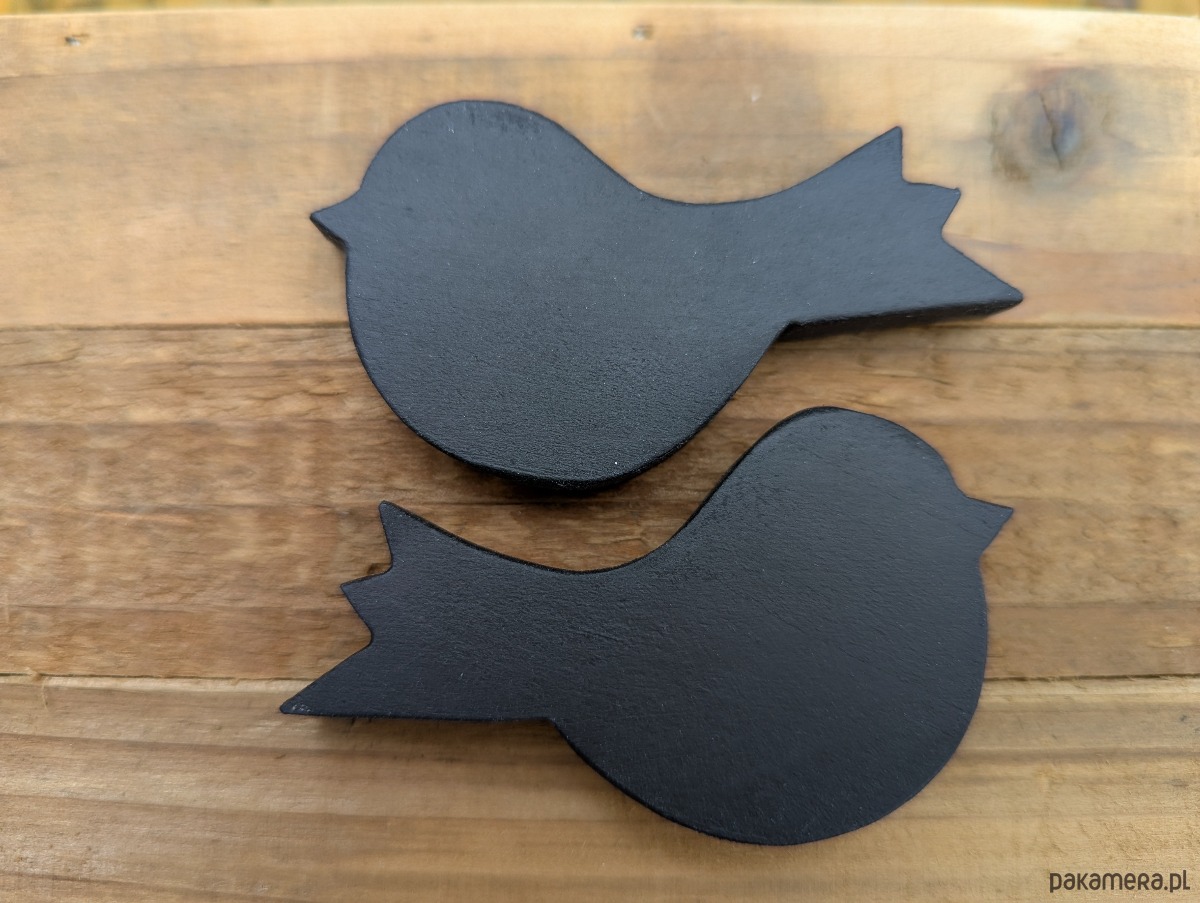 Ptaszki zostały wycięte z drewna sosnowego i pomalowane na czarno farbą akrylowa.