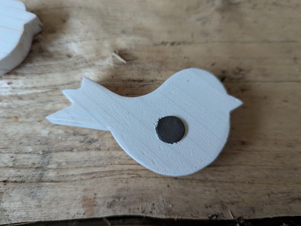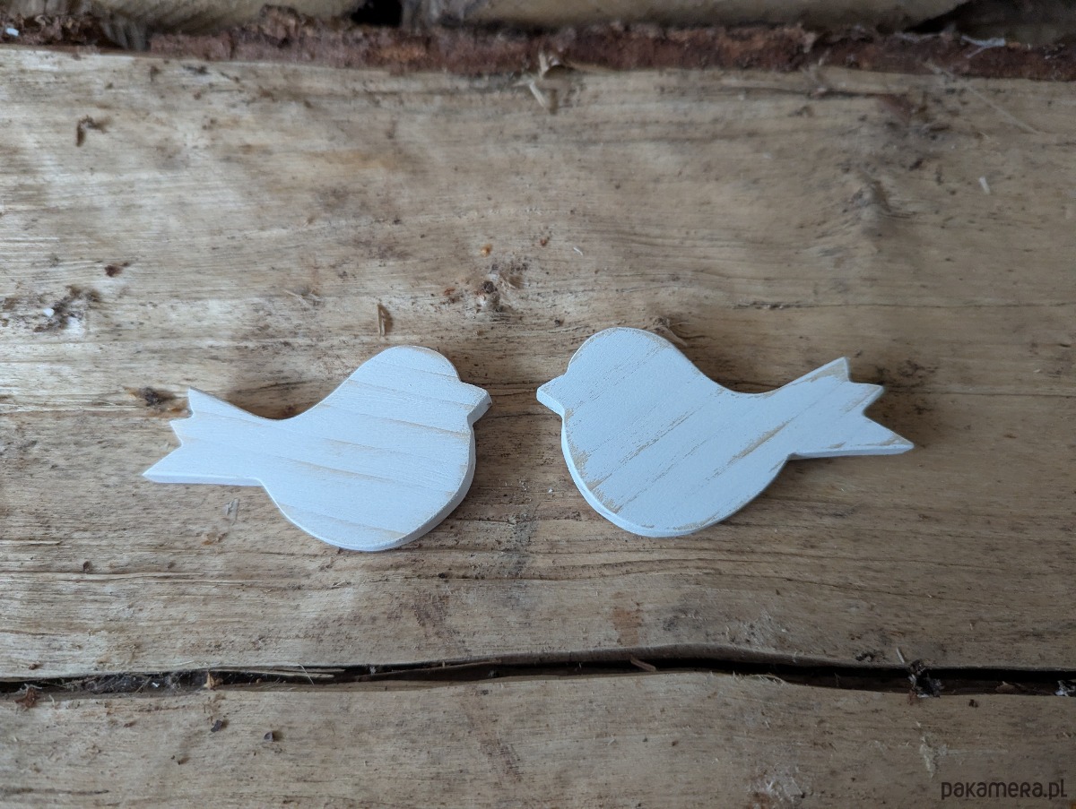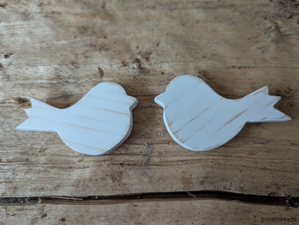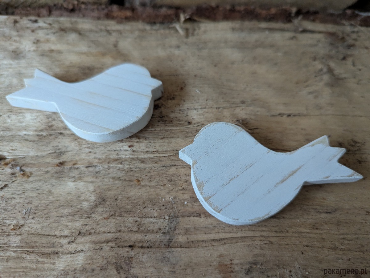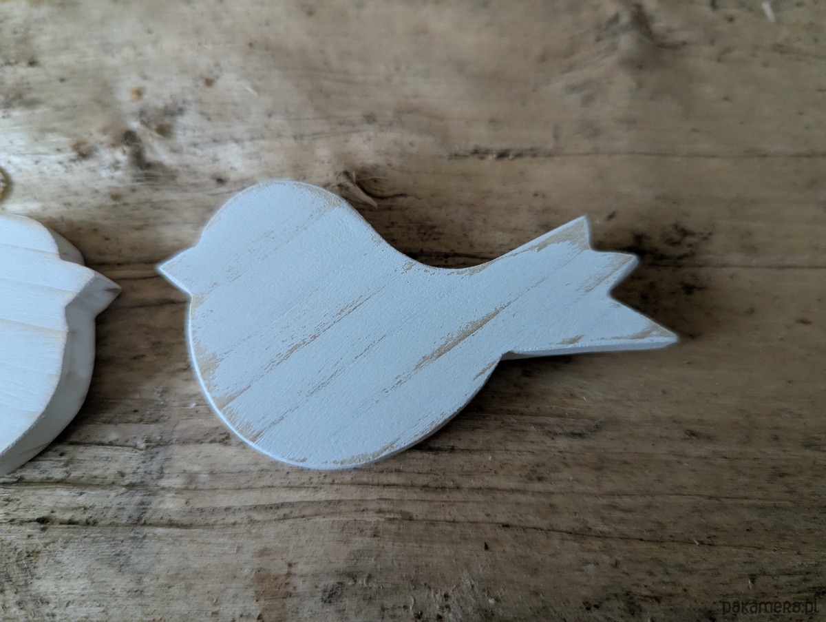 Ptaszki zostały wycięte z drewna sosnowego i pomalowane na biało farbą akrylowa i przetarte.