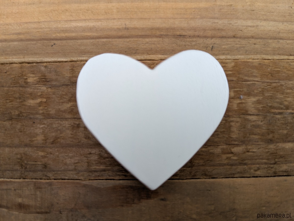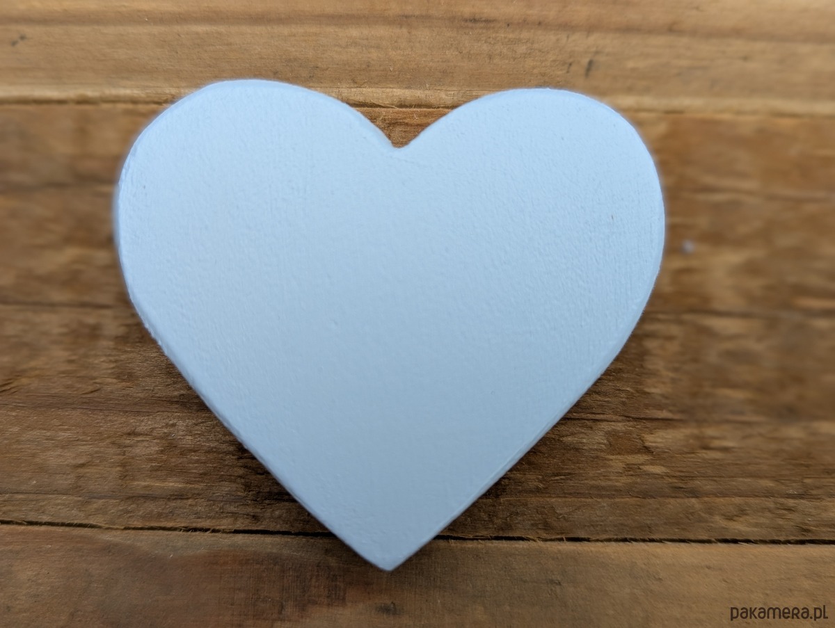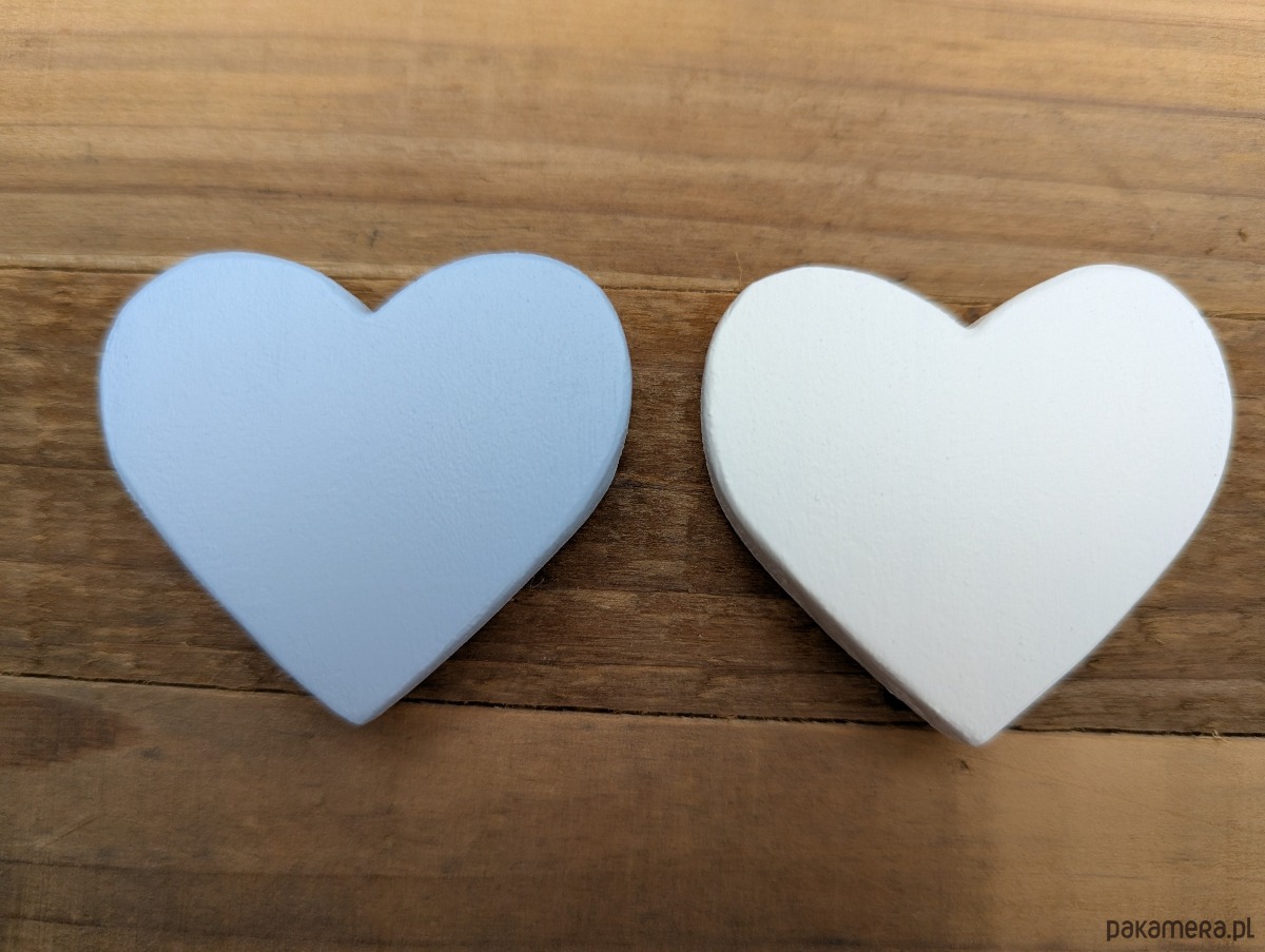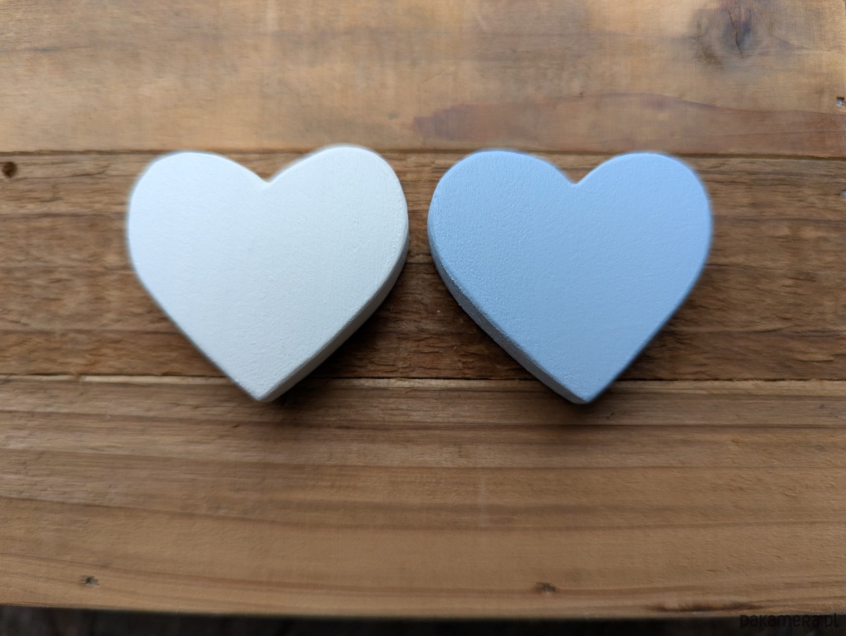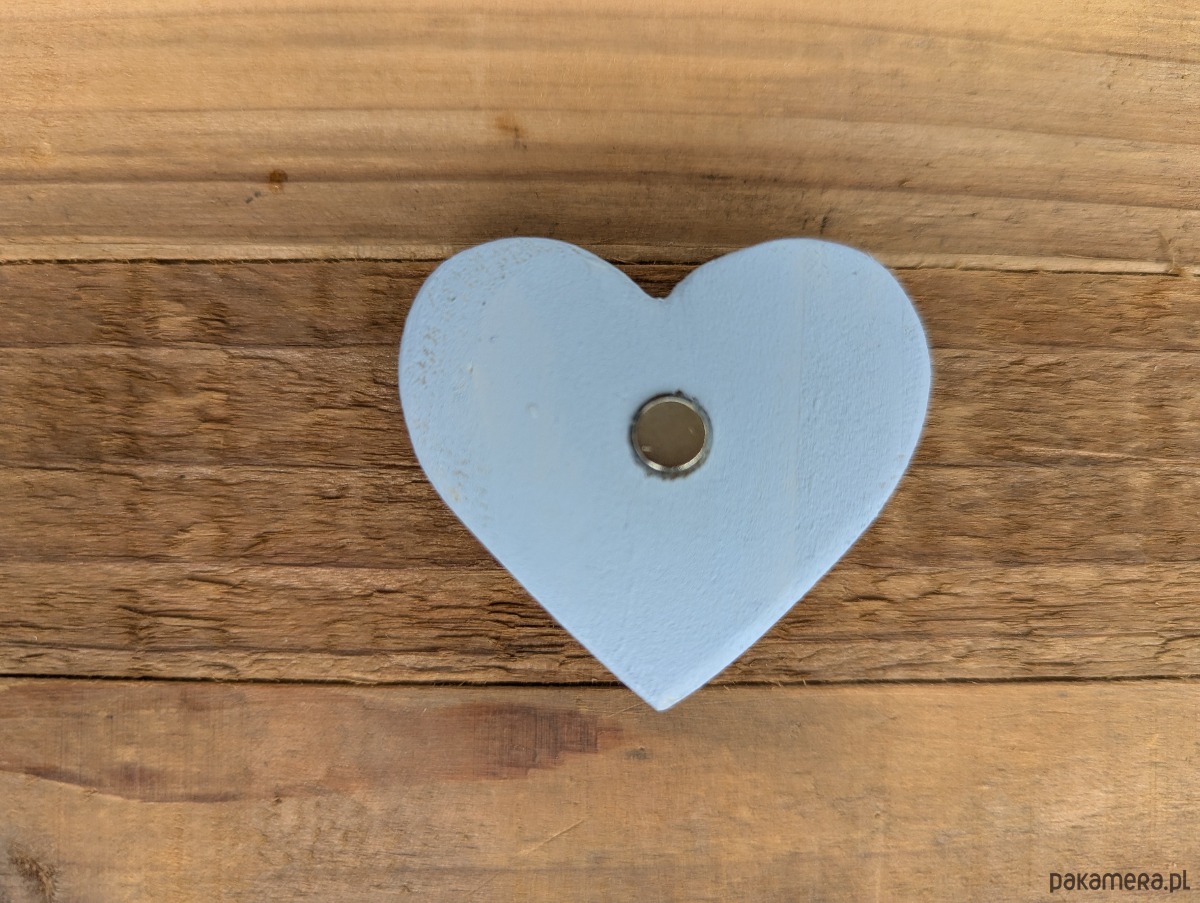 Serduszka zostały wycięte z drewna sosnowego i pomalowane na biało i niebiesko farbą akrylowa.
