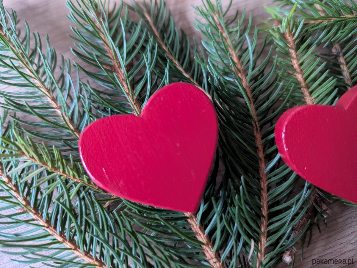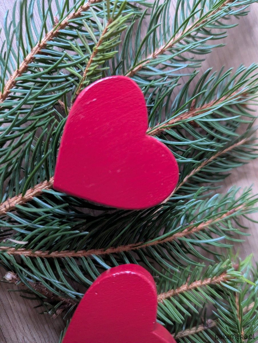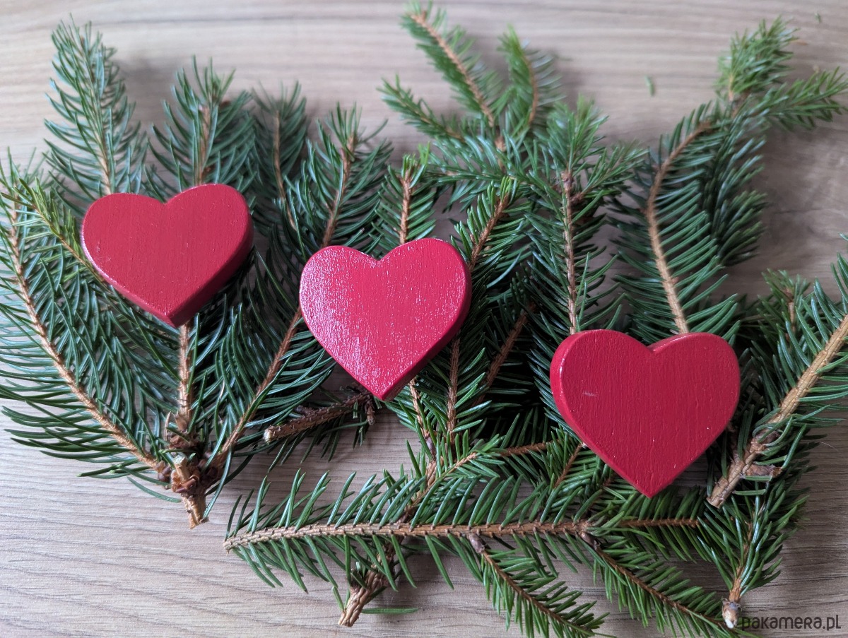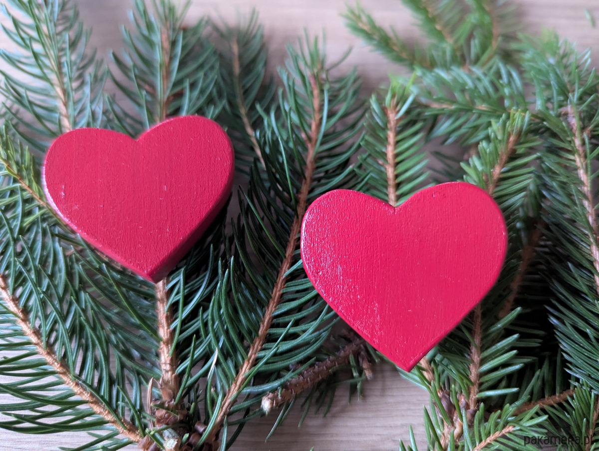 Serduszka zostały wycięte z drewna sosnowego i pomalowane na czerwono farbą akrylowa.