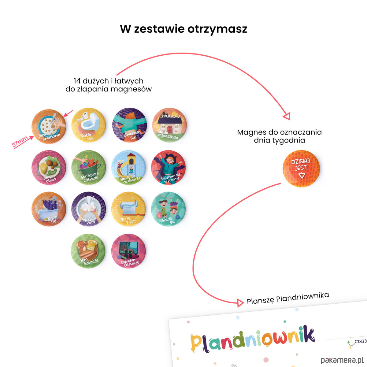 - W zestawie otrzymasz Plandniownik, 14 magnesów z zadaniami dla przedszkolaka, taśmy do mocowania oraz magnes do oznaczania dnia tygodnia.