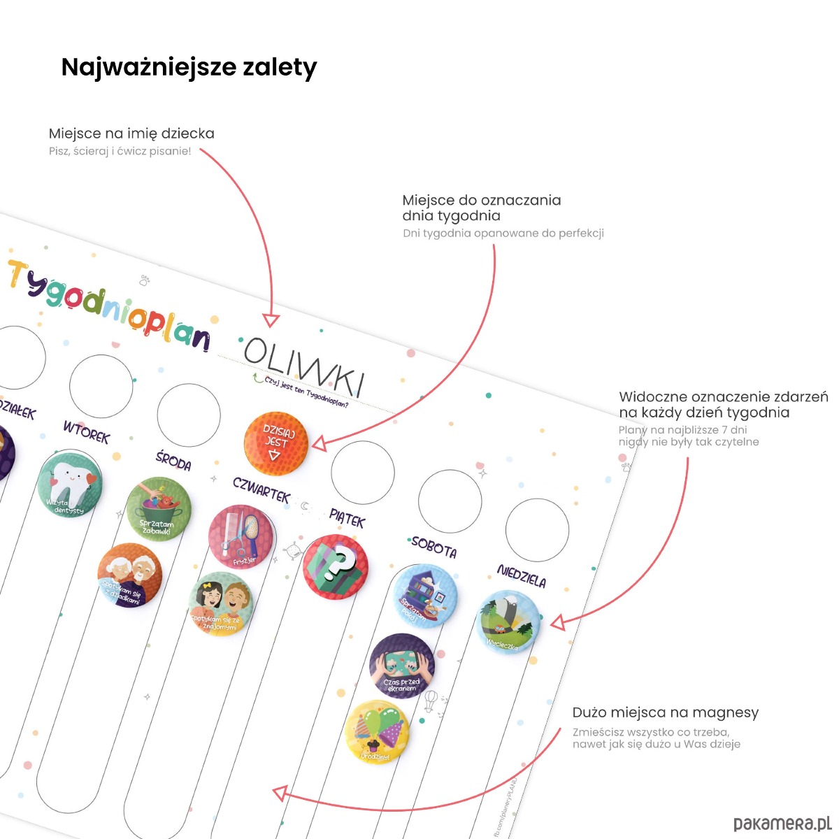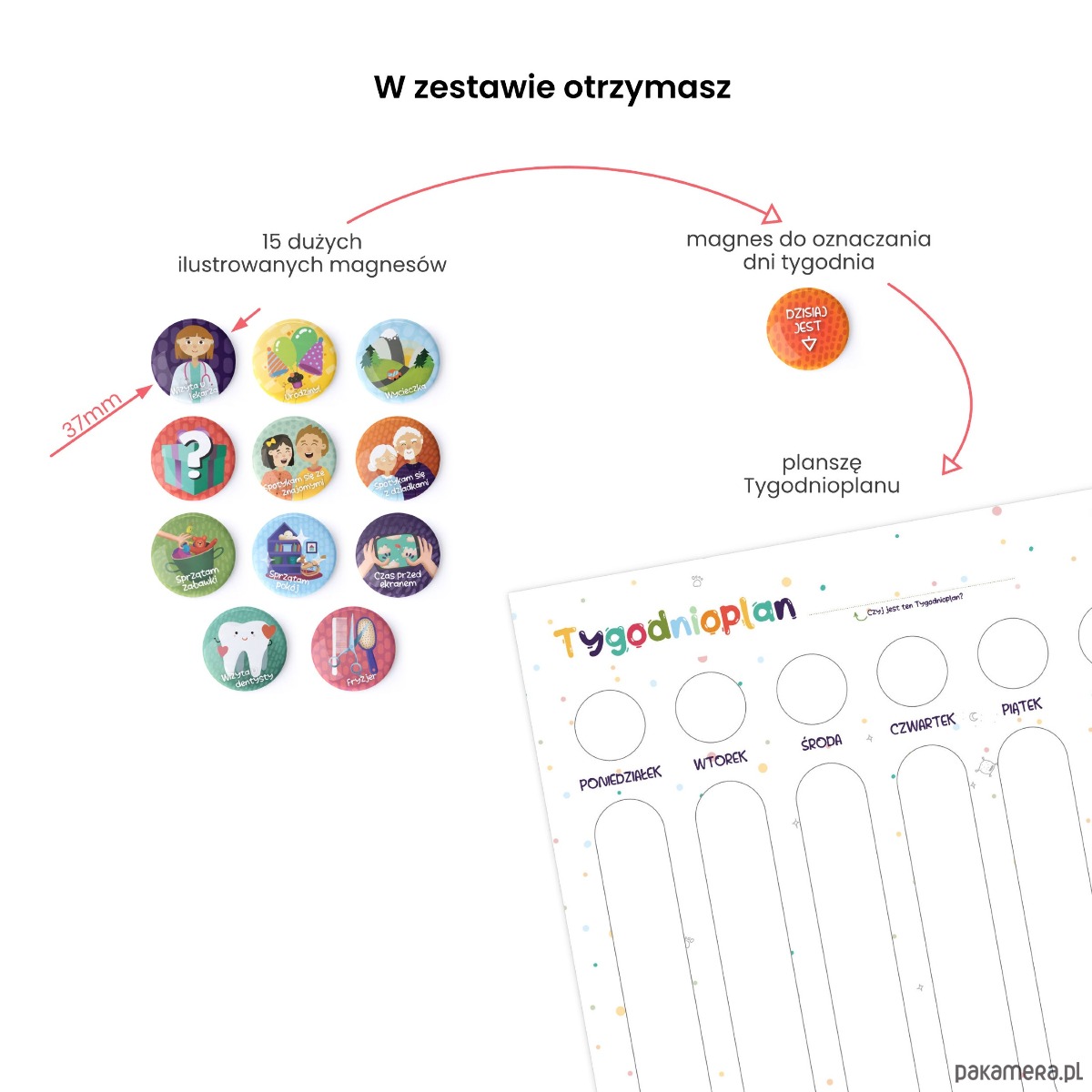 Ilustrowany TygodnioPlan dla Dzieci pozwoli nawet młodszym dzieciom ogarnąć co i kiedy się wydarzy w najbliższym tygodniu. Jest to zestaw podstawowy. Możesz go rozbudować o dodatkowe magnesy które znajdziesz w naszym sklepie.