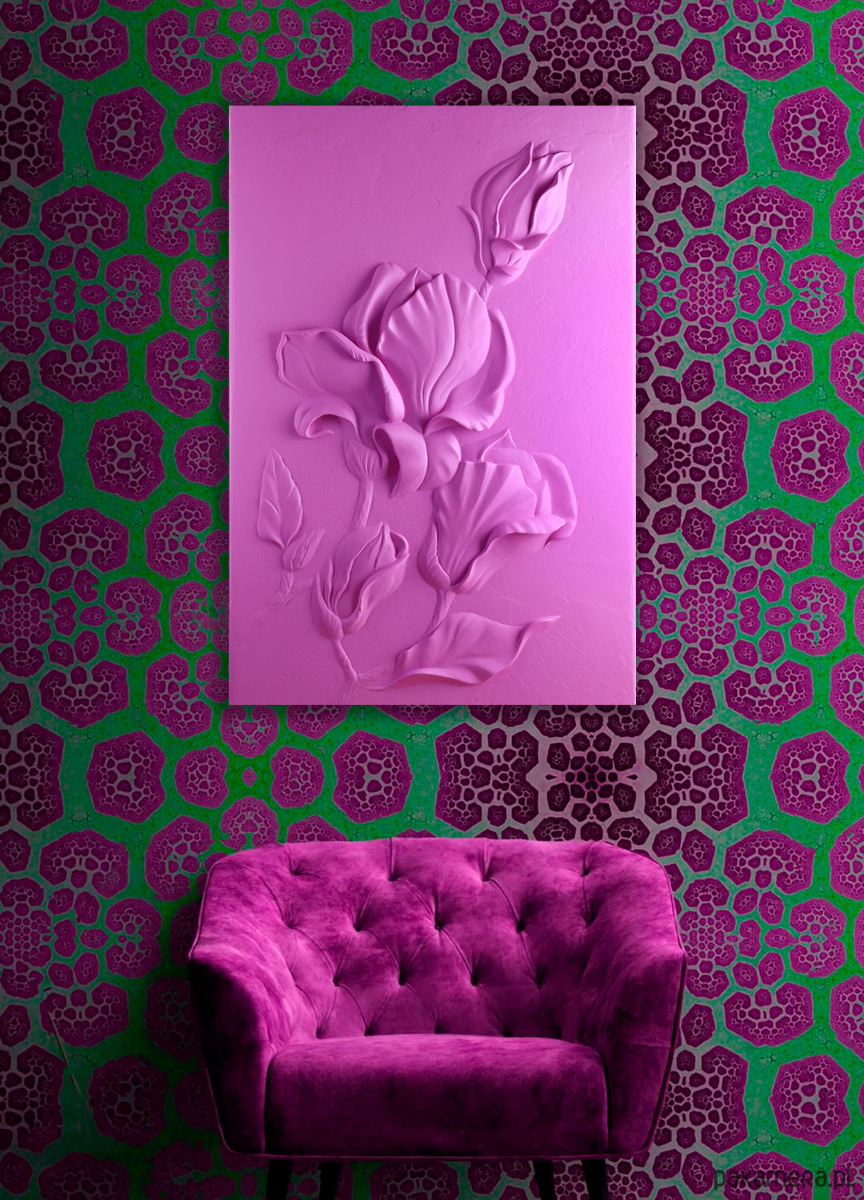 Myślałam, że kolorowa płaskorzeźba będzie dobrze wyglądać wyłącznie na białym tle, tymczasem na tapecie z kontrastowym wzorem prezentuje się naprawdę fascynująco. Również dobrze będzie wyglądać na jednolitym tle w odcieniach fioletu, zieleni, burgunda, złota - tworząc wyjątkową, elegancką kompozycję.