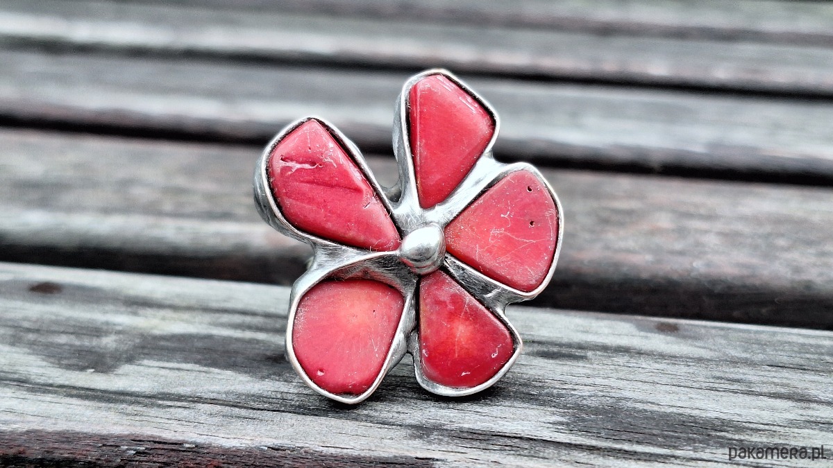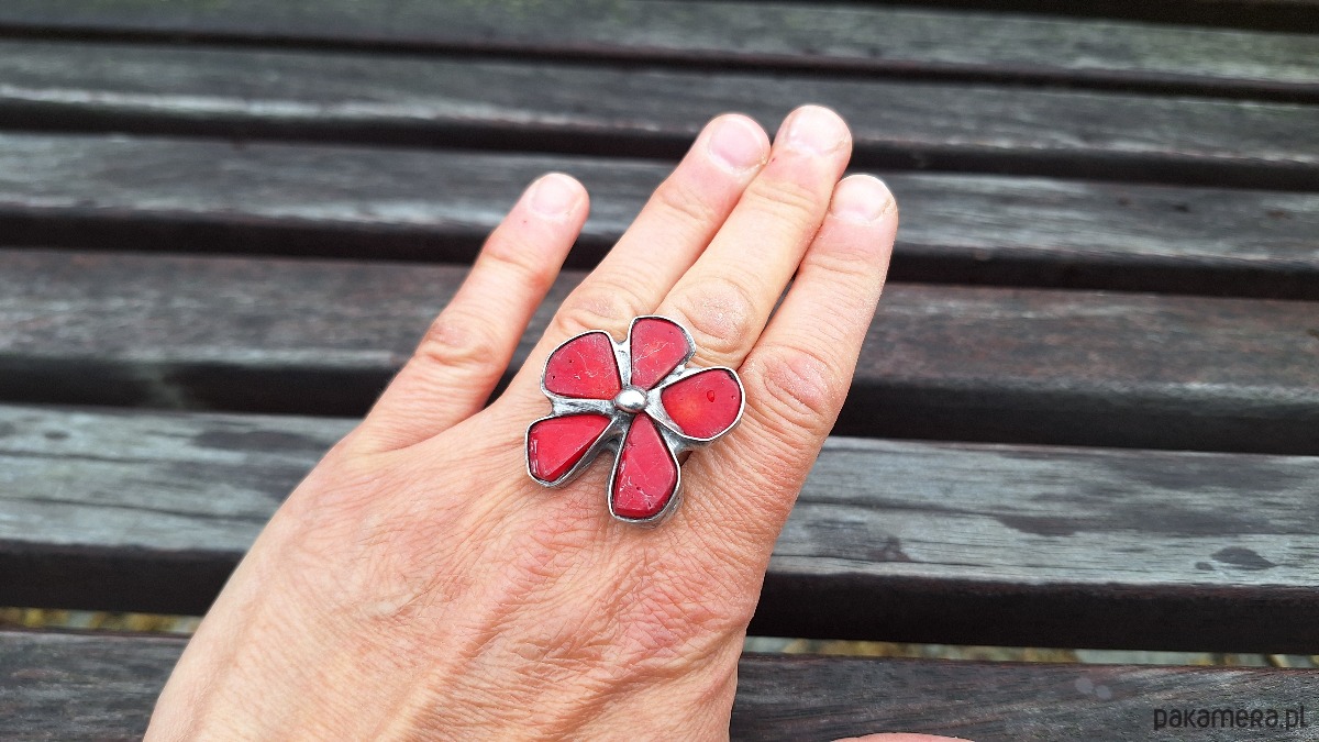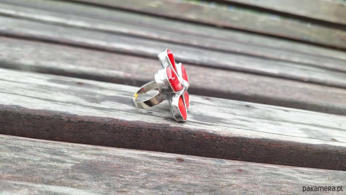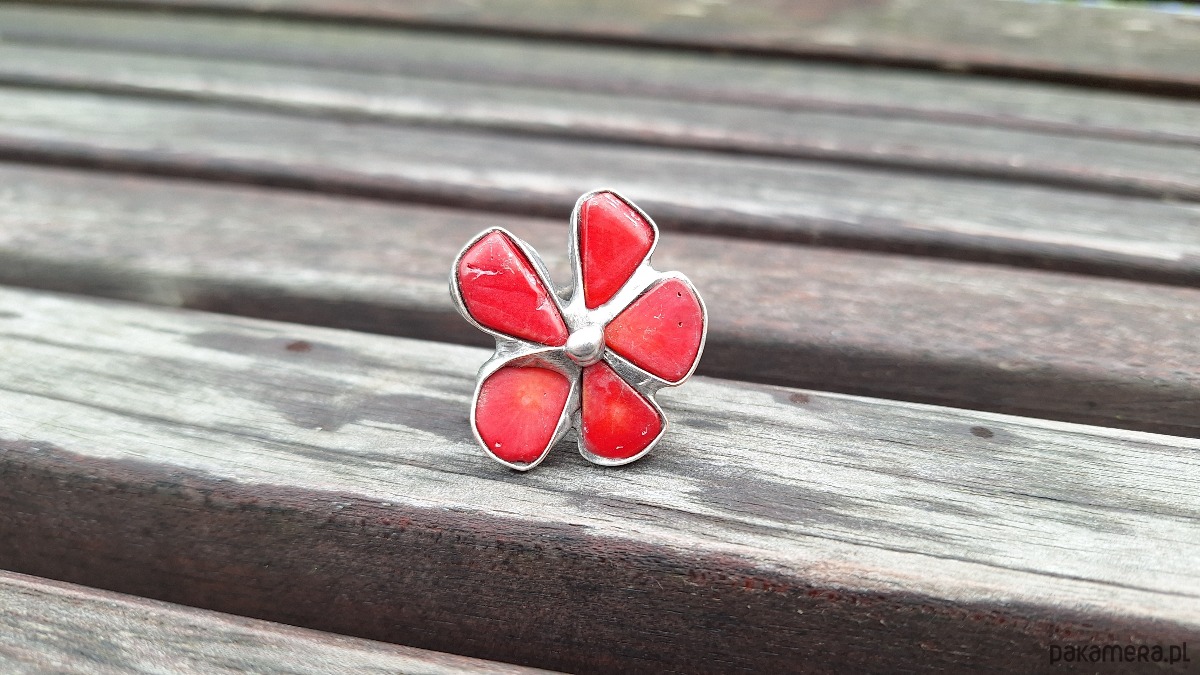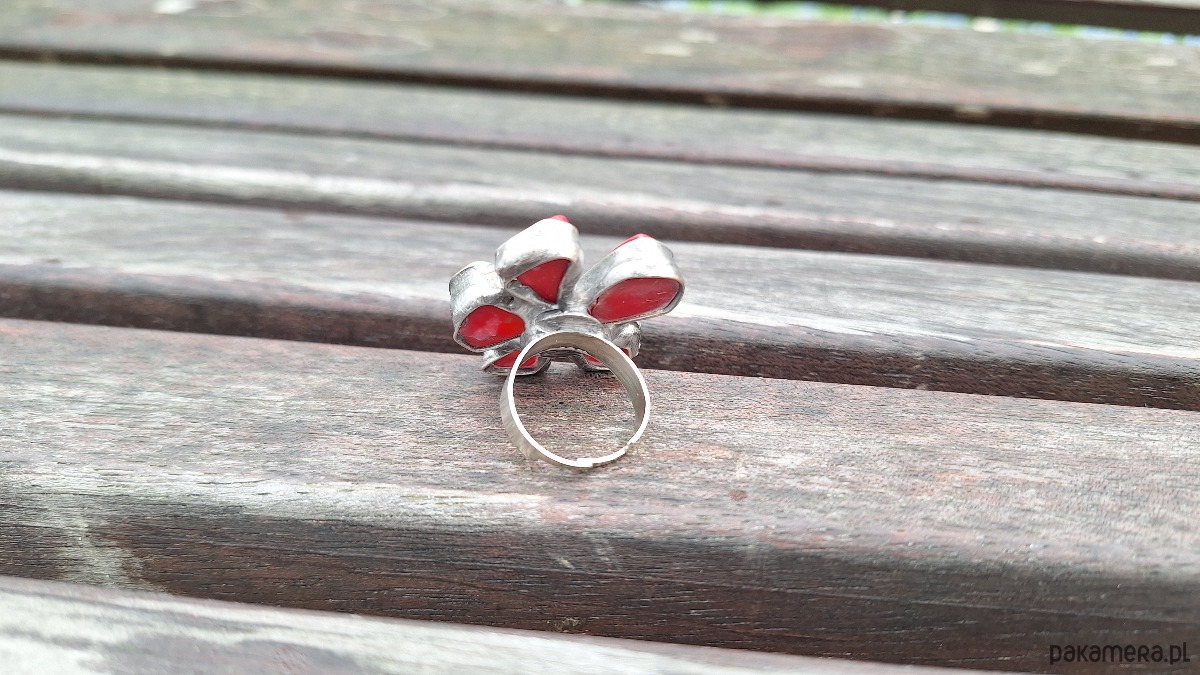 Pierścionek wykonany z miedzi, cyny i koralowców. Wymiary ok. 3 na 3 cm. Regulowany. Nie jest ciężki.