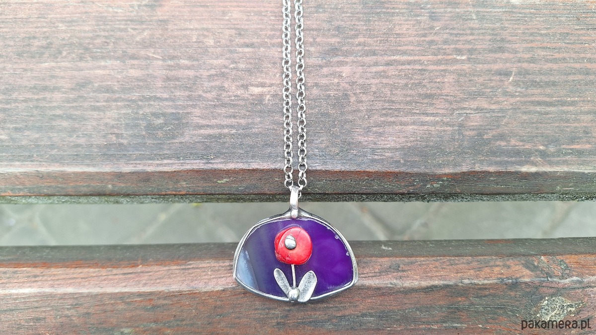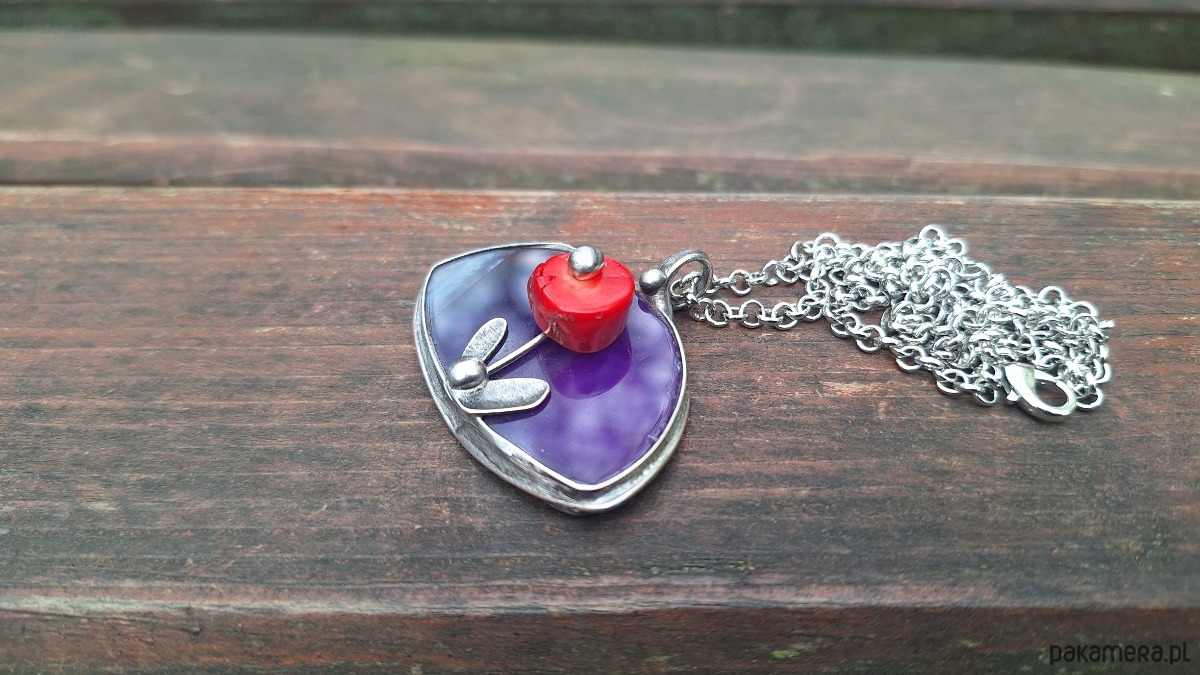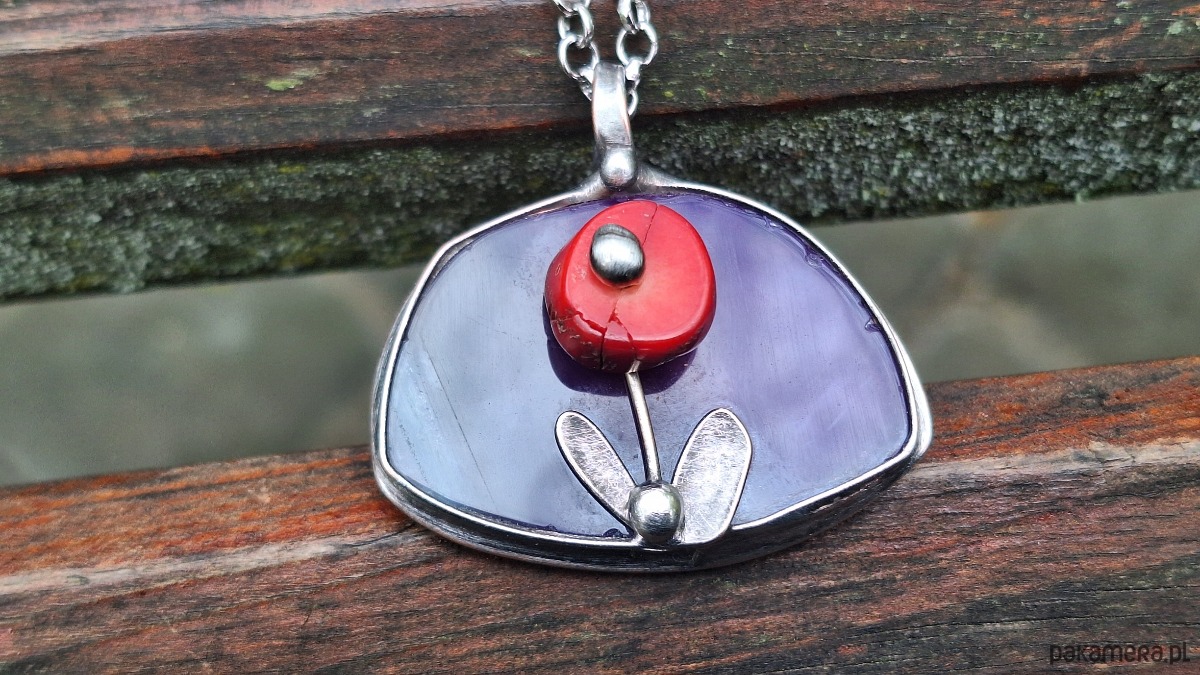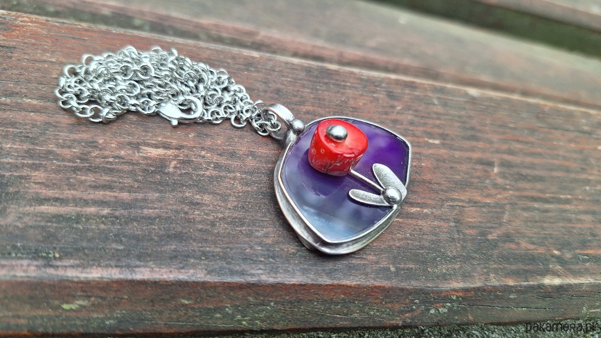 Wisiorek wykonany z miedzi, cyny, agatu i koralowca. Wymiary ok. 3 na 4 cm. Zawieszony na łańcuszku o długości ok. 50 cm.