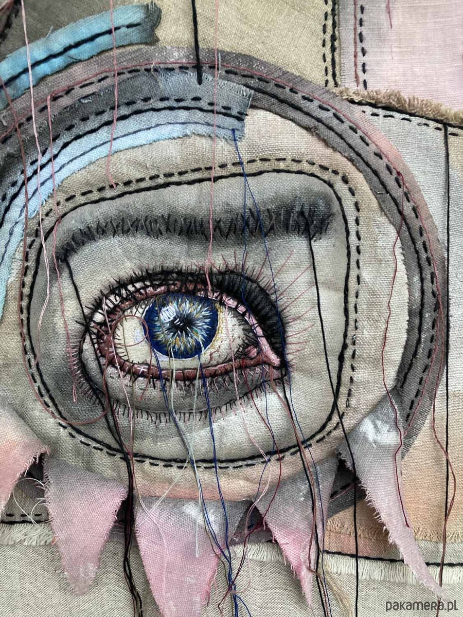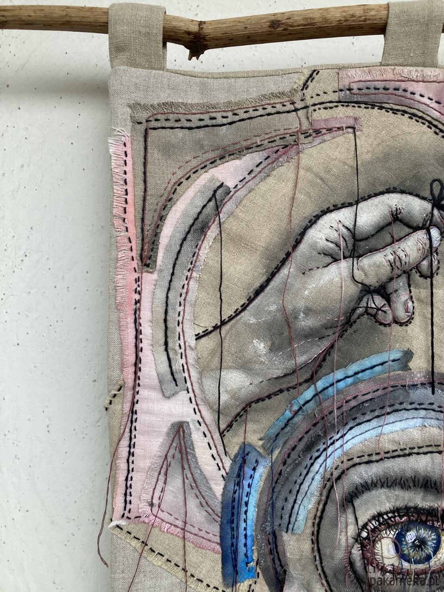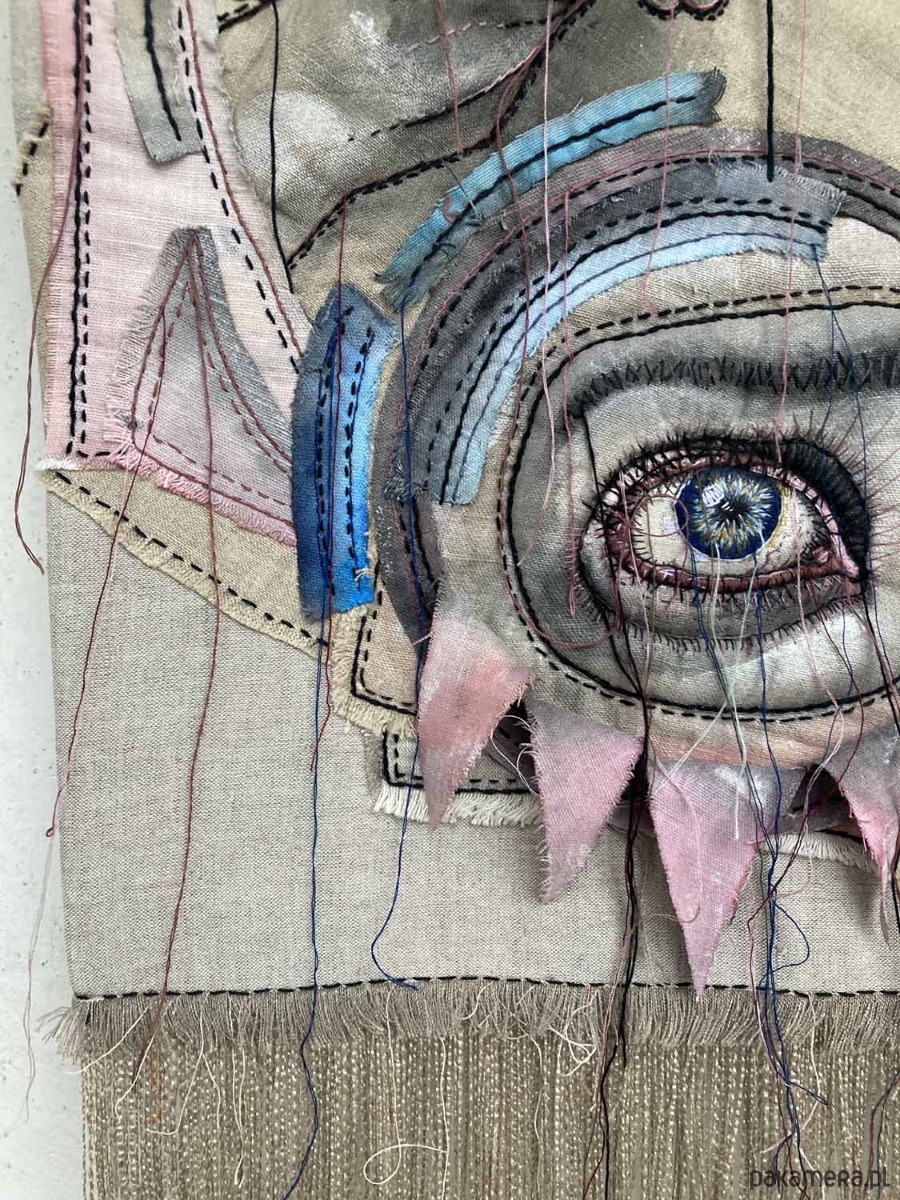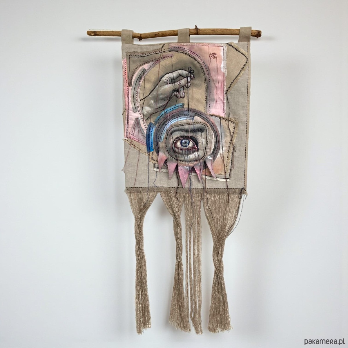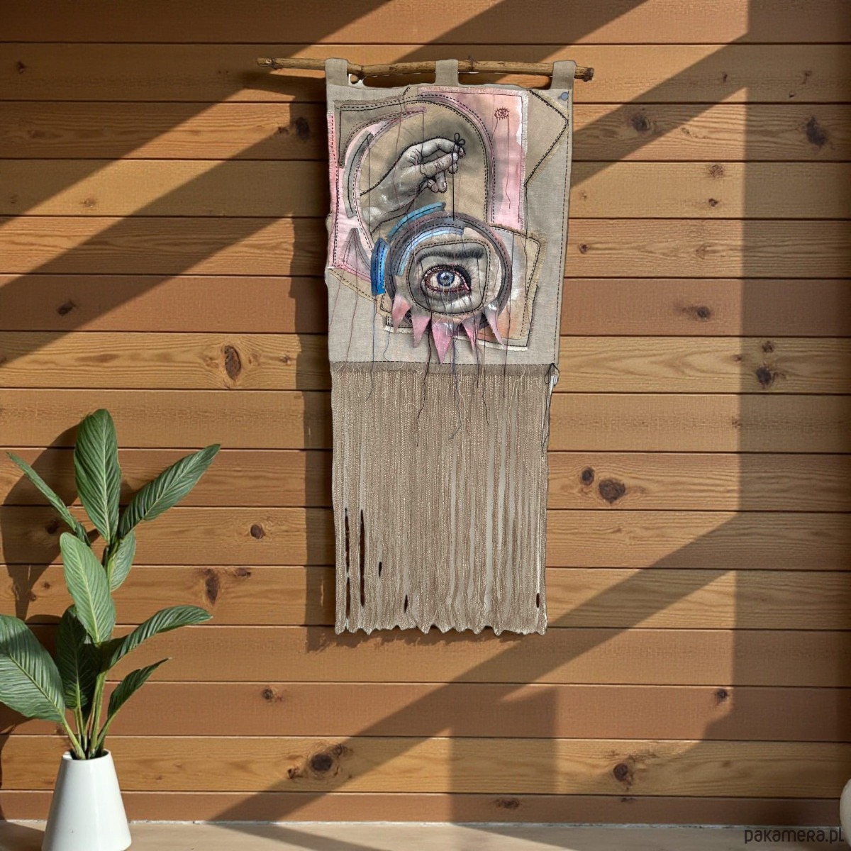 Nietuzinkową makatę na ścianę uszyłam z tkanin lnianych, pomalowałam farbami i ręcznie wyhaftowałam.