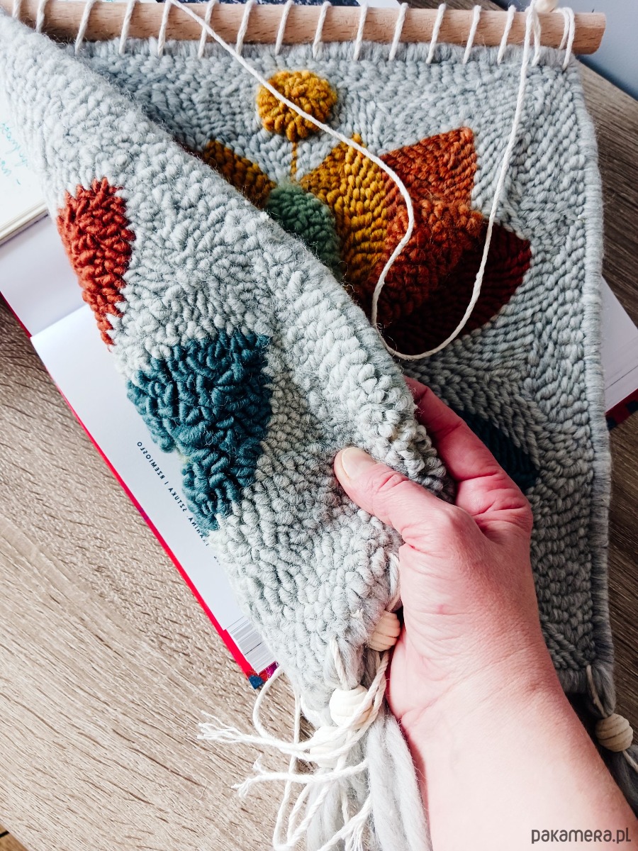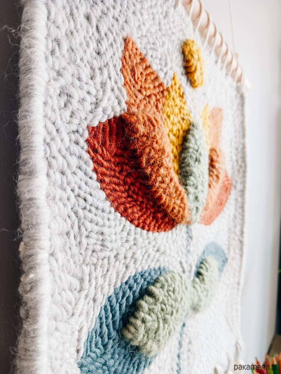 Wykonałam ją w technice punch needle (haftu pętelkowego) z wełnianej miękkiej włóczki. Aż się prosi by ją dotknąć i zanurzyć palce w pętelkach!