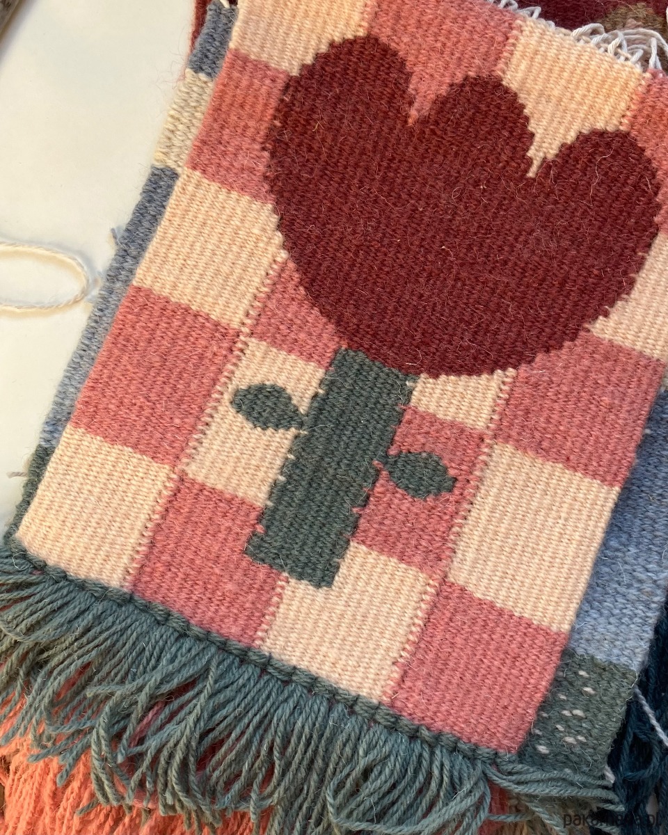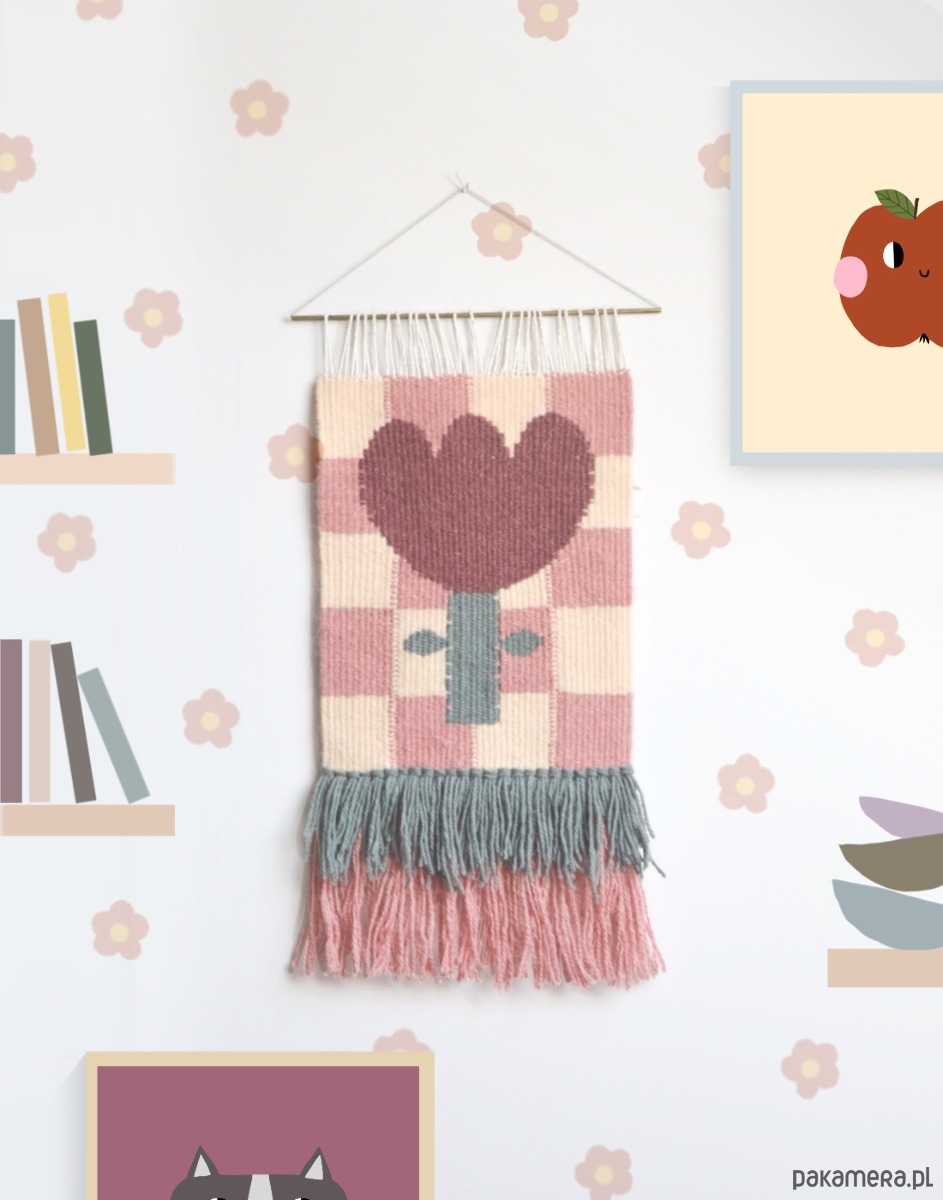 Makatka kwiatek utkana jest z użyciem starannie dobranej, wełnianej przędzy (osnowa z lnianej nici). Rozmiar bez sznurków do zawieszenia to 25 x 50 cm. Wysyłana gotowa do zawieszenia, standardowo z drewnianym patyczkiem lub dodatkowo, bardziej delikatnie i elegancko, na mosiężnej rurce.