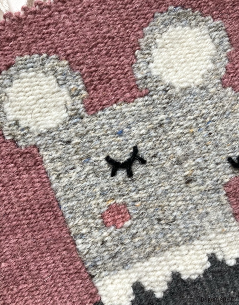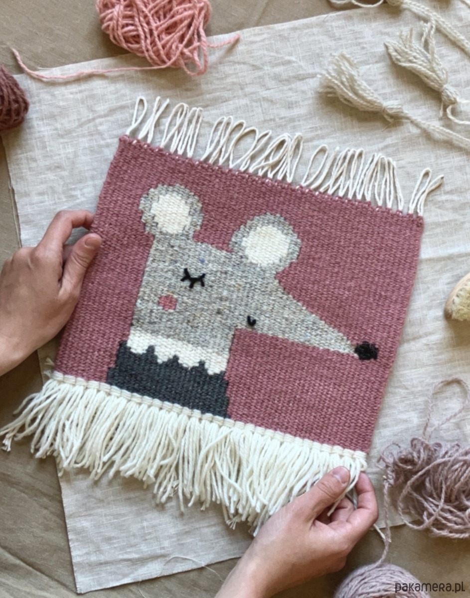 Makatka myszka utkana jest z użyciem starannie dobranej, wełnianej przędzy (osnowa z lnianej nici). Rozmiar bez sznurków do zawieszenia to 29 x 28 cm. Wysyłana gotowa do zawieszenia, standardowo z drewnianym patyczkiem lub dodatkowo, bardziej delikatnie i elegancko, na mosiężnej rurce.