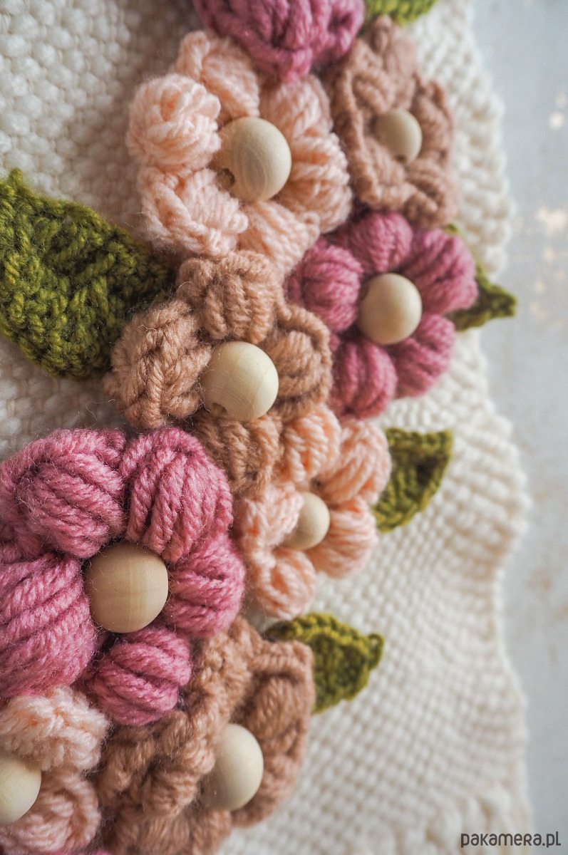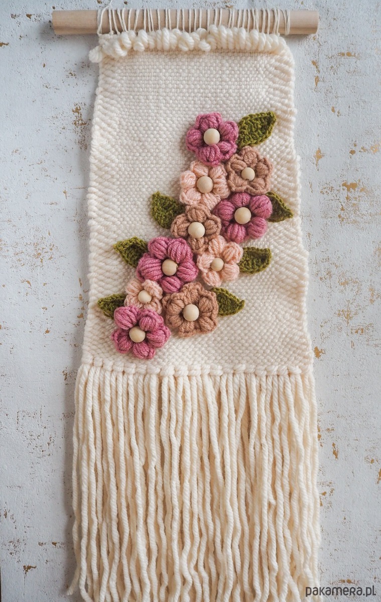 Wyjątkowa ozdoba ścienna "Flora" to połączenie krosna tkackiego i szydełka. Wymiary 30 cm x 70 cm.
