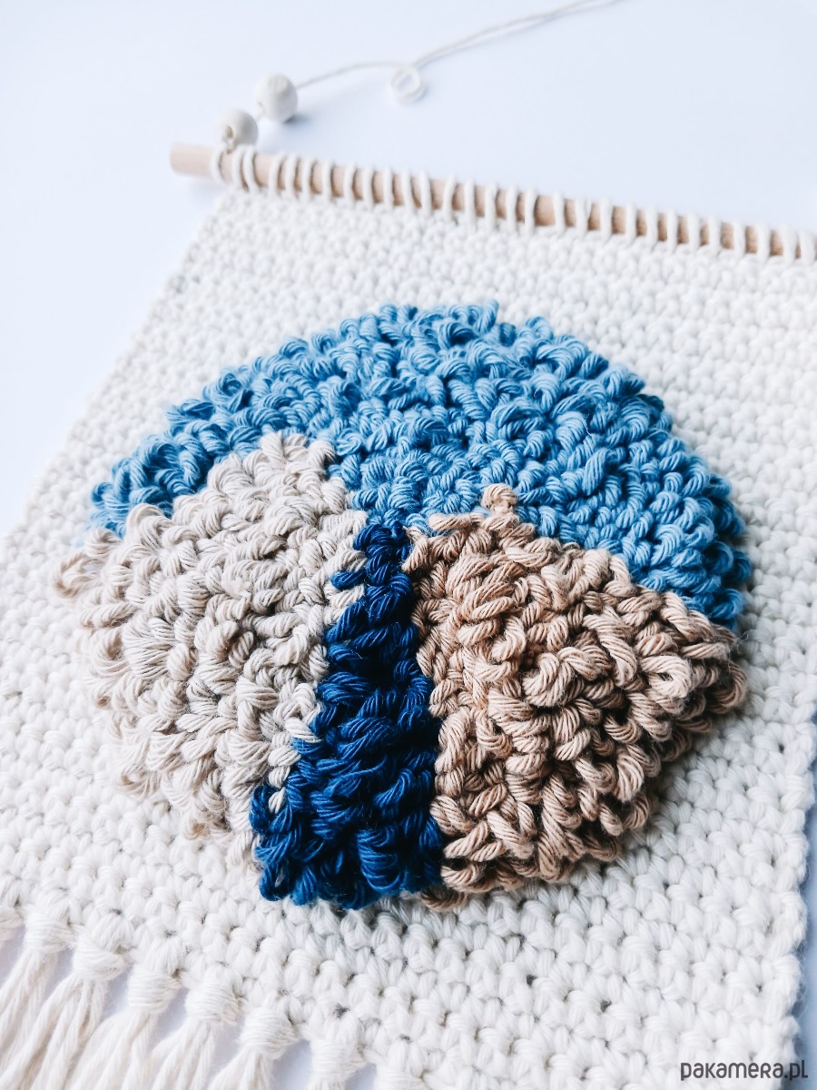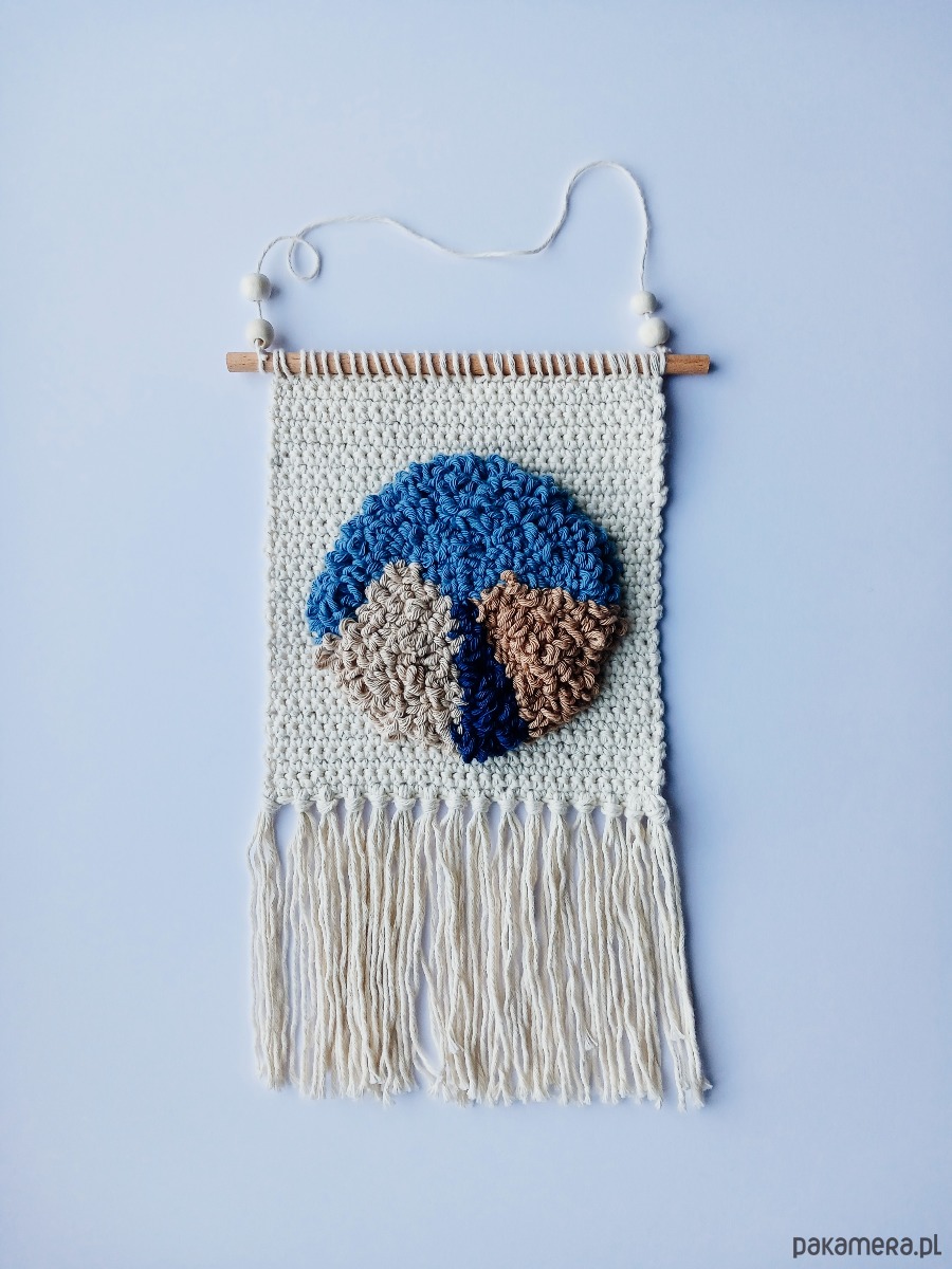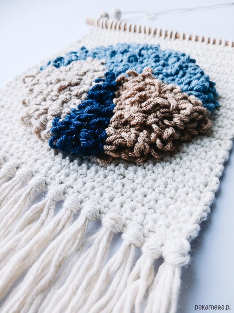 Wydziergałam ją na szydełku z bawełnianej włóczki najlepszej jakości, ozdobiłam panelem wykonanym w technice haftu pętelkowego i frędzlami. Umieściłam na toczonym, naturalnym wałku.