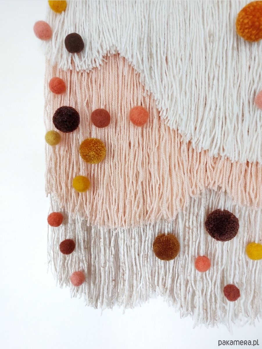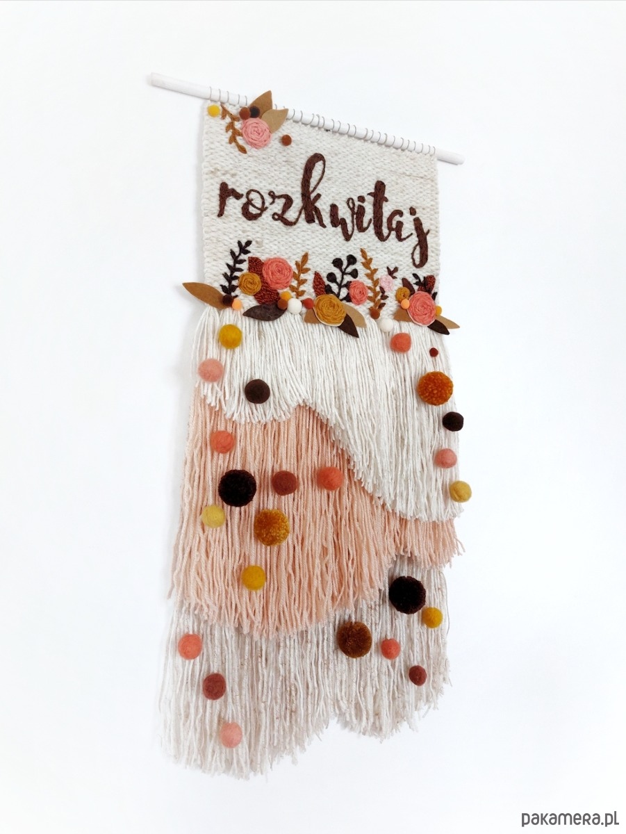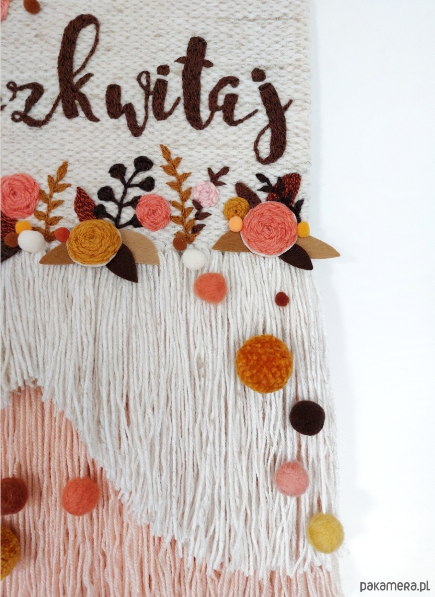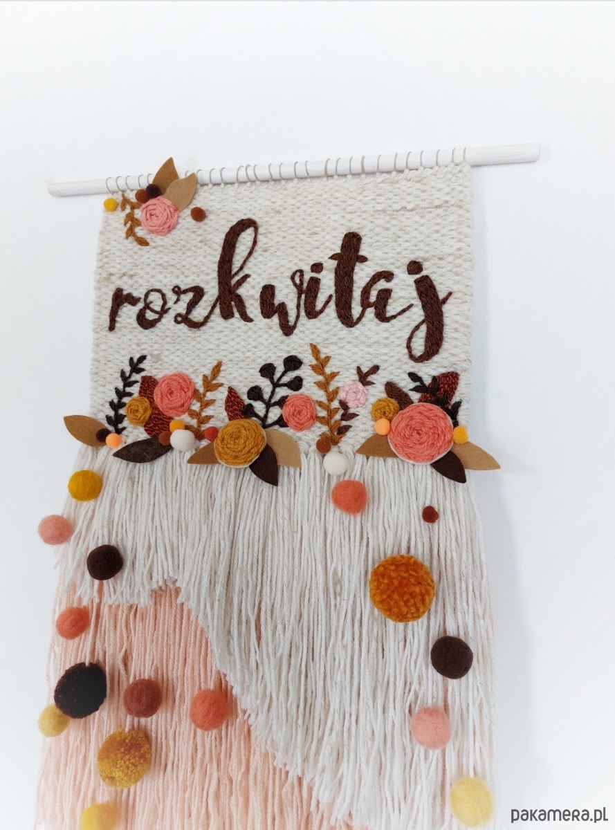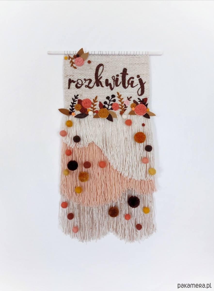 Ta makatka to wyjątkowa dekoracja ścienna, która nada charakteru każdemu wnętrzu. Makatka to 100 % tkane i wyszywane rękodzieło, autorskiego projektu. Całość zawieszona jest na drewnianym wałeczku .