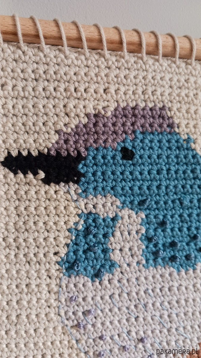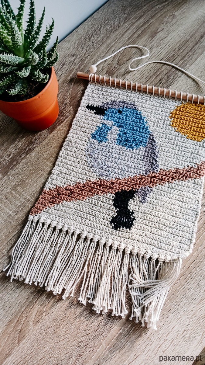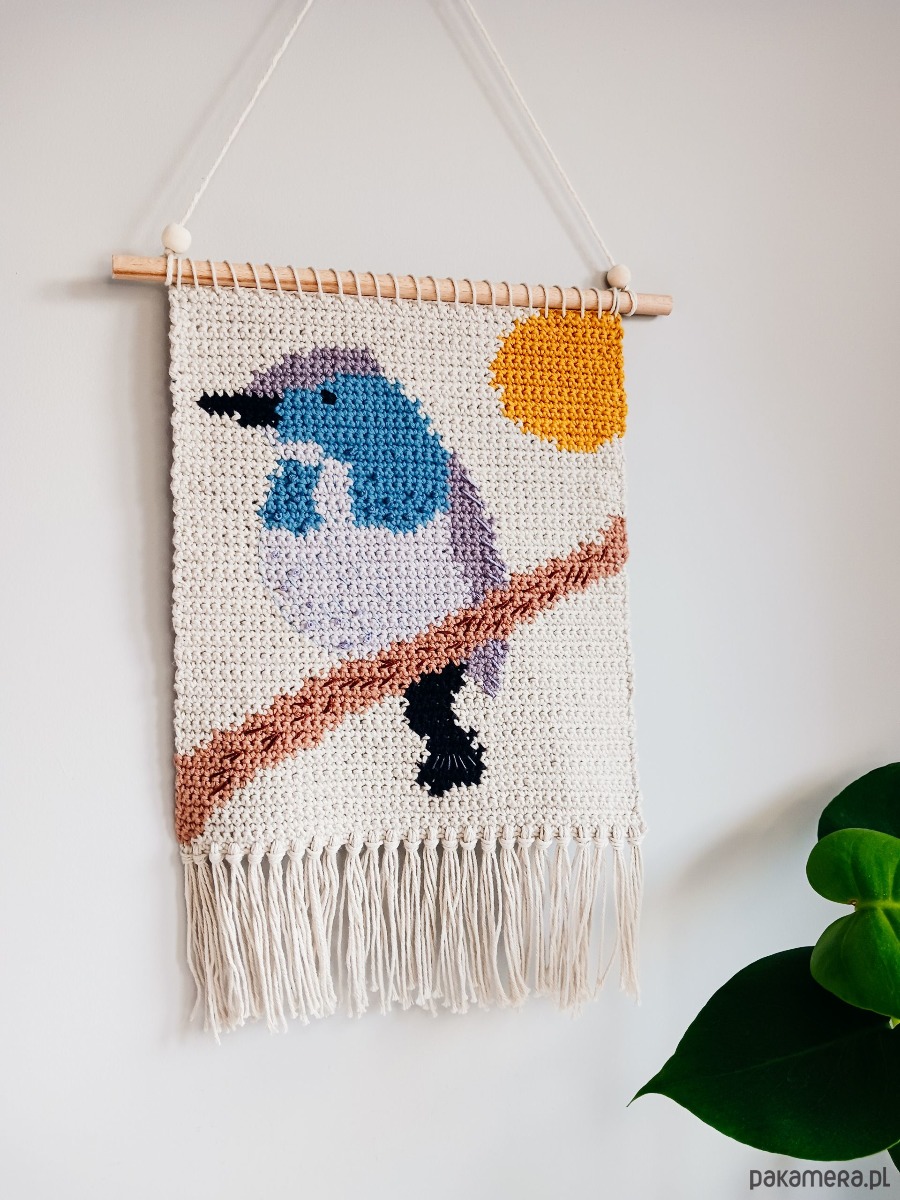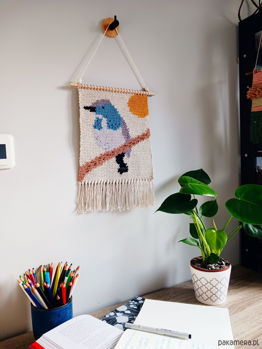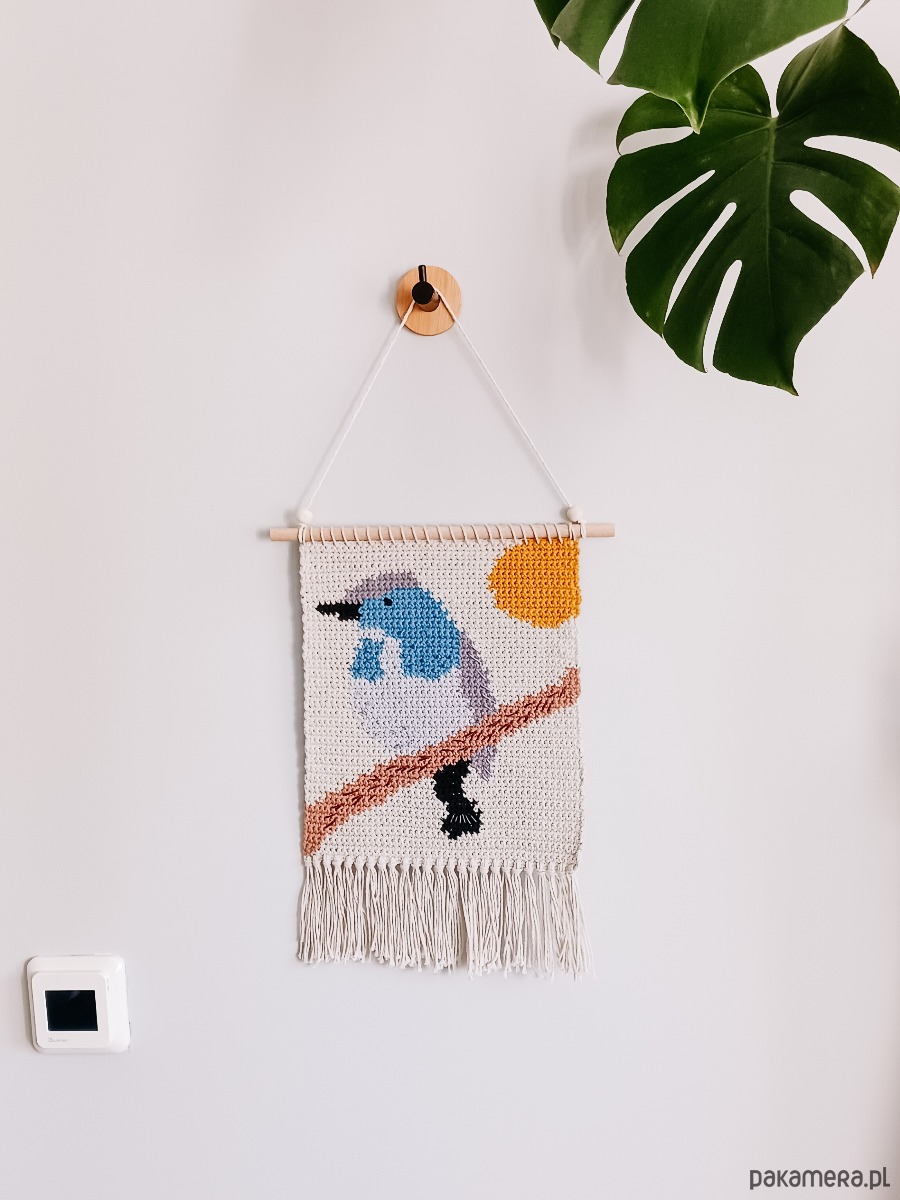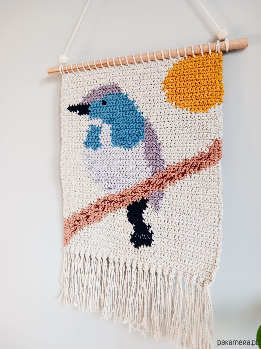 Makatka będzie niebanalną ozdobą ściany w salonie, sypialni, pracowni, czy na zadaszonej werandzie. To oryginalny prezent dla osoby ceniącej rękodzieło, kochającej naturę i ptaki. Ozdobi również pokój dziecięcy.