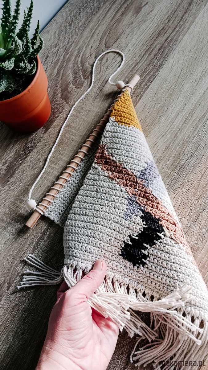 Korzystam z samodzielnie opracowanego wzoru, jednak ponieważ jest to praca ręczna Twoja makatka może się odrobinę różnić od tej na zdjęciach w ofercie. Nie dotyczy to użytej włóczki, czy elementów wzoru, ale np. naturalnego patyka (nie ma dwóch identycznych) lub wymiarów (do 0,5 cm różnicy).
