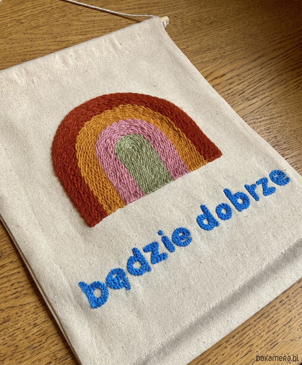 Makatka z tęczą utkaną metodą punch needle na kremowej bawełnie (100%).