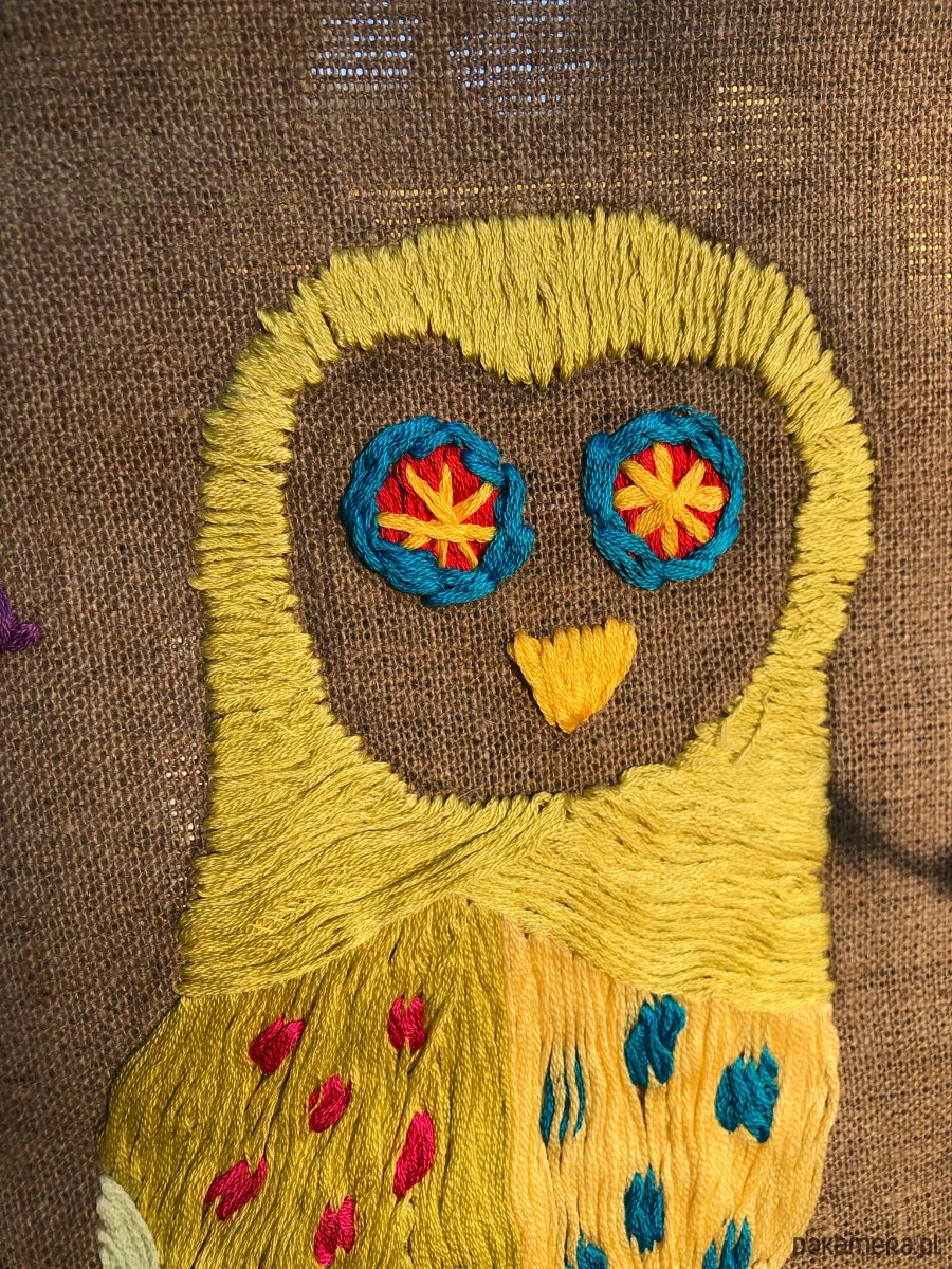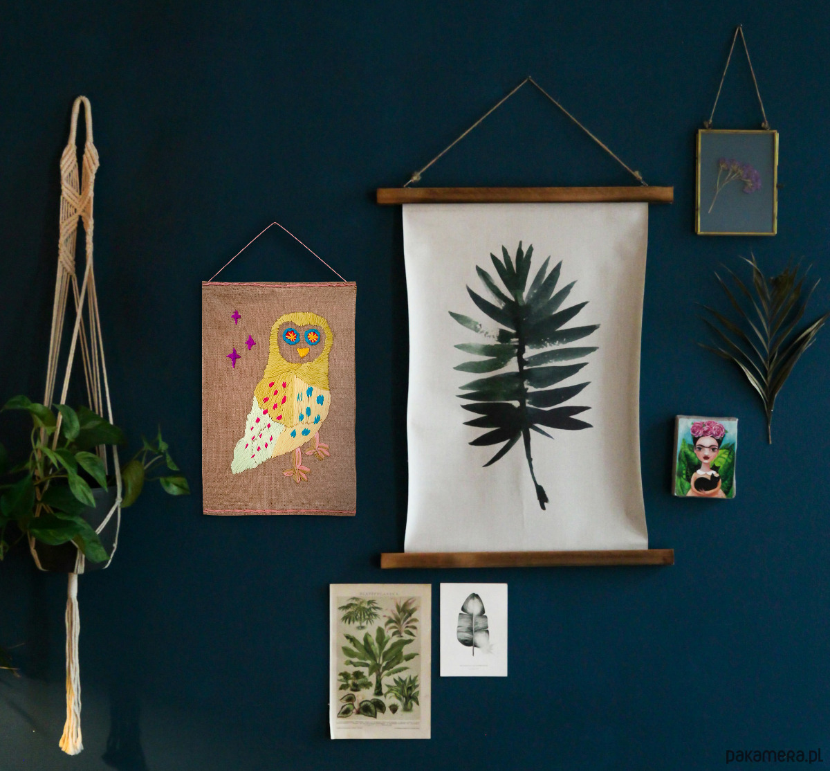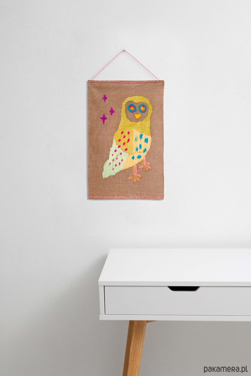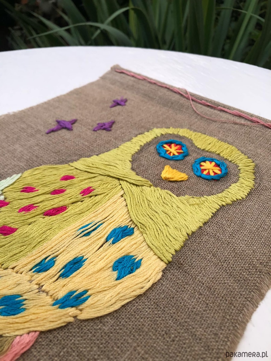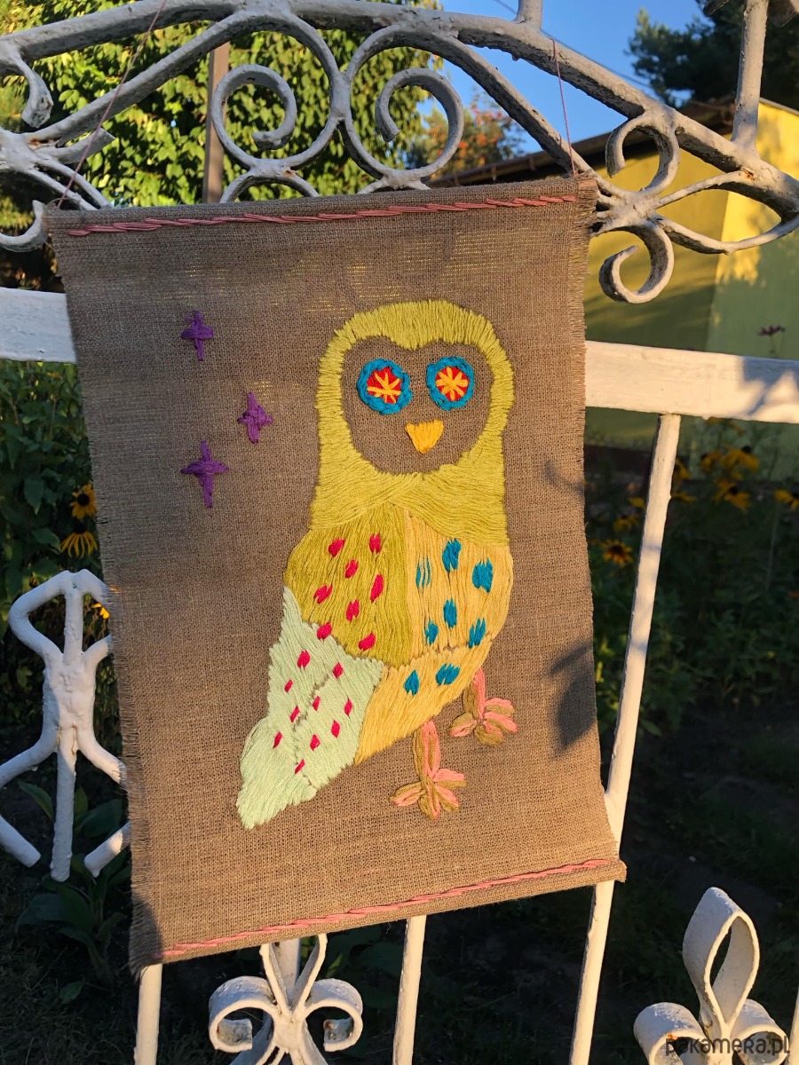 Ręcznie haftowane zwierzęta na surowym płótnie, w formie proporczyka - makatki. Dekoracja ścienna by Warsaw Birds. Różnokolorowe muliny, mienią się w słońcu.