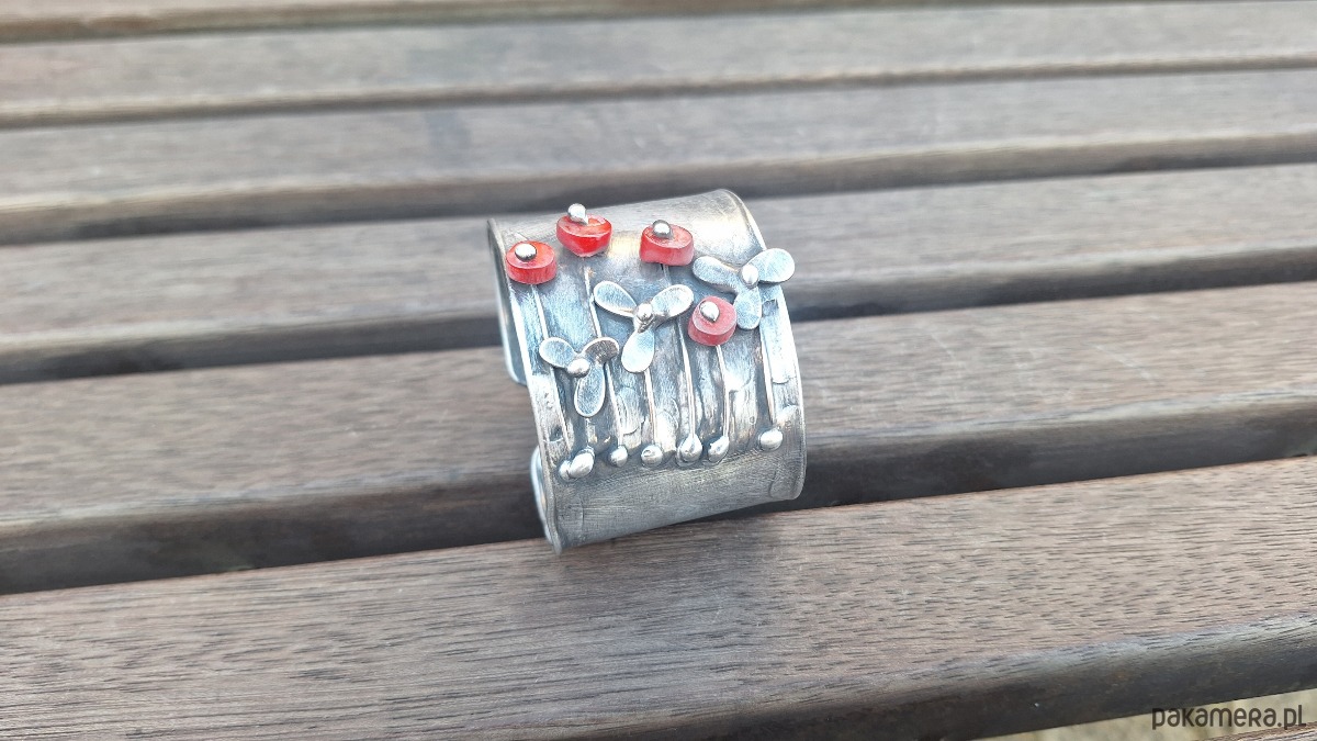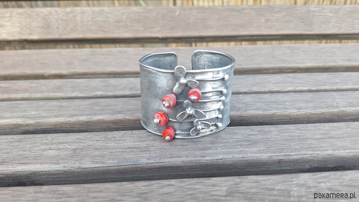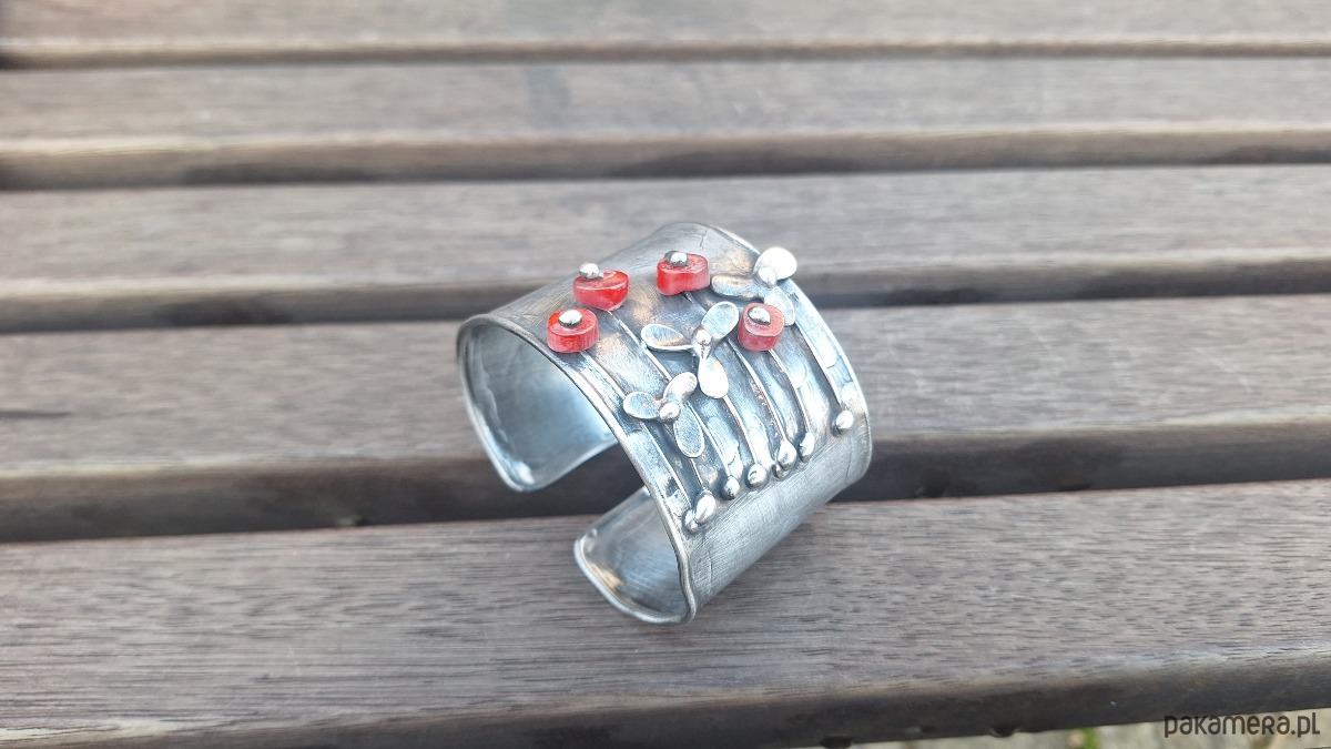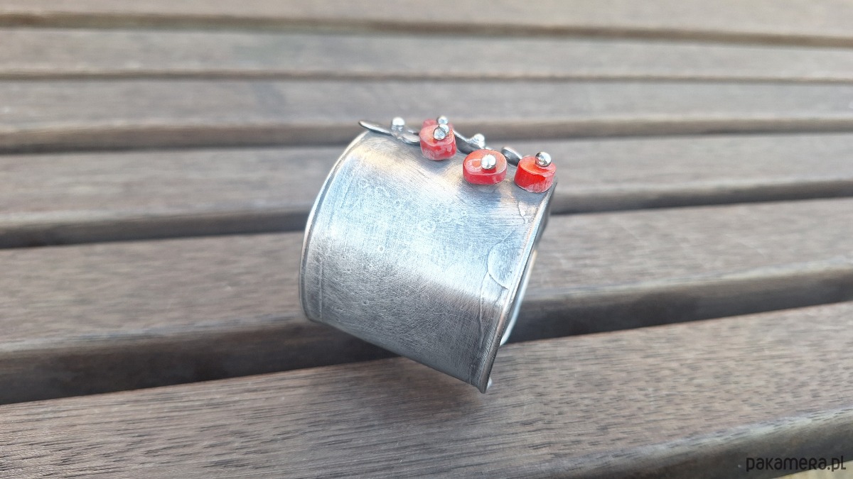 Bransoletka wykonana z miedzi, cyny i koralowców. Szerokość 4.3 cm. Regulowana.