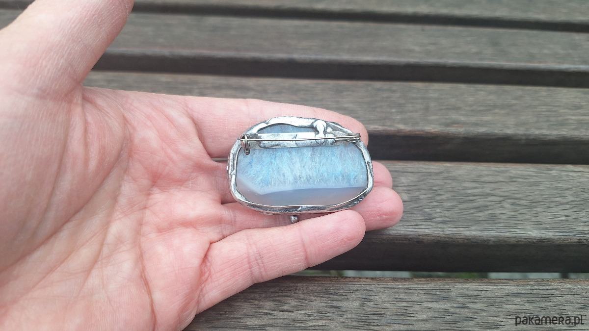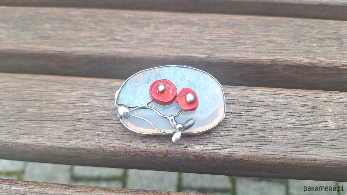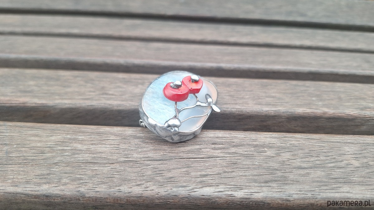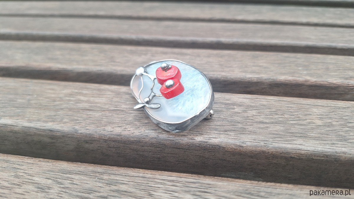 Broszka wykonana z miedzi, cyny, koralowców i agatu. Wymiary ok. 5 na 3 m. Zapięcie metalowe.