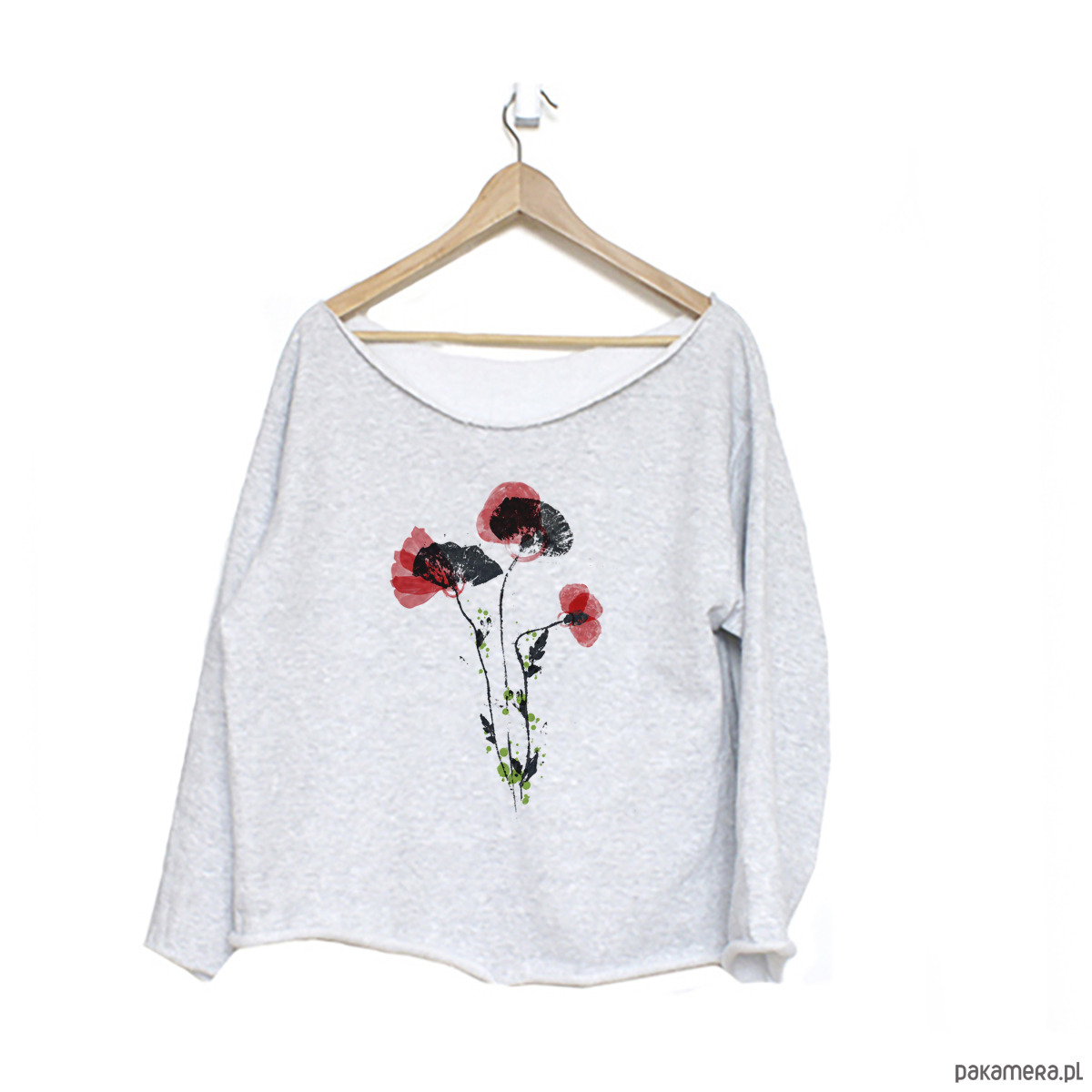 Nadruk cyfrowy. Szeroki dekolt odkrywający ramię. Cięte wykończenie dekoltu, rękawów i dołu bluzy.