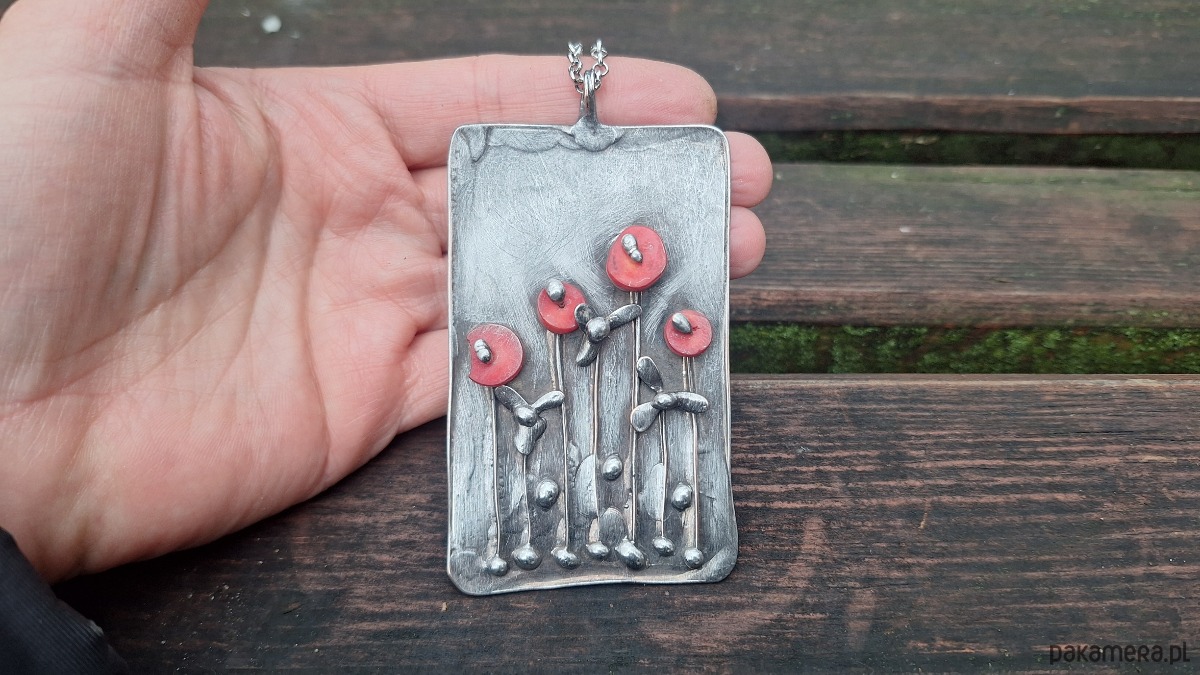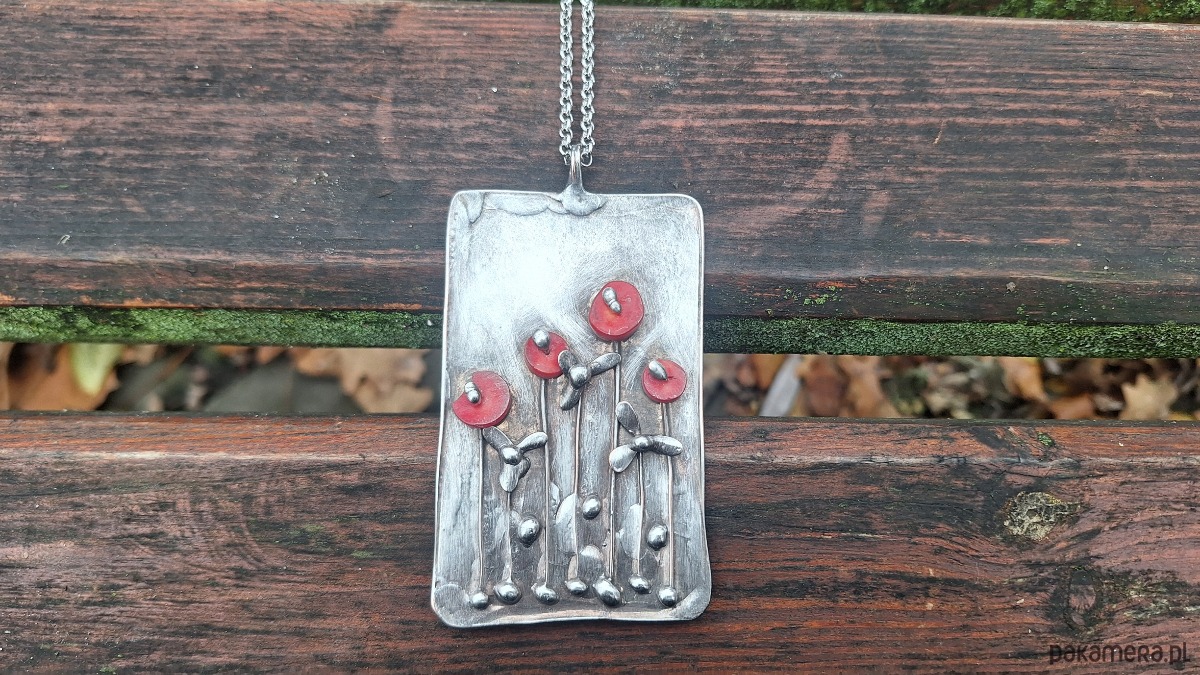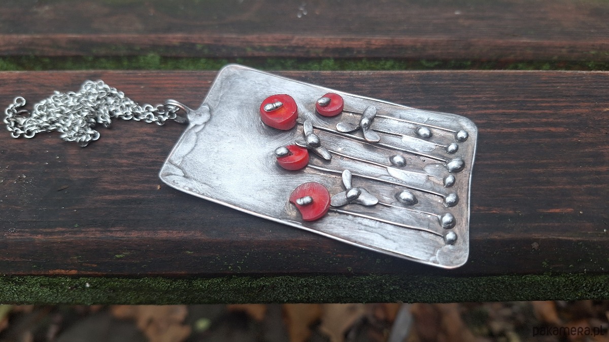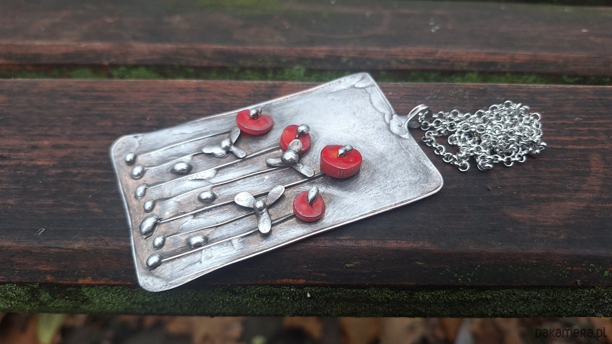 Wisiorek wykonany z miedzi, cyny i koralowców. Wymiary ok. 8.5 na 5 cm. Zawieszony na łańcuszku o długości ok. 50 cm.